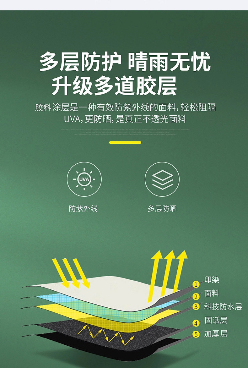 【产品材质】面料防水防晒涂银涤纶布,底账牛津布。