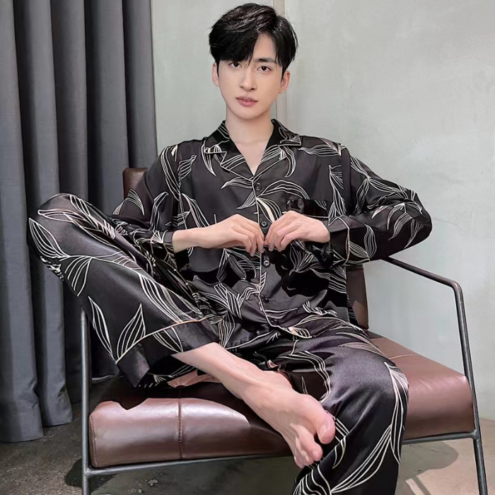 2024 새로운 봄과 여름 얇은 실크 아이스 파자마 남성용 자카드 카디건 긴 소매 바지 플러스 사이즈 홈 웨어