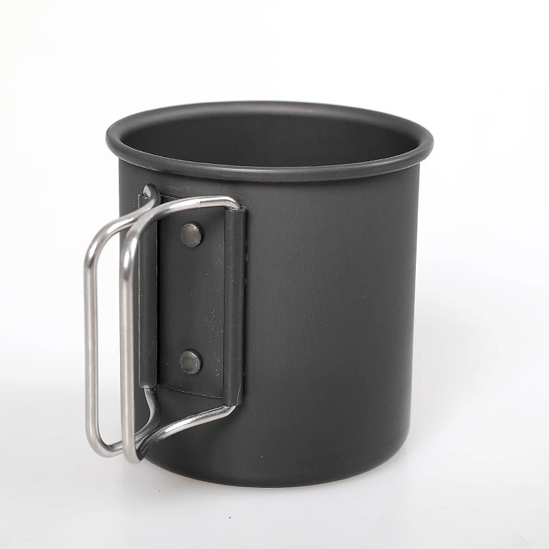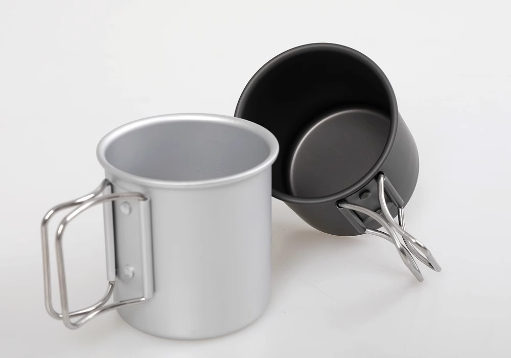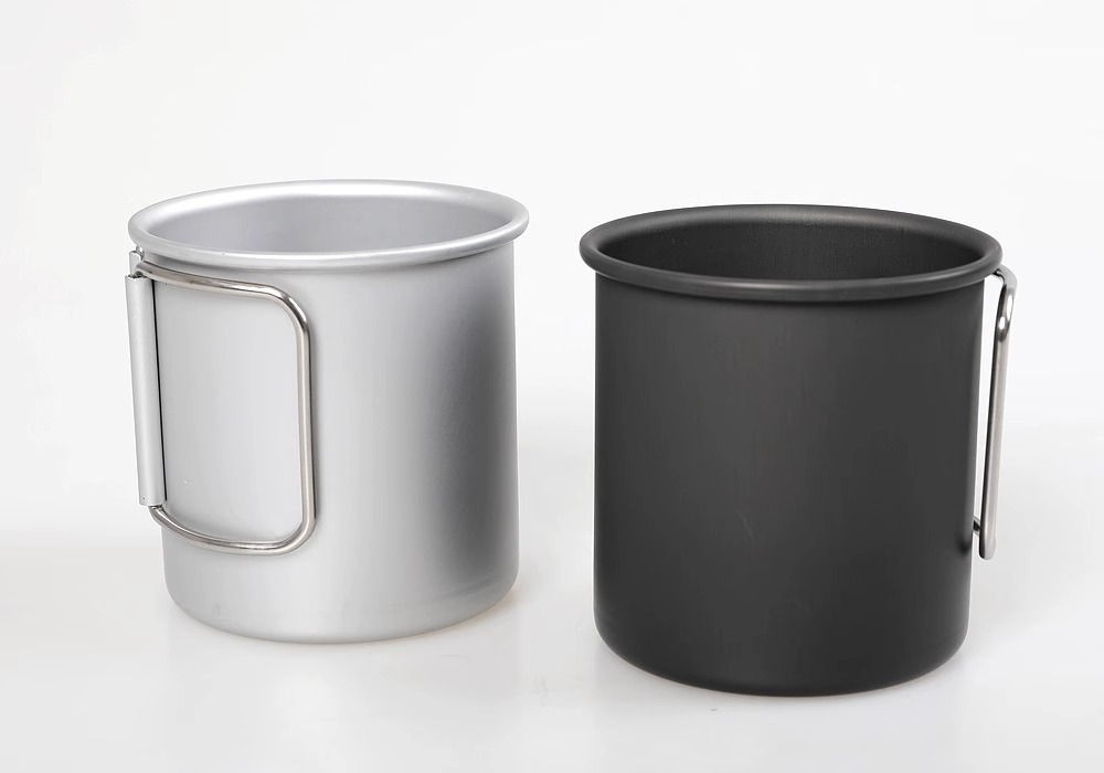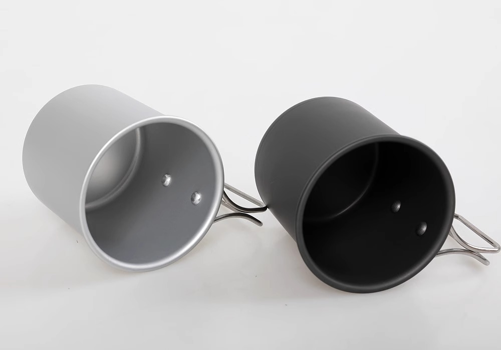 水杯的材质是5052铝合金,工艺是硬质氧化铝,银色水杯是普通氧化铝,黑色水杯是硬质氧化铝,(硬质氧化的工艺用时长,硬度更高,抗腐蚀能力更强)手柄为不锈钢材质,整套水杯无任何涂层,材质通过食品级检测,可加热使用。