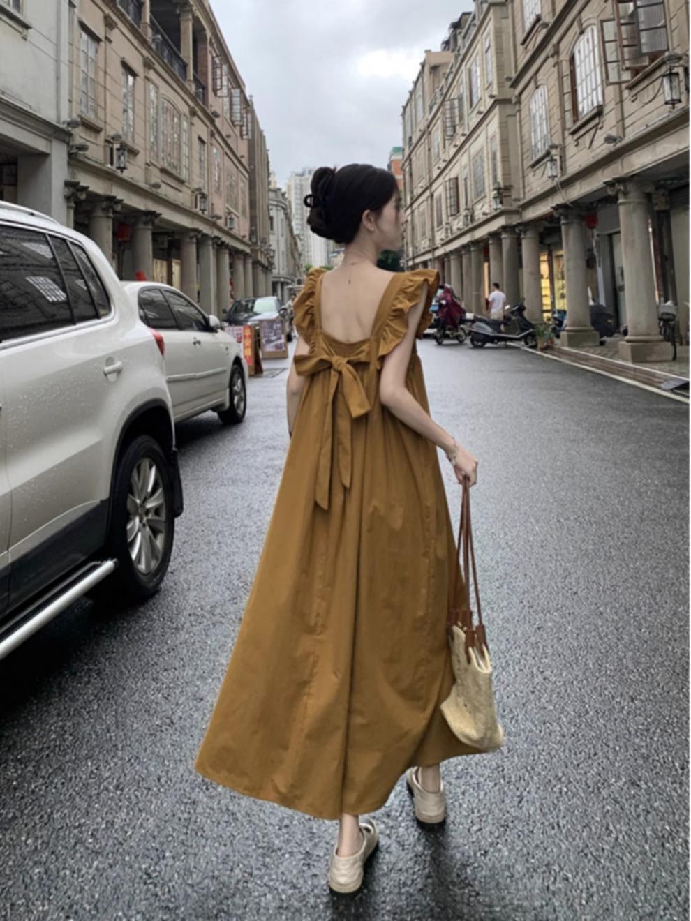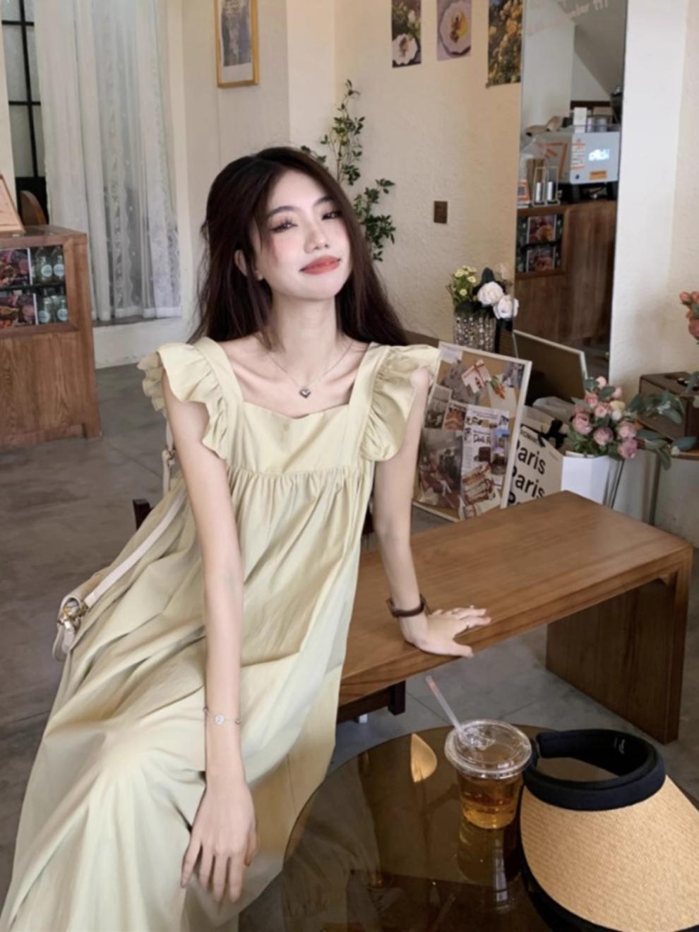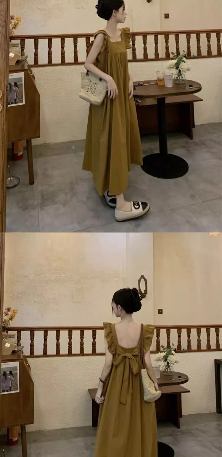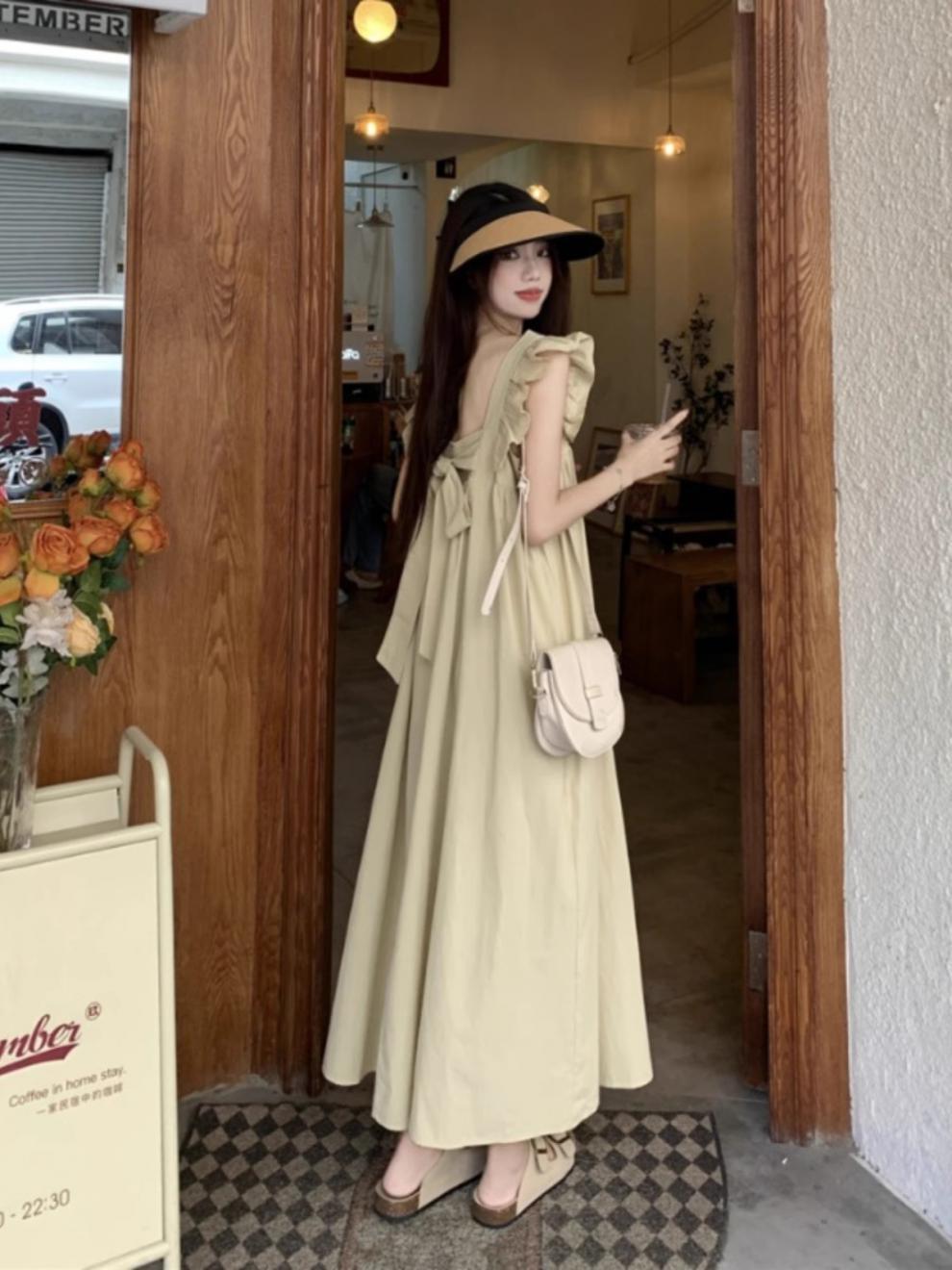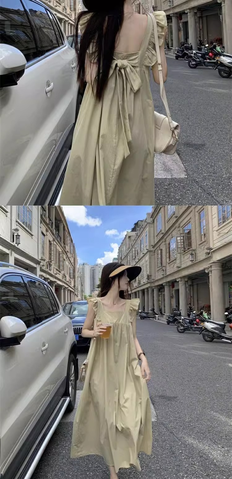 활 스트랩 백리스 스커트 해변 스커트 여성 프랑스 스타일 우아한 스퀘어 넥 플라잉 슬리브 원피스 홀리데이 스타일 롱 스커트