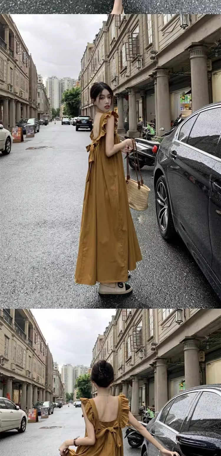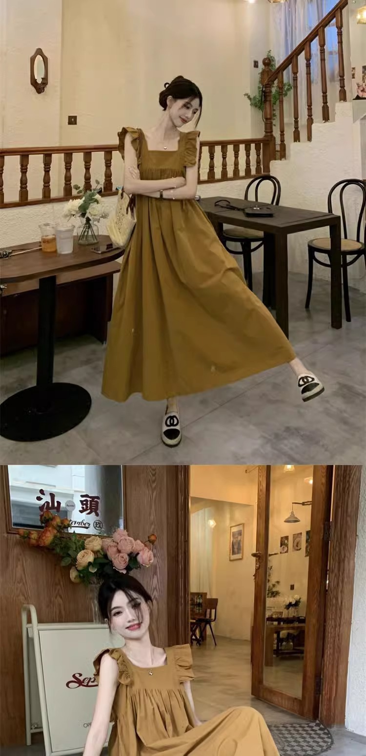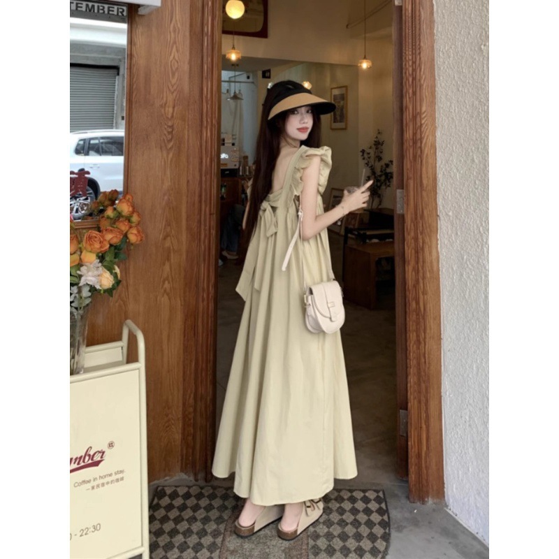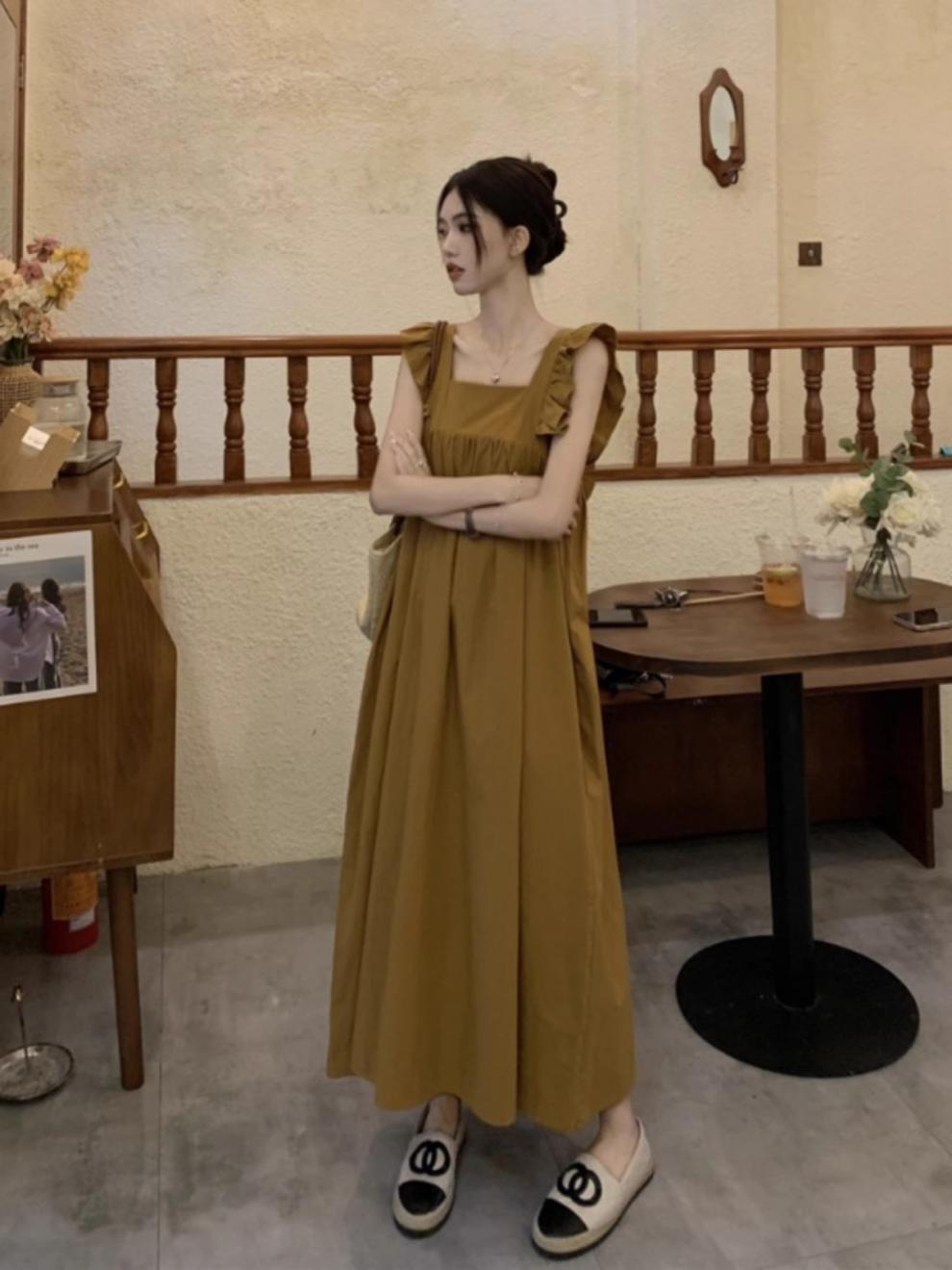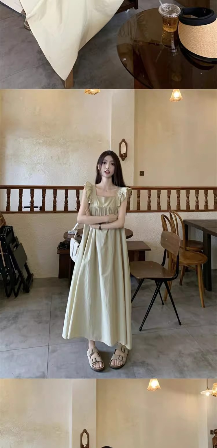 활 스트랩 백리스 스커트 해변 스커트 여성 프랑스 스타일 우아한 스퀘어 넥 플라잉 슬리브 원피스 홀리데이 스타일 롱 스커트