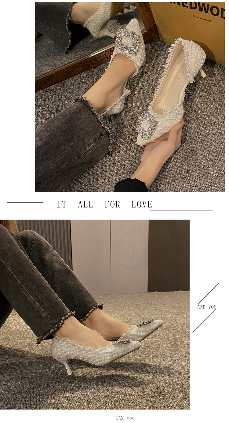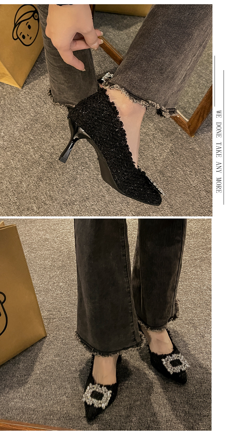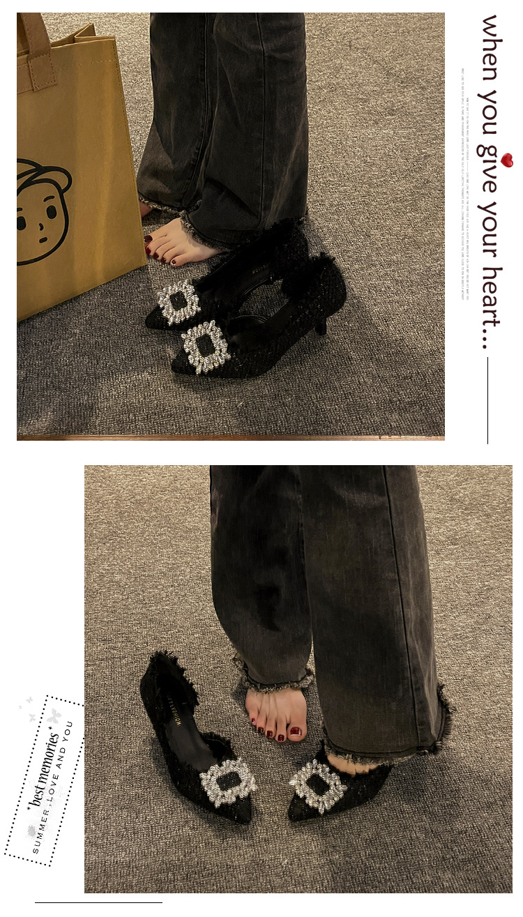 하이힐 여성 틈새 디자인 프렌치 포인티드 슈즈 2024 여름 신상 스틸레토 힐 작은 향기로운 모조 다이아몬드 슈즈스토어 가기