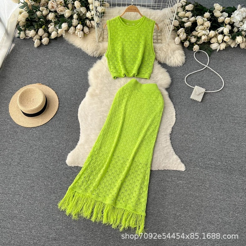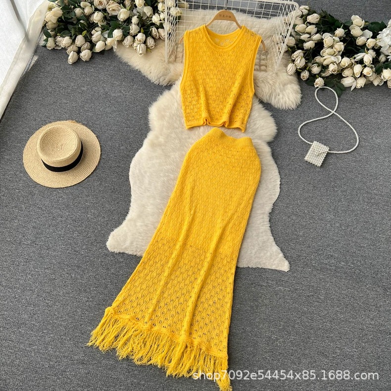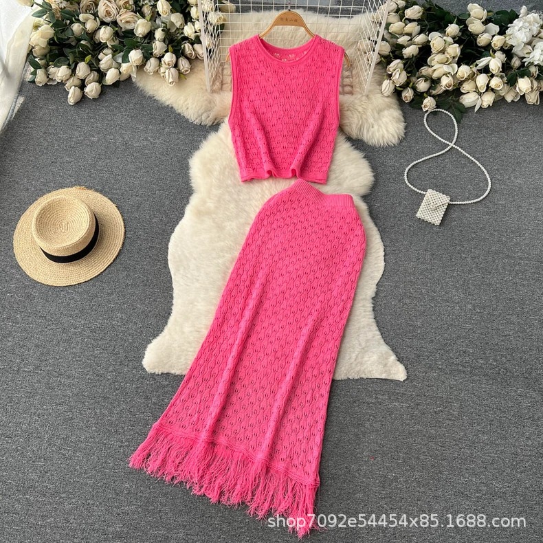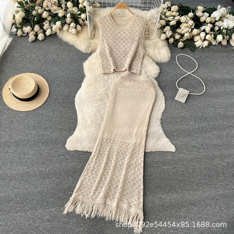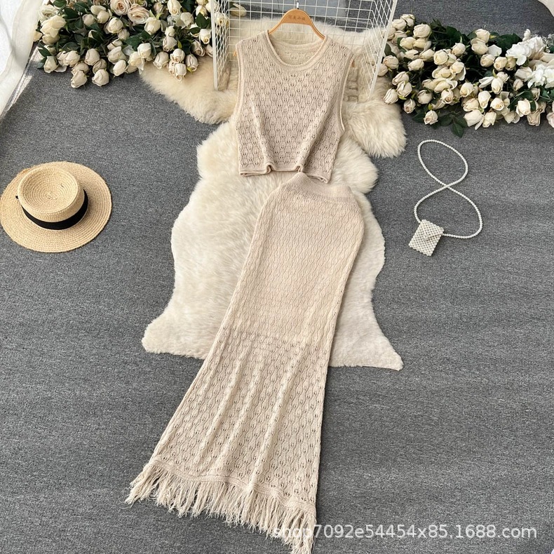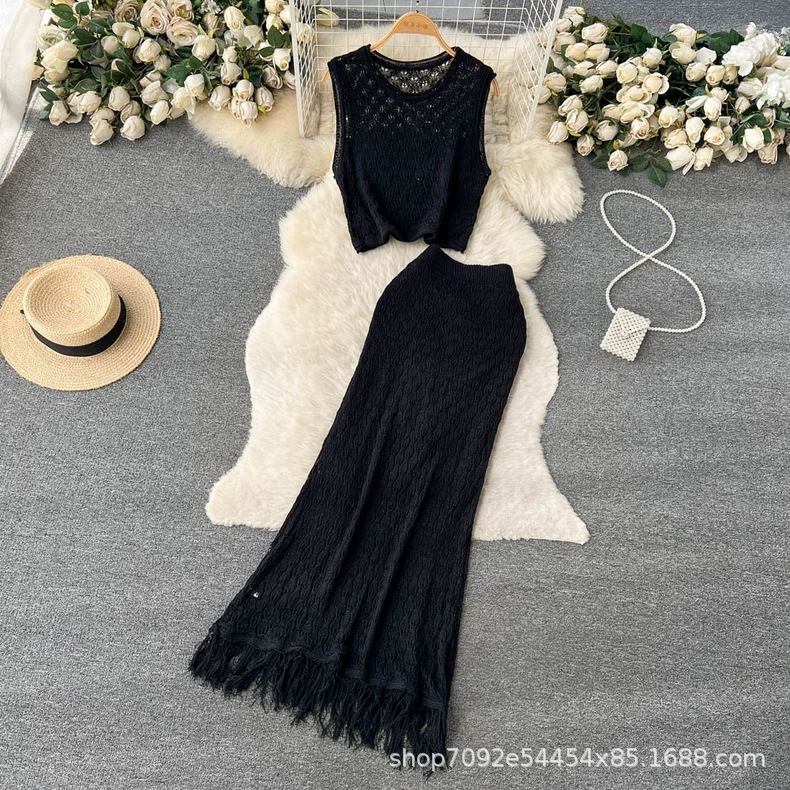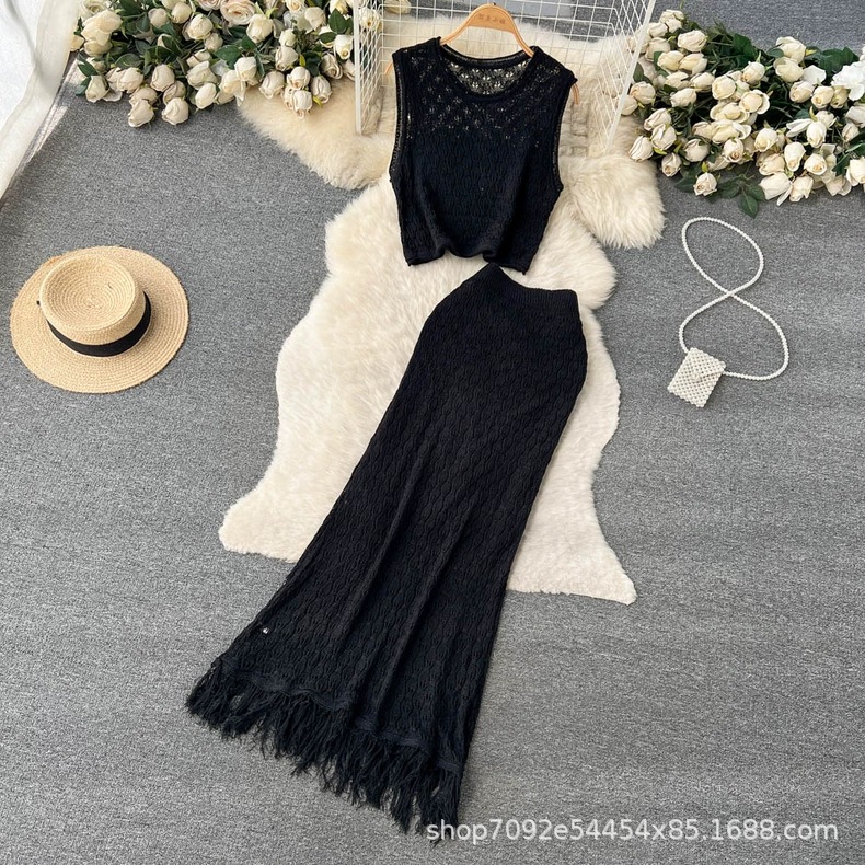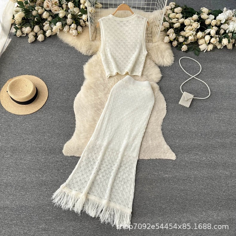 부드러운 스타일의 중공 아웃 세트 여성 여름 라운드 넥 민소매 상단 중간 길이의 술 덮개 스커트 투피스 세트스토어 가기