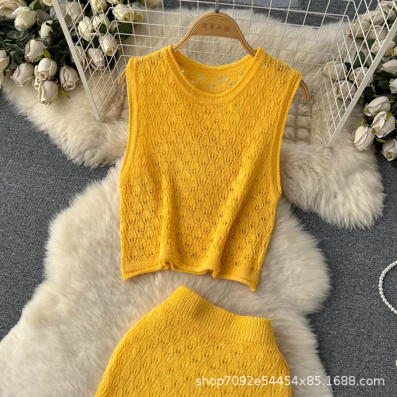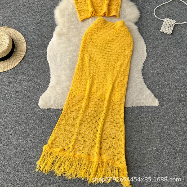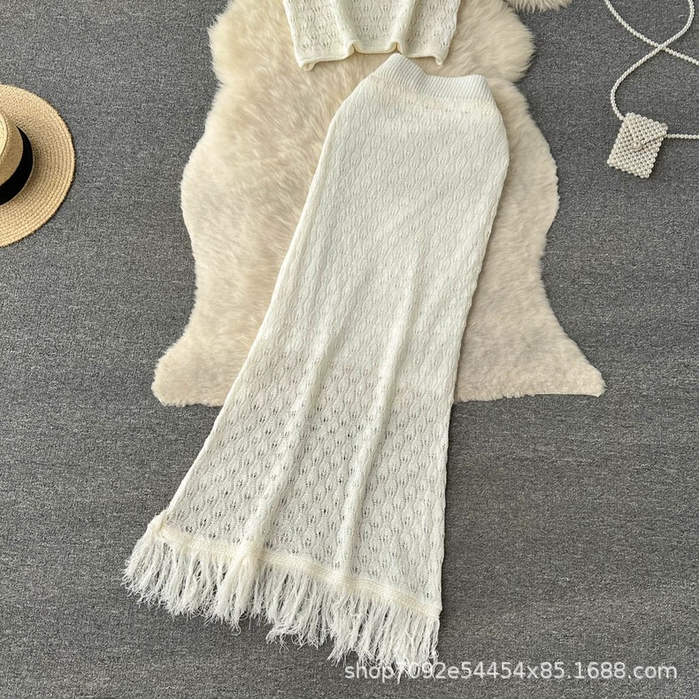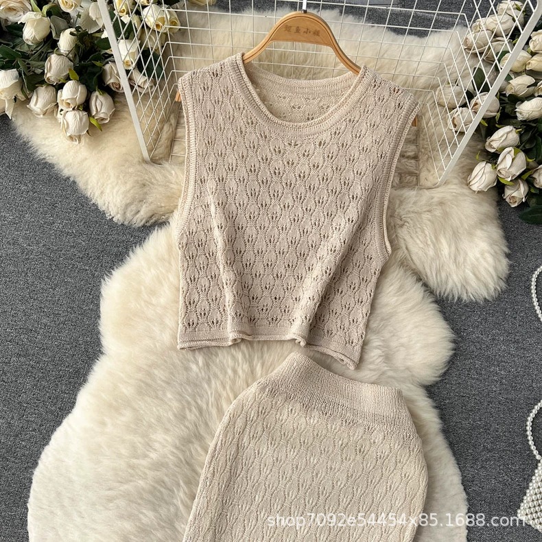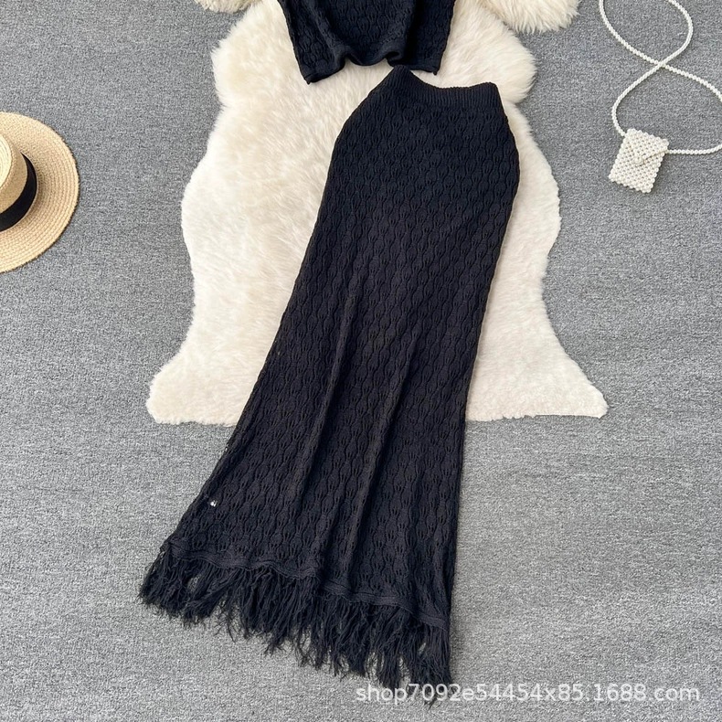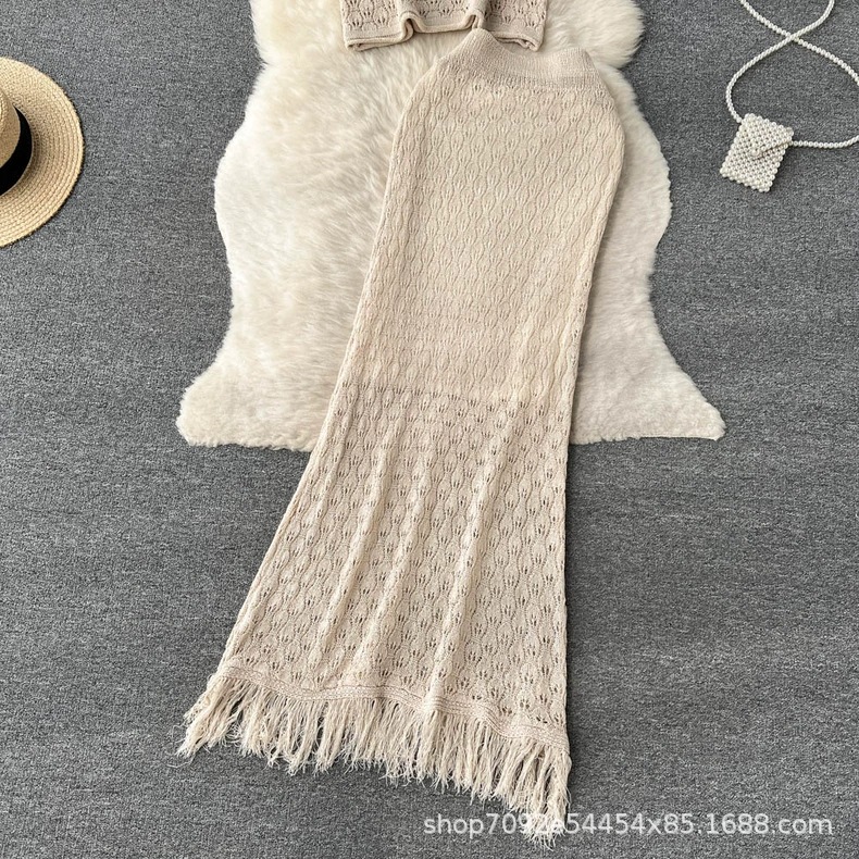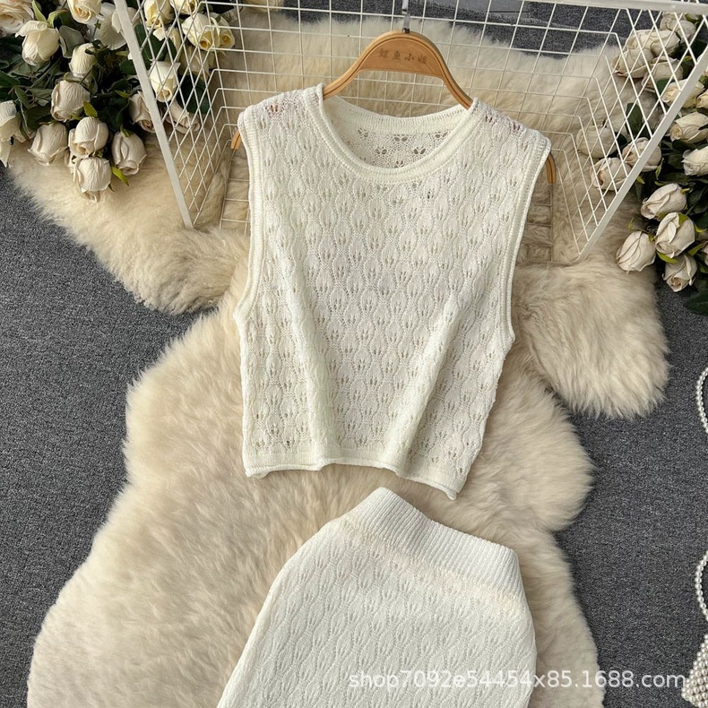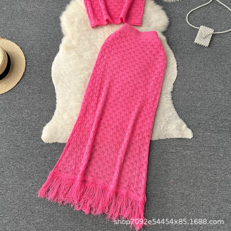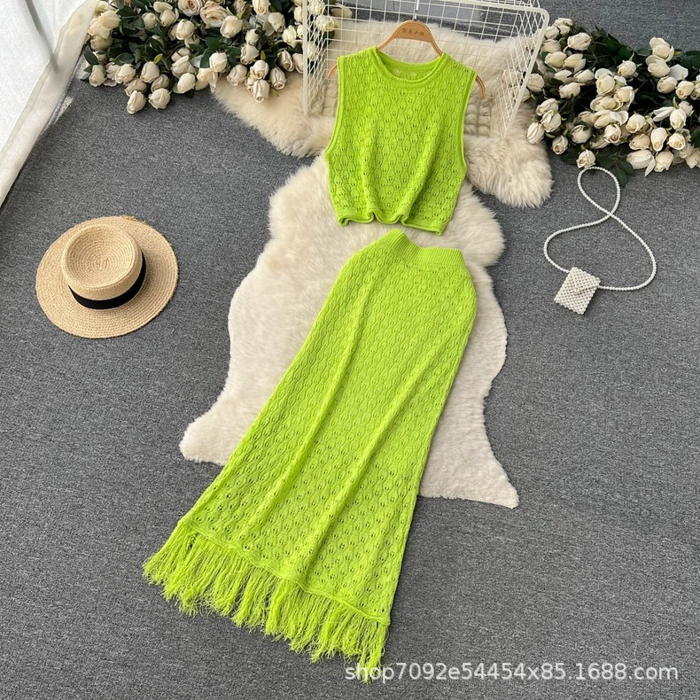 부드러운 스타일의 중공 아웃 세트 여성 여름 라운드 넥 민소매 상단 중간 길이의 술 덮개 스커트 투피스 세트스토어 가기