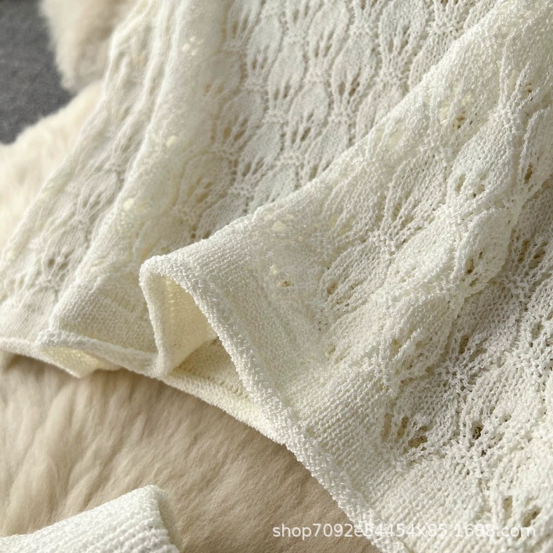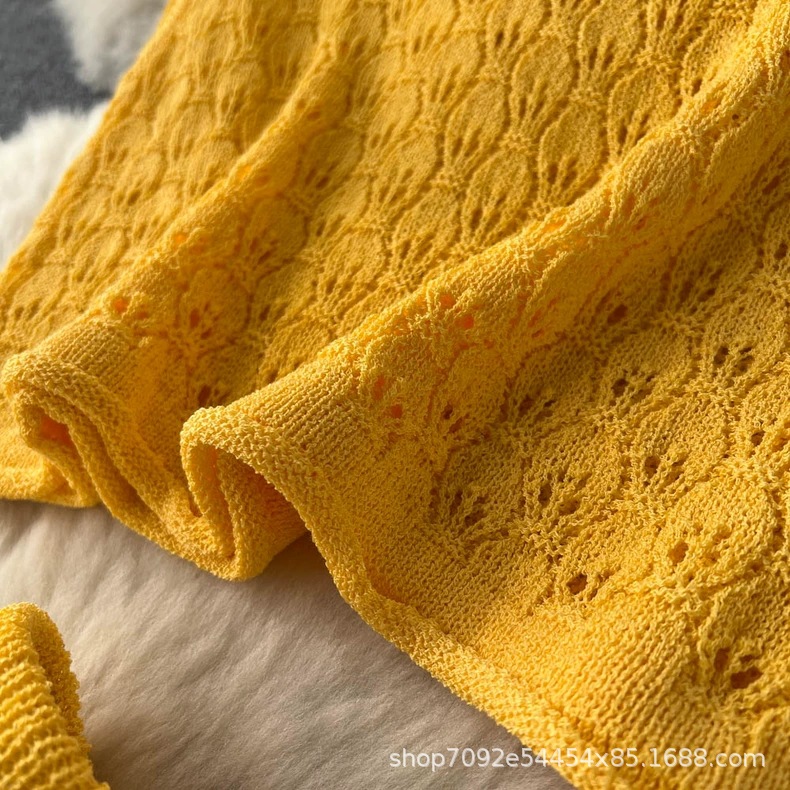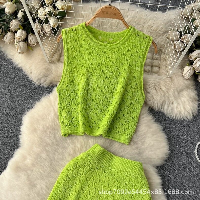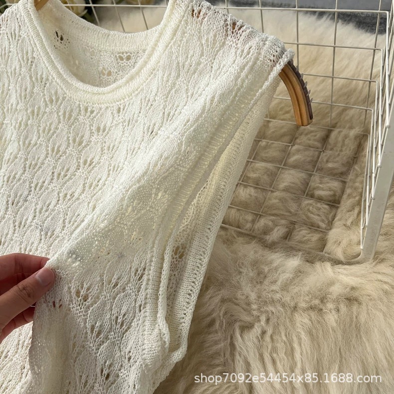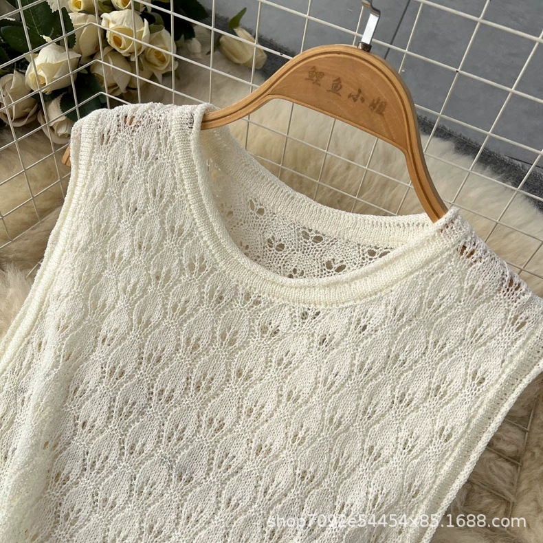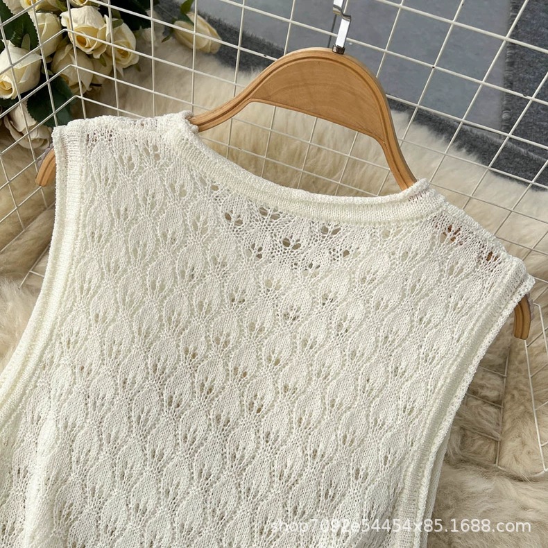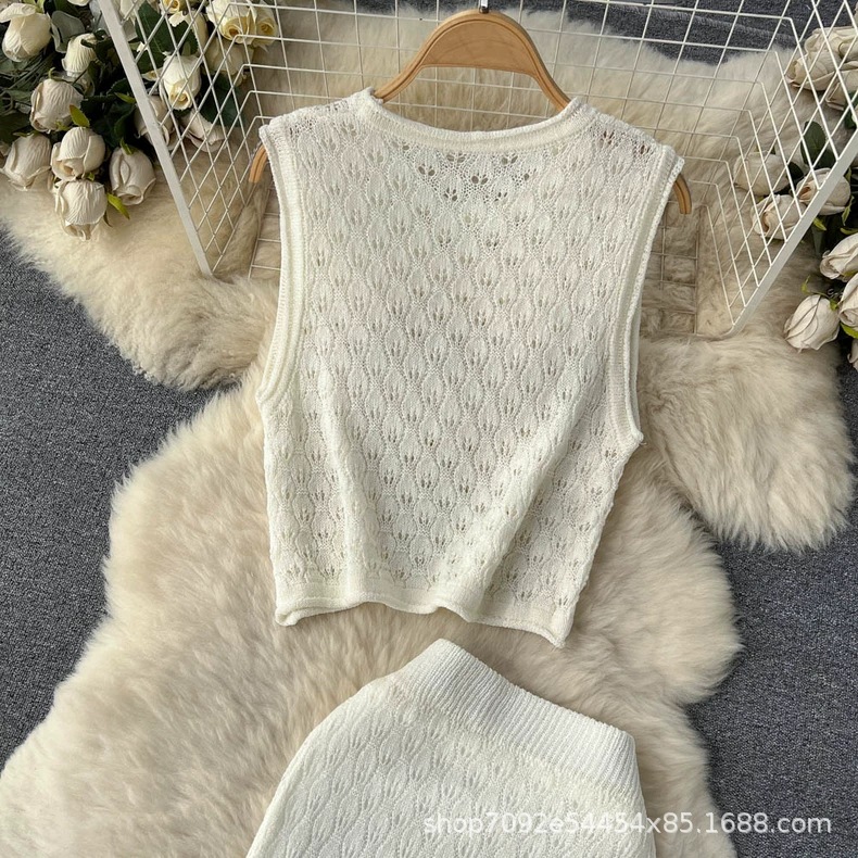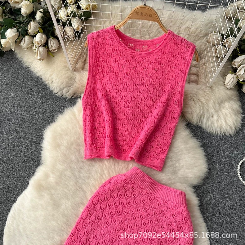 부드러운 스타일의 중공 아웃 세트 여성 여름 라운드 넥 민소매 상단 중간 길이의 술 덮개 스커트 투피스 세트스토어 가기