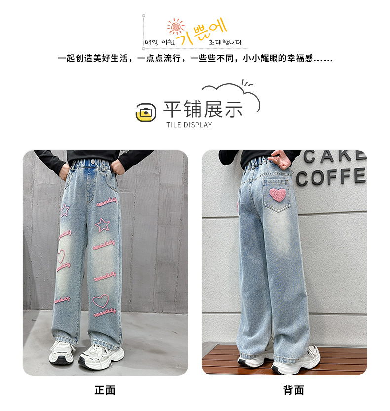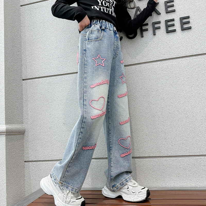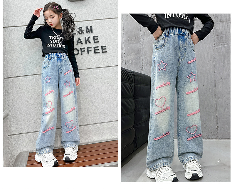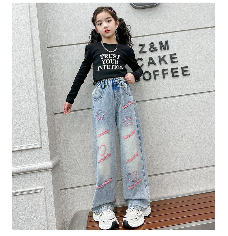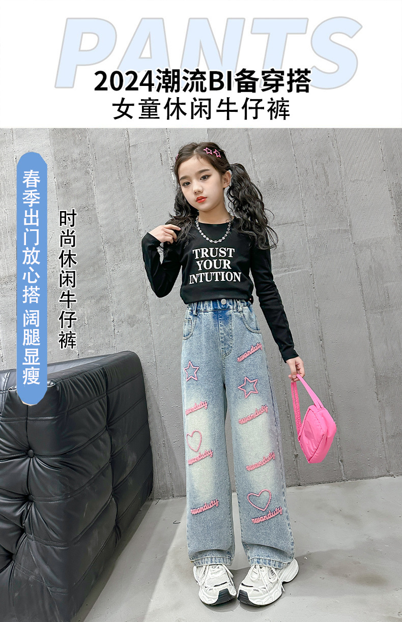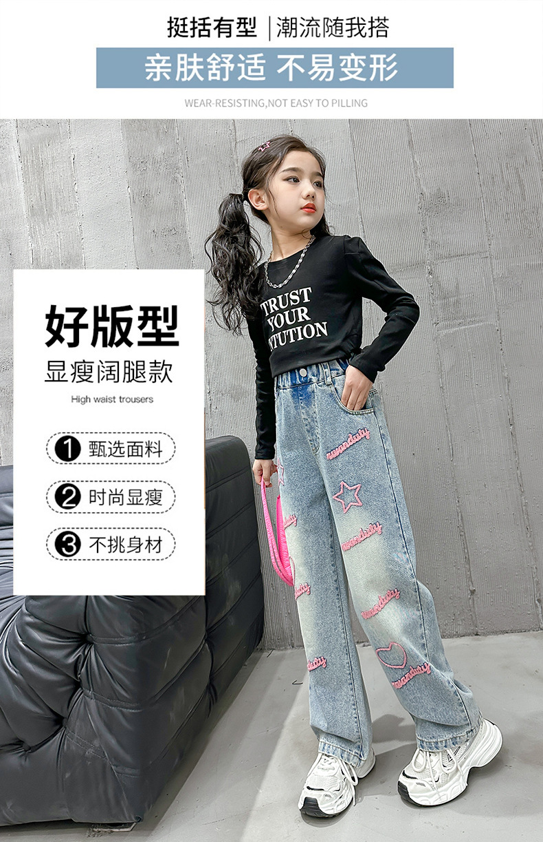소녀 바지 봄과 가을 야외 착용 2024 새로운 중형 및 대형 어린이 캐주얼 스트레이트 와이드 레그 소녀의 봄 어린이 청바지스토어 가기