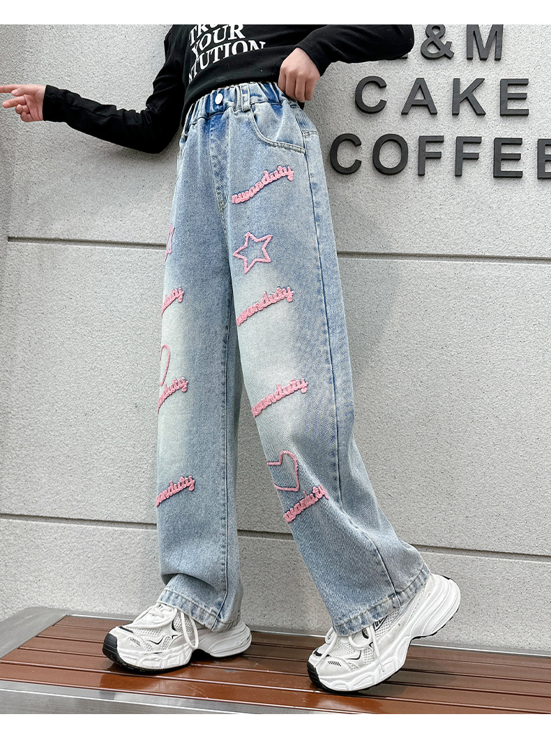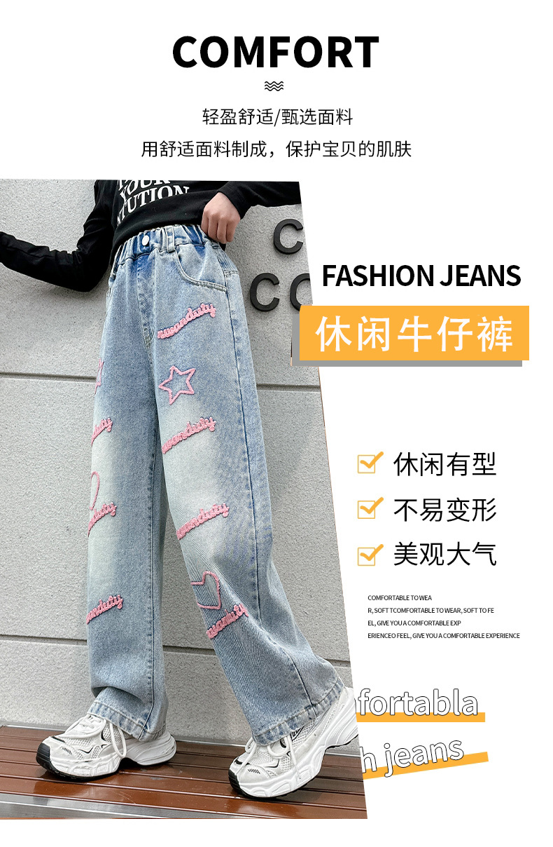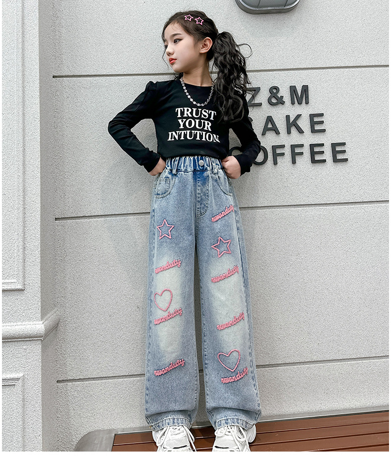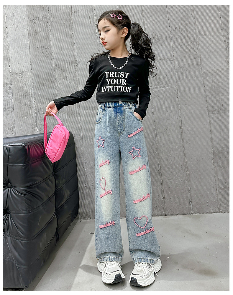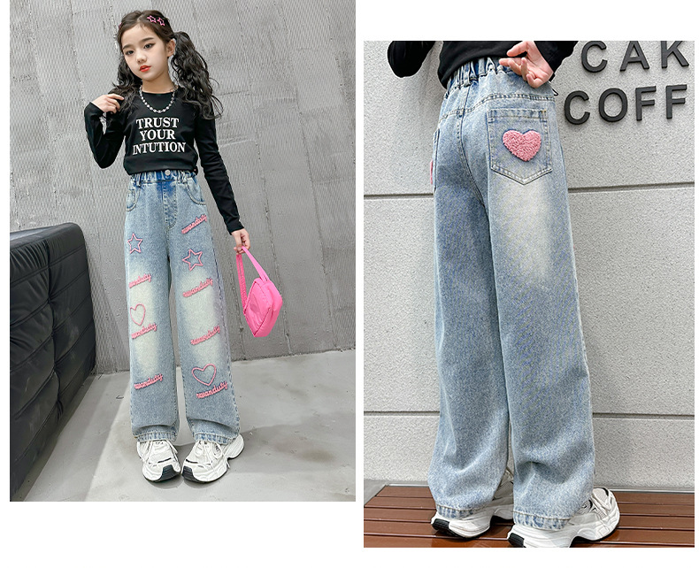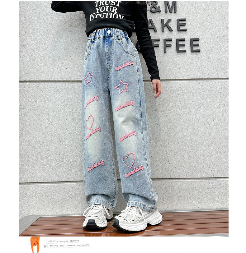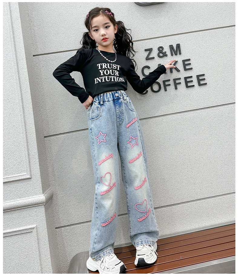 소녀 바지 봄과 가을 야외 착용 2024 새로운 중형 및 대형 어린이 캐주얼 스트레이트 와이드 레그 소녀의 봄 어린이 청바지스토어 가기