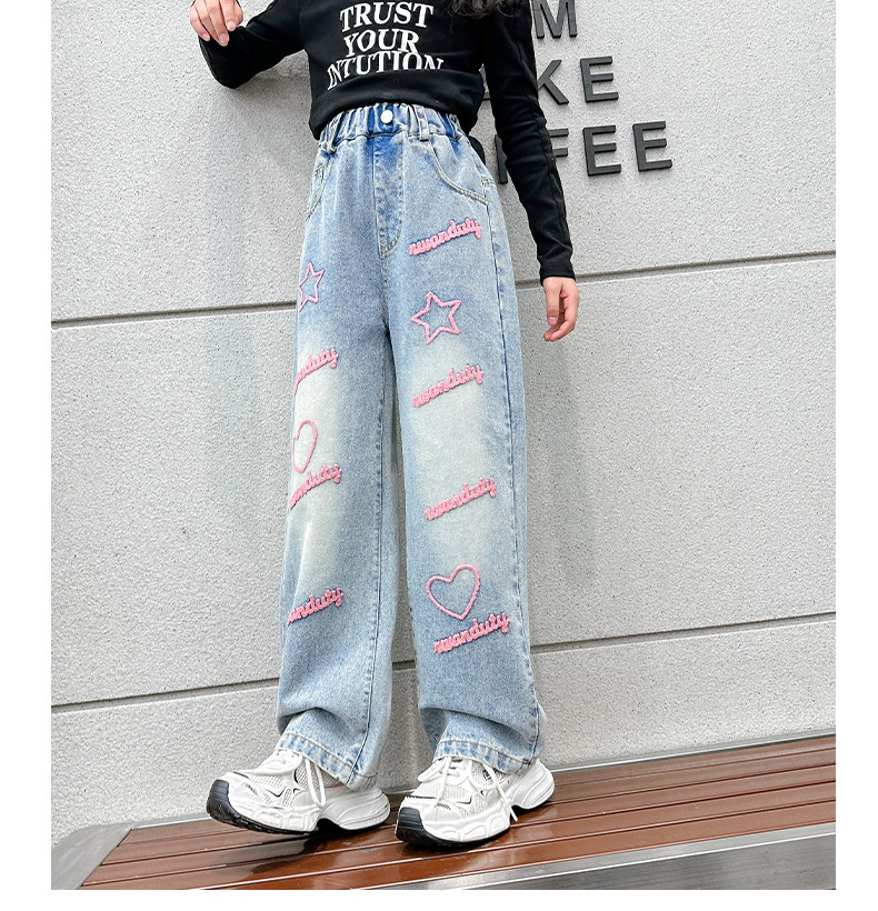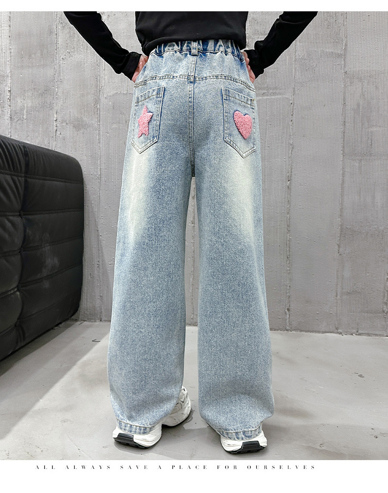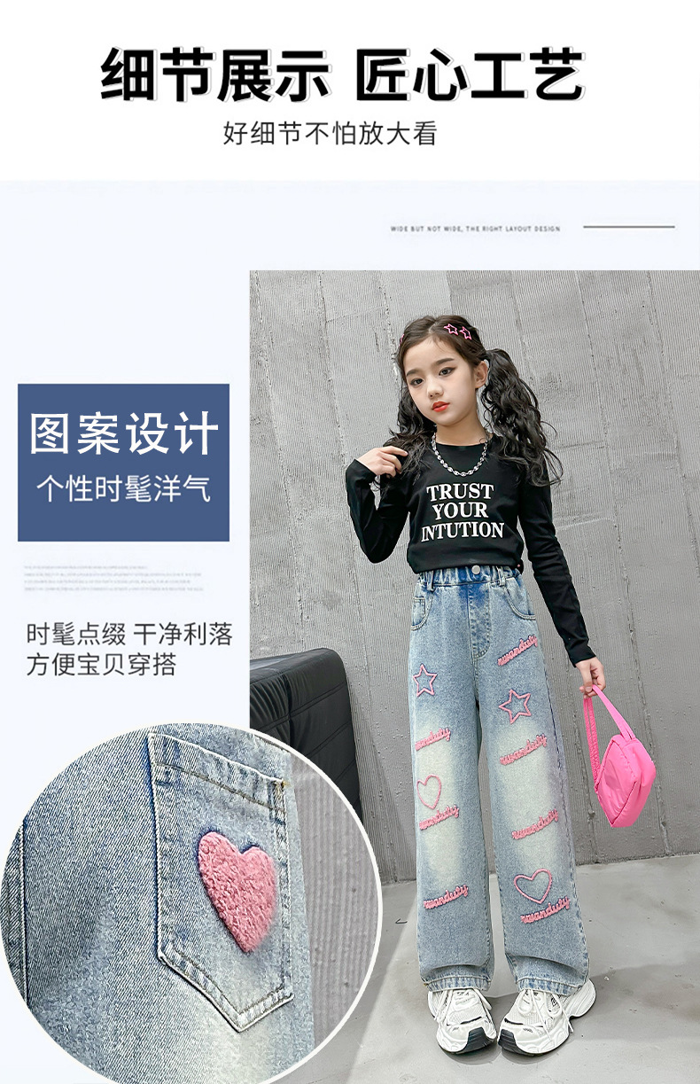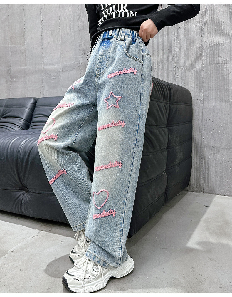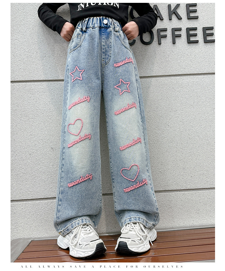 소녀 바지 봄과 가을 야외 착용 2024 새로운 중형 및 대형 어린이 캐주얼 스트레이트 와이드 레그 소녀의 봄 어린이 청바지스토어 가기