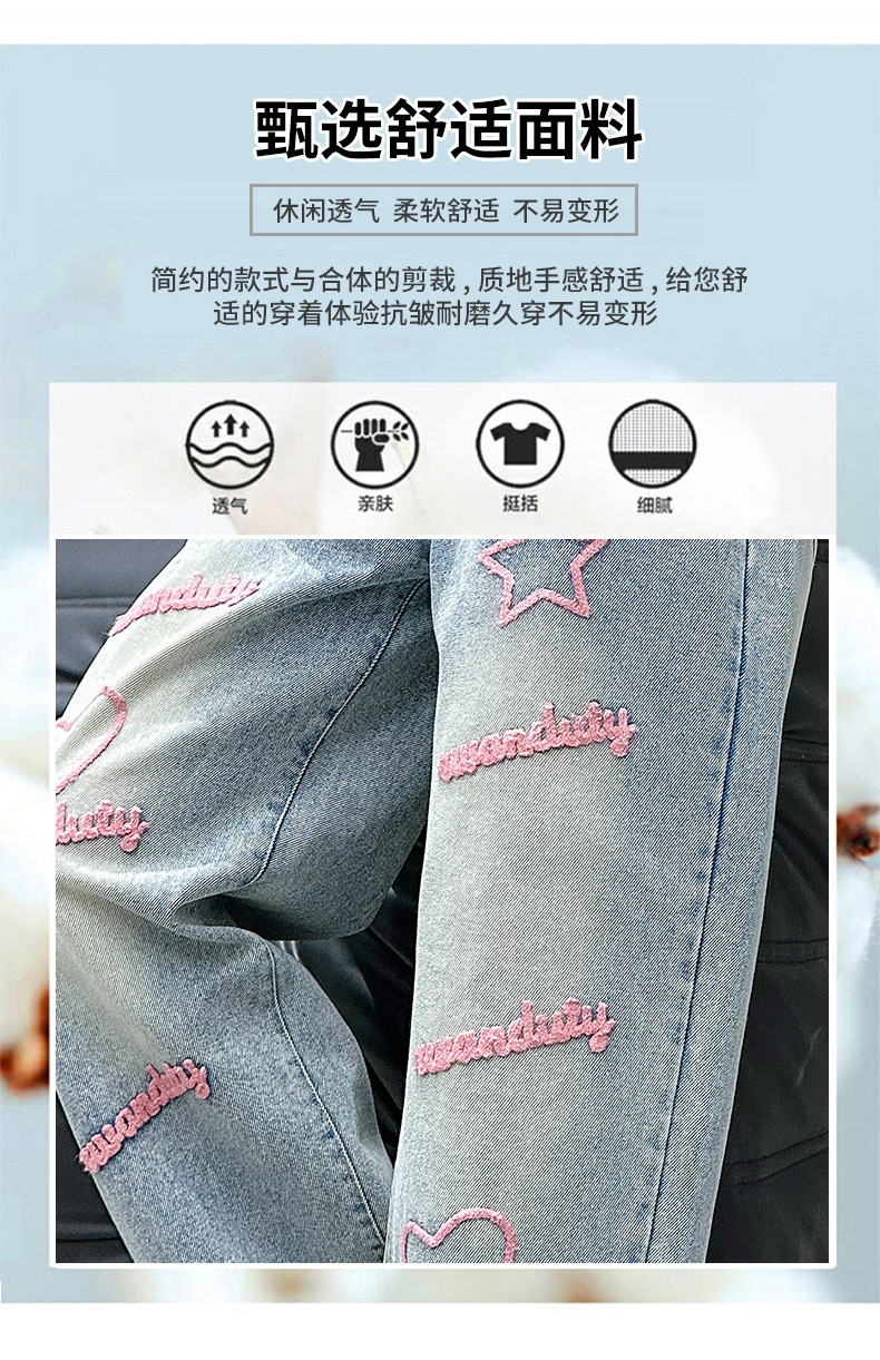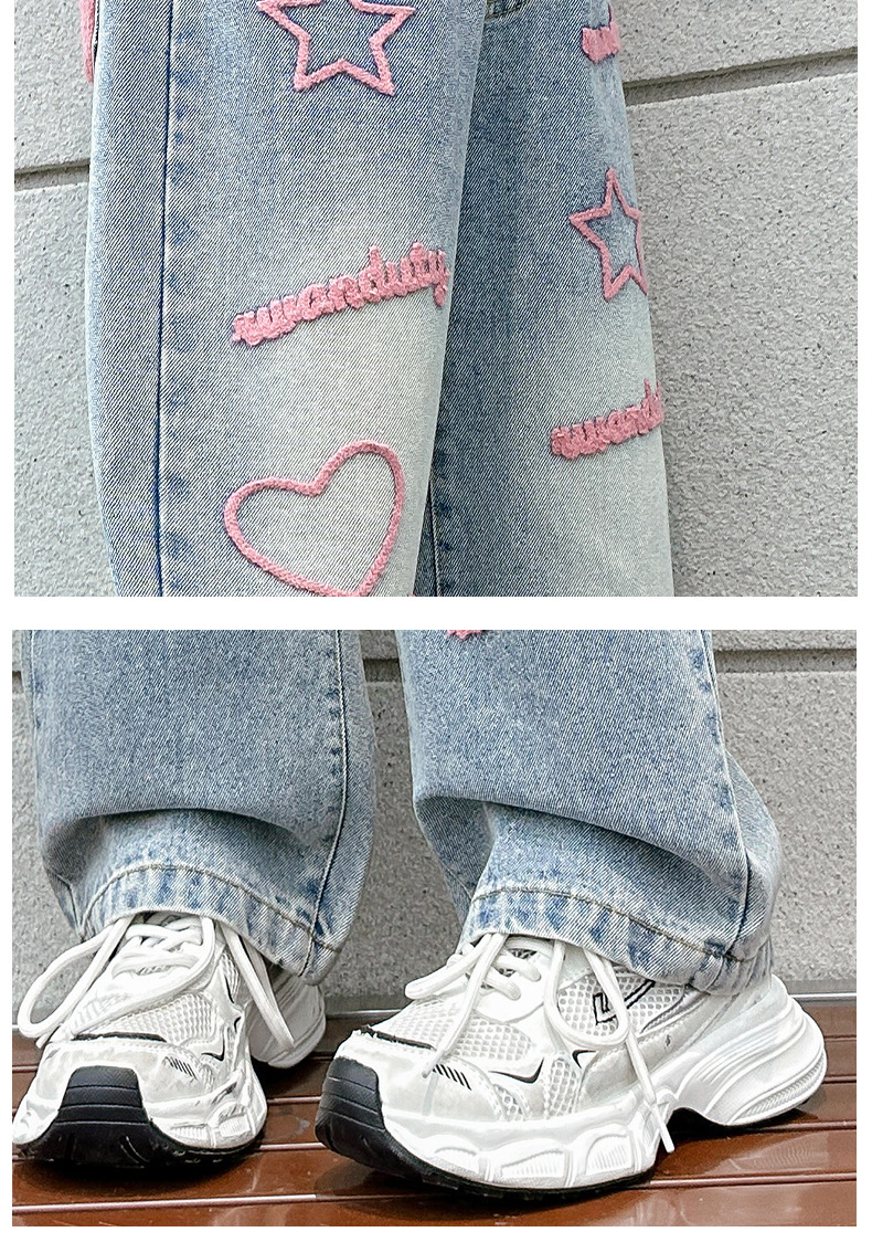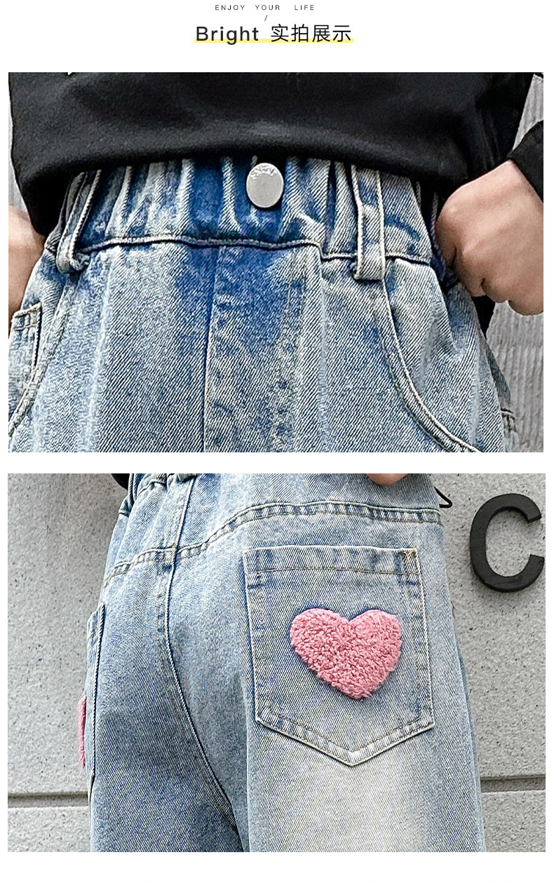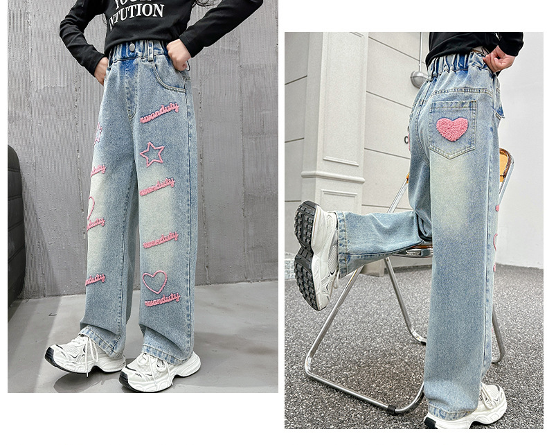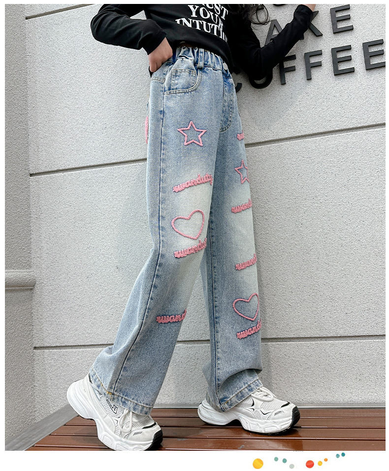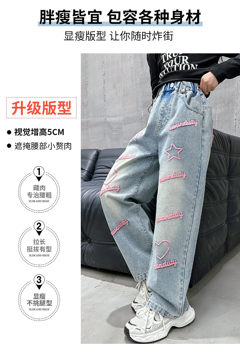소녀 바지 봄과 가을 야외 착용 2024 새로운 중형 및 대형 어린이 캐주얼 스트레이트 와이드 레그 소녀의 봄 어린이 청바지스토어 가기