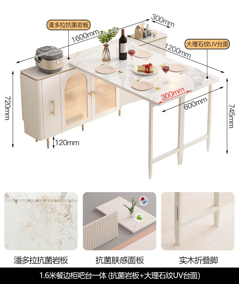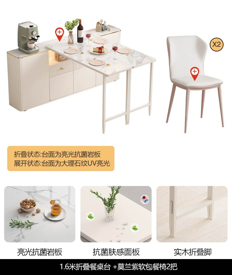 • 1.6 m 접이식 식탁 Calaka 화이트 록 플레이트 + 대리석 질감 UV 테이블