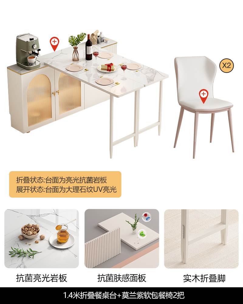 • 1.4 m 접이식 식탁 판도라 암판 + 대리석 질감 UV 테이블 + 모란 보라색 부드러운 가방 식당 의자 * 2