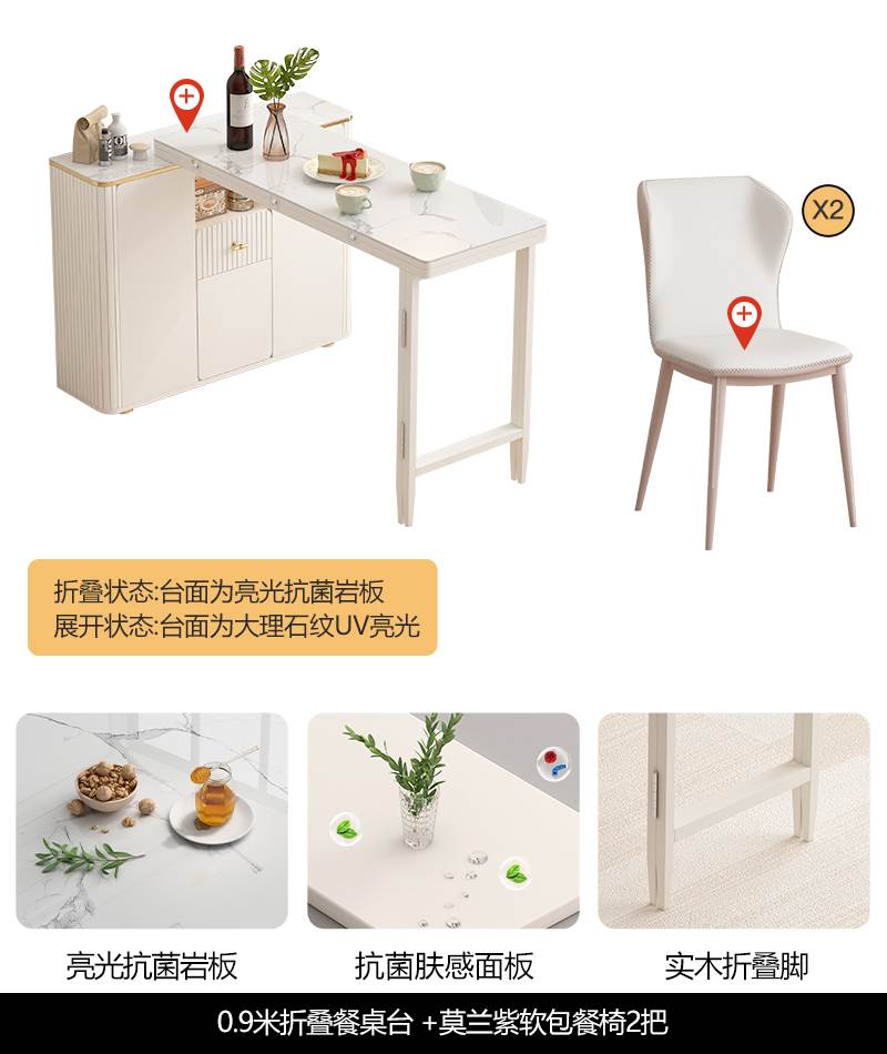 • 0.9 m 접이식 식탁 Calaka 화이트 록 플레이트 + 대리석 질감 UV 테이블 + 모란 보라색 부드러운 가방 식당 의자 * 2