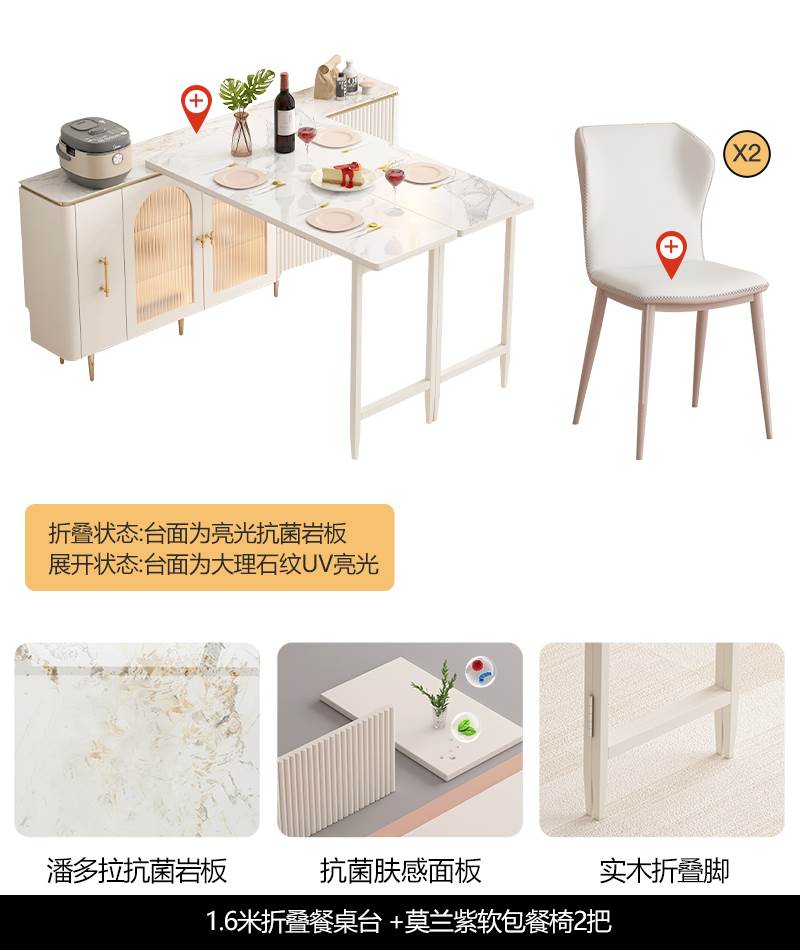 • 1.6 m 접이식 식탁 Calaka 화이트 록 플레이트 + 대리석 질감 UV 테이블 + 모란 보라색 부드러운 가방 식당 의자 * 2