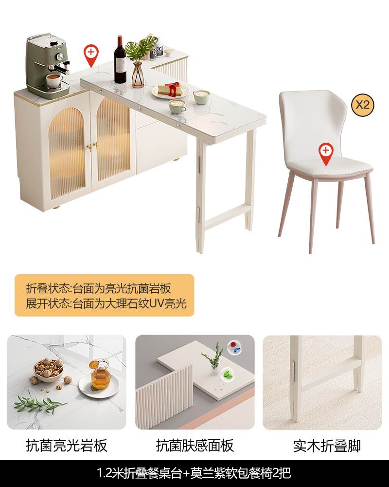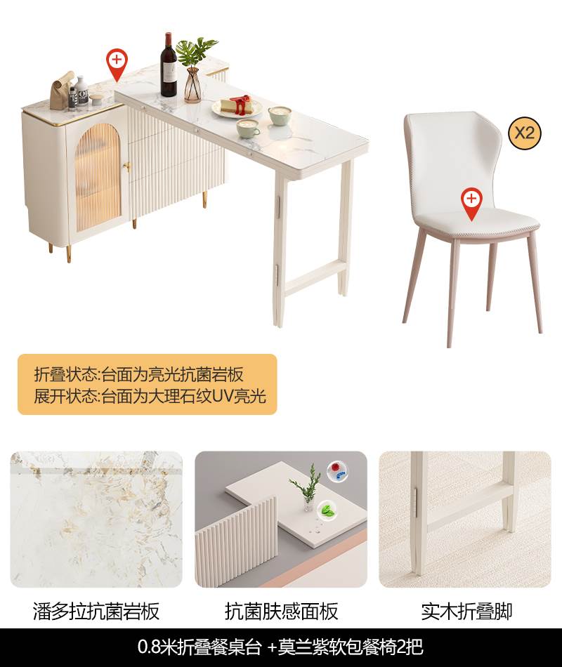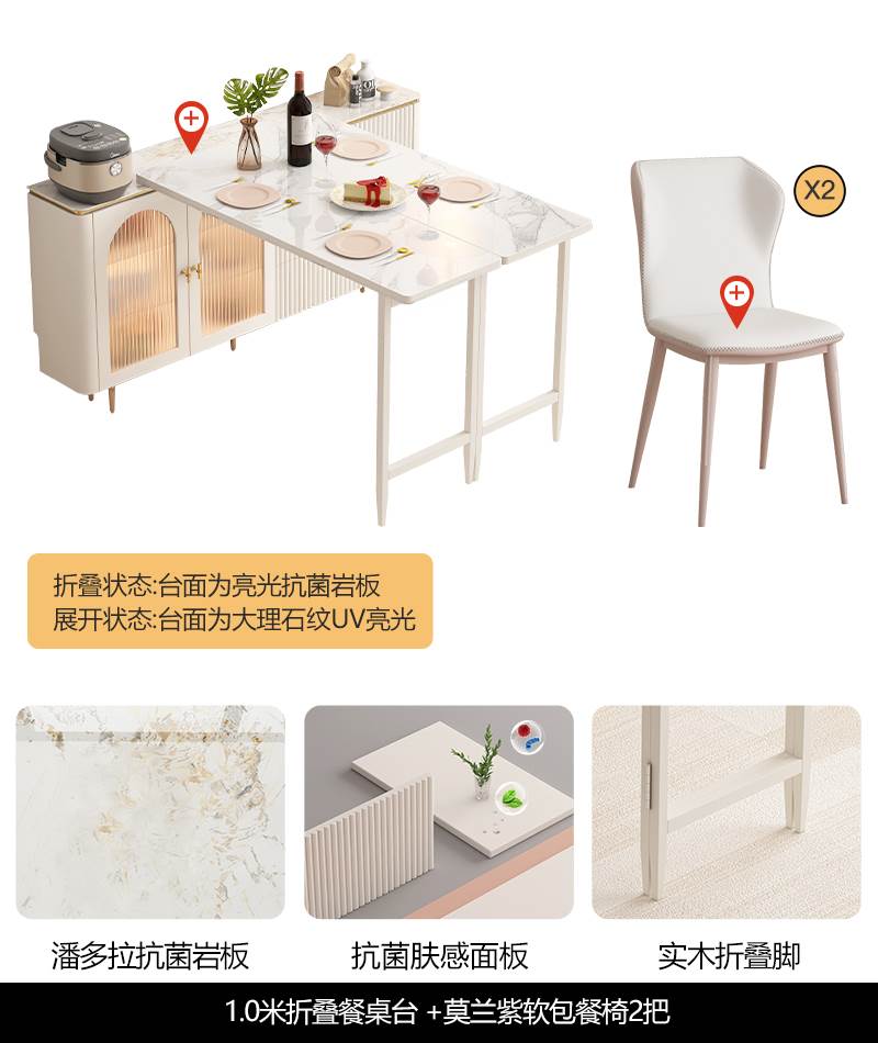 • 1 m 접이식 식탁 판도라 암판 + 대리석 질감 UV 테이블 + 모란 보라색 부드러운 가방 식당 의자 * 2