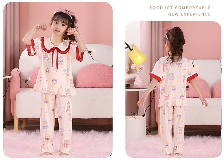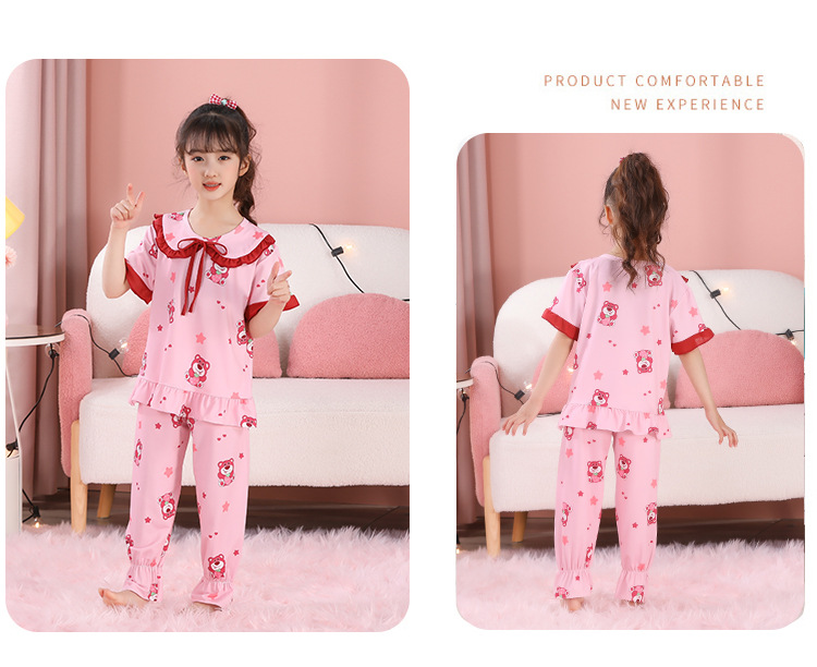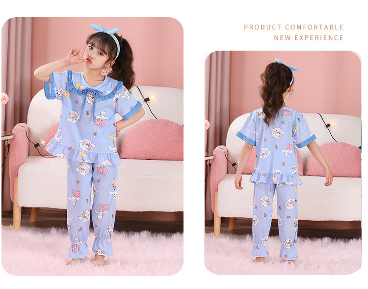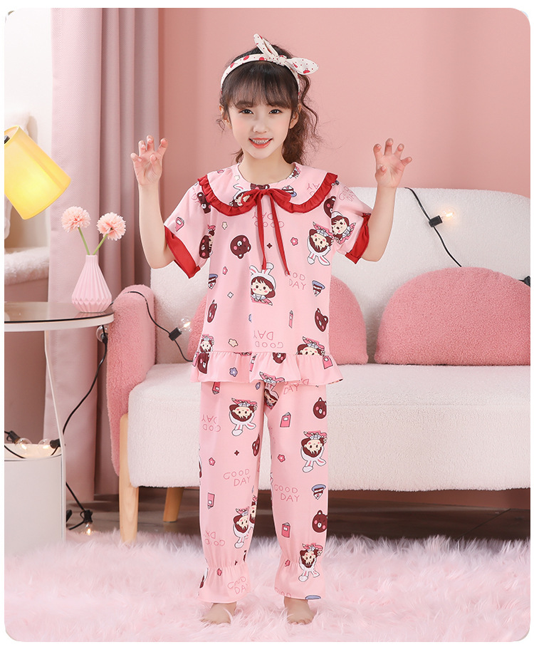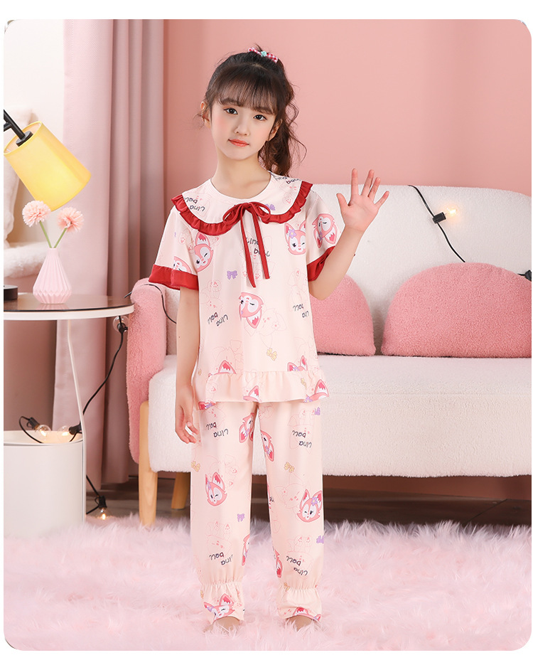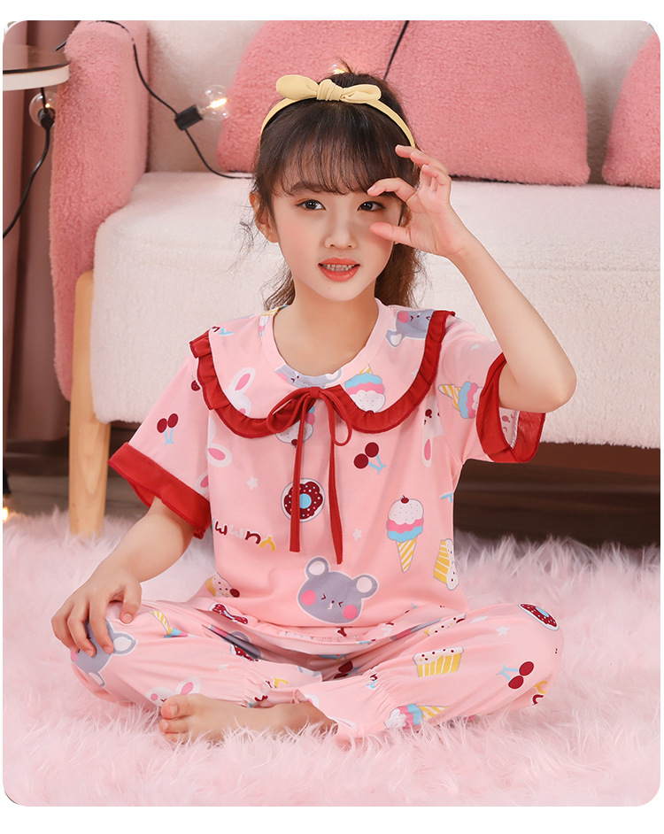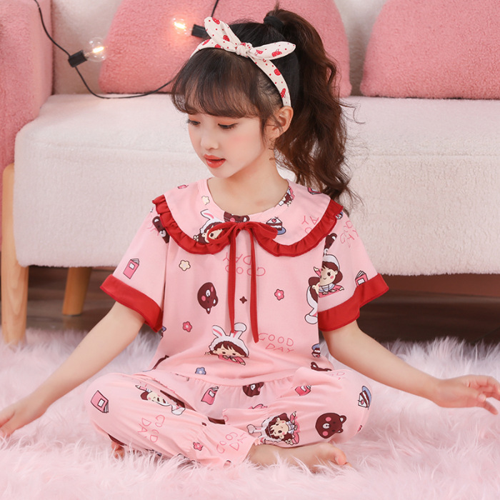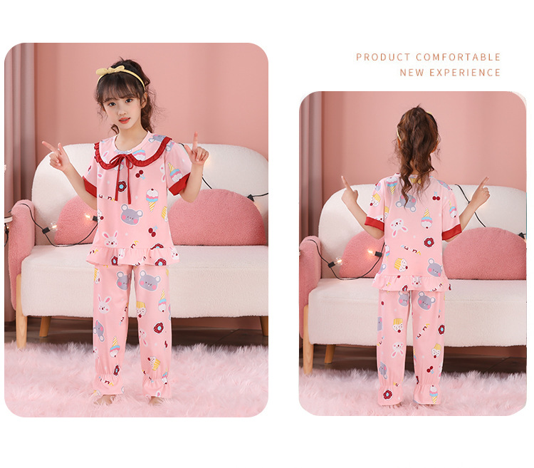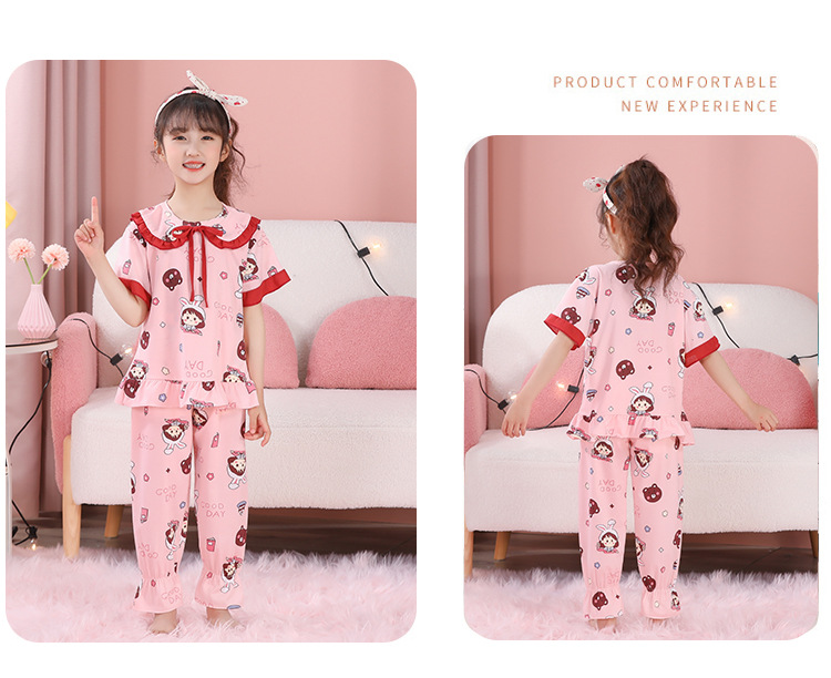 2024x 새로운 어린이 잠옷 소녀 여름 반팔 바지 공주 스타일 인형 칼라 홈웨어 세트 도매