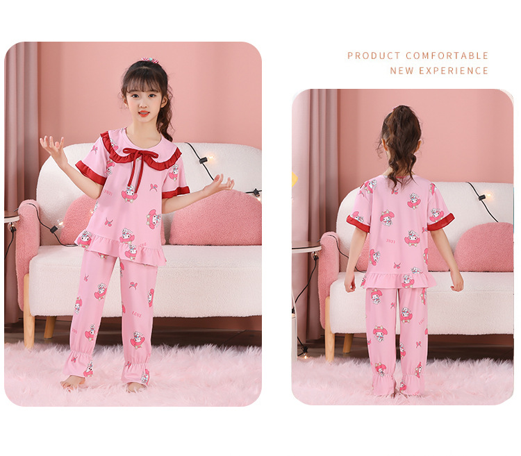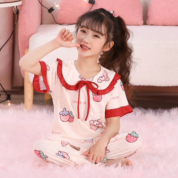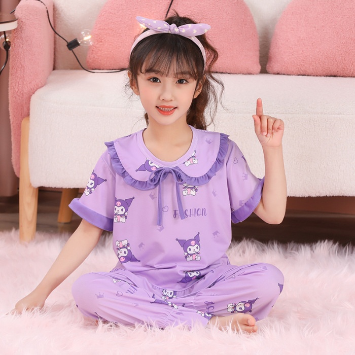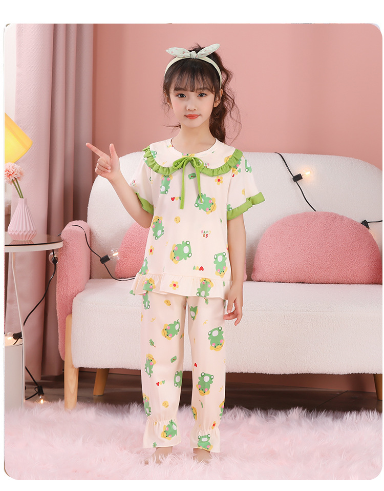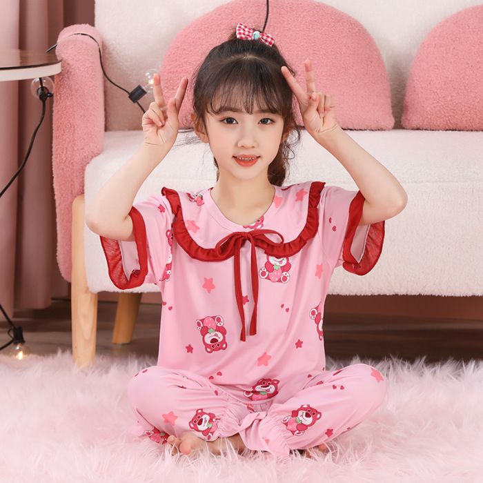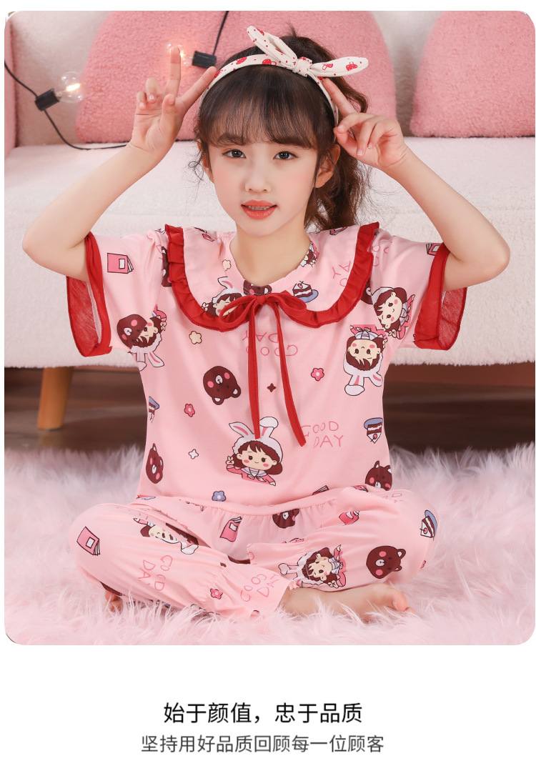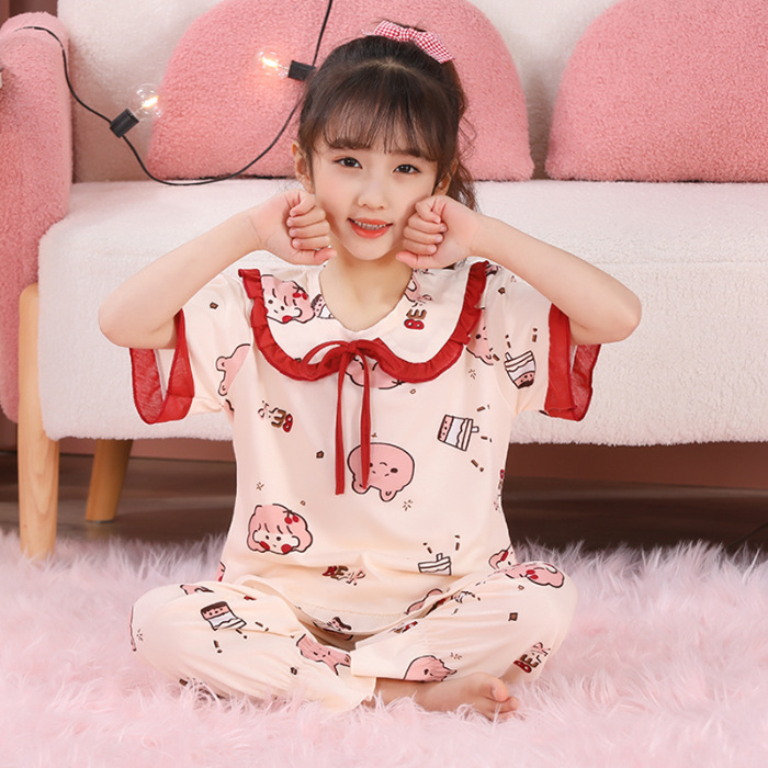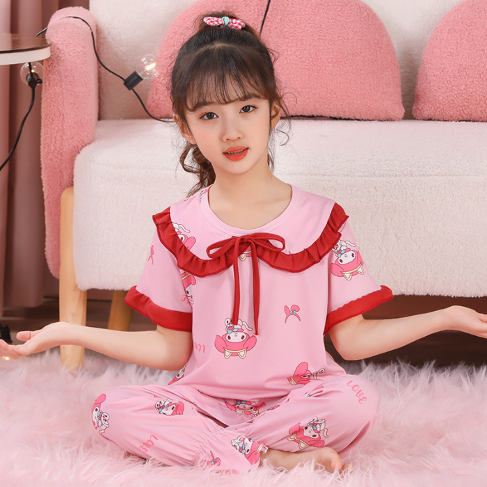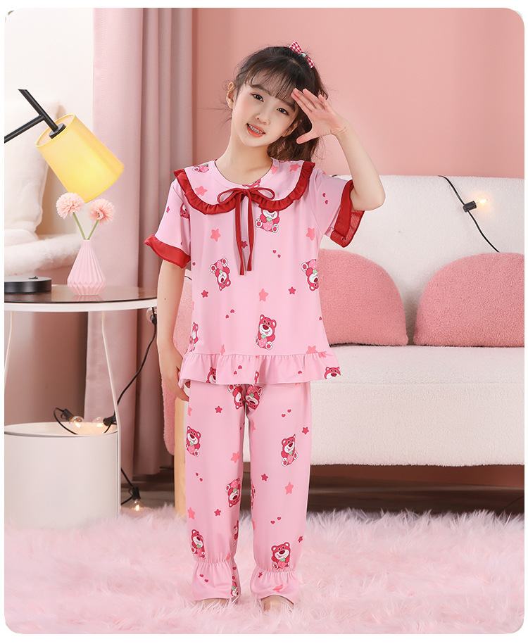 2024x 새로운 어린이 잠옷 소녀 여름 반팔 바지 공주 스타일 인형 칼라 홈웨어 세트 도매