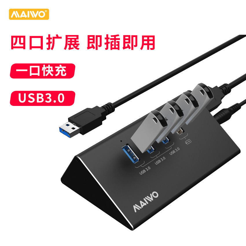 Maiwo KH104 USB3.0 풀 알루미늄 4포트 허브(고속 충전 기능 포함) 블랙 외부