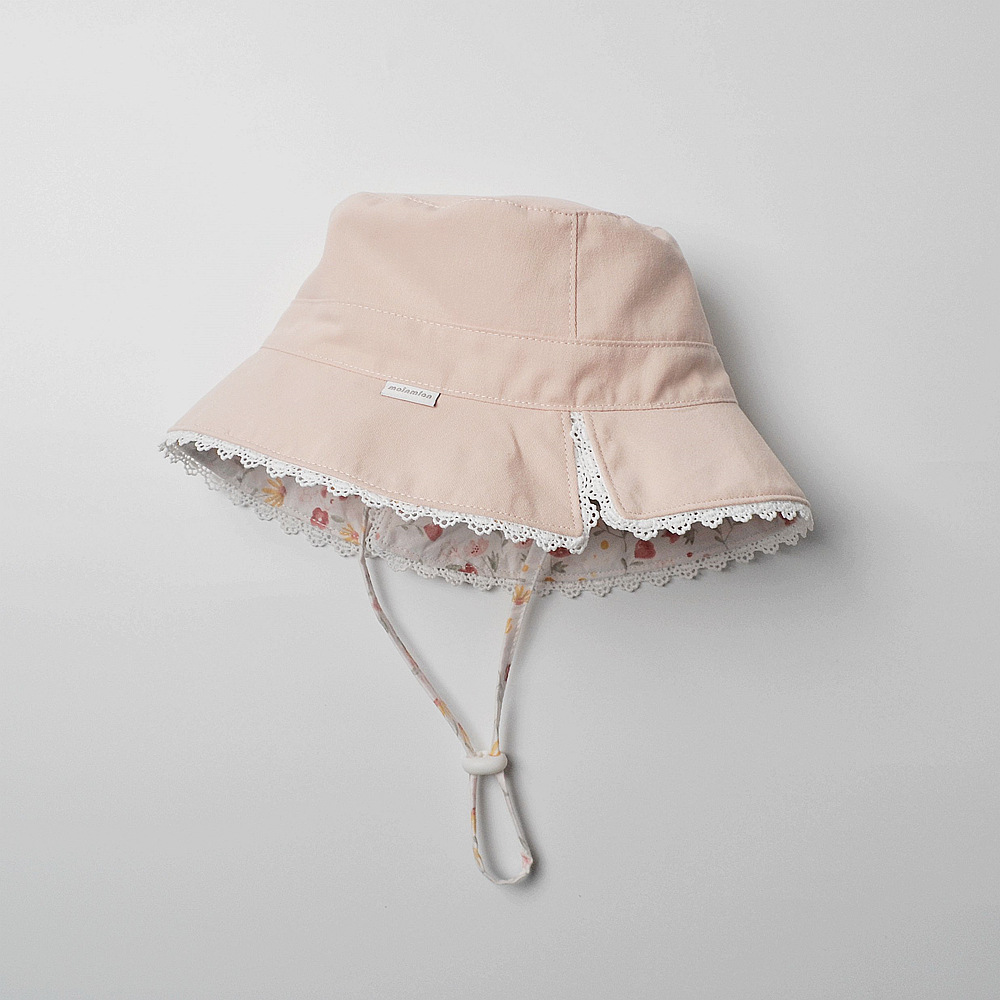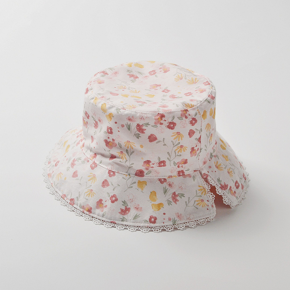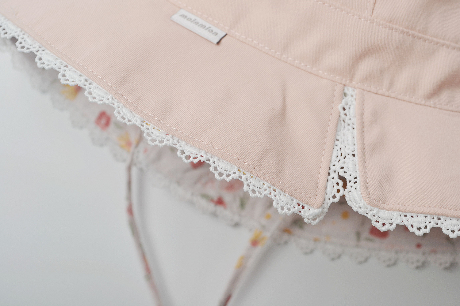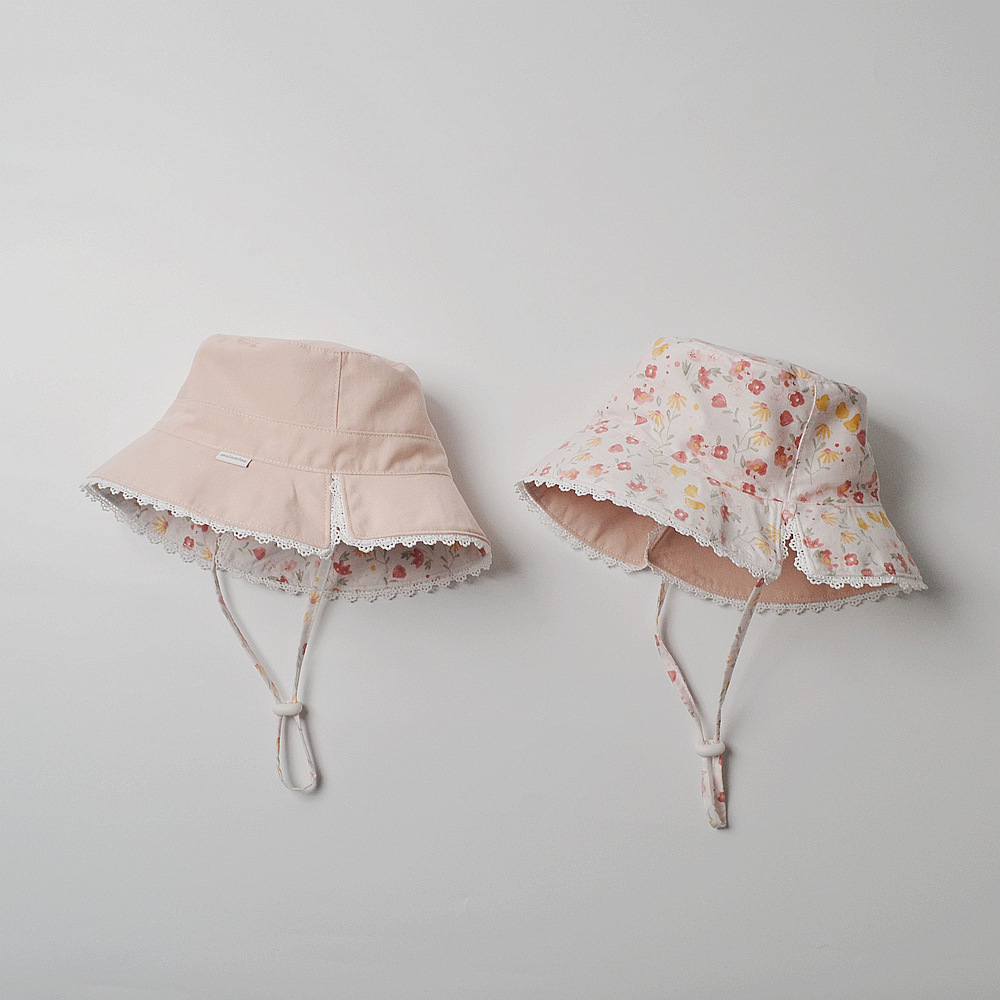 【商品介绍】蕾丝边和粉色系的加入,使得帽子淑女感十足,非常的漂亮。另外一面碎花也是同色系的,整体协调、好看。防风绳两面均可以使用哦。