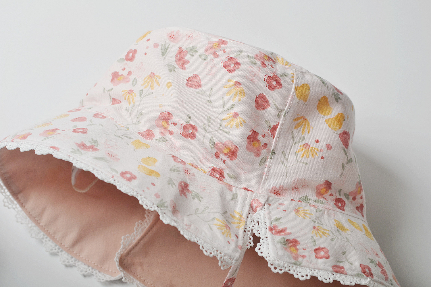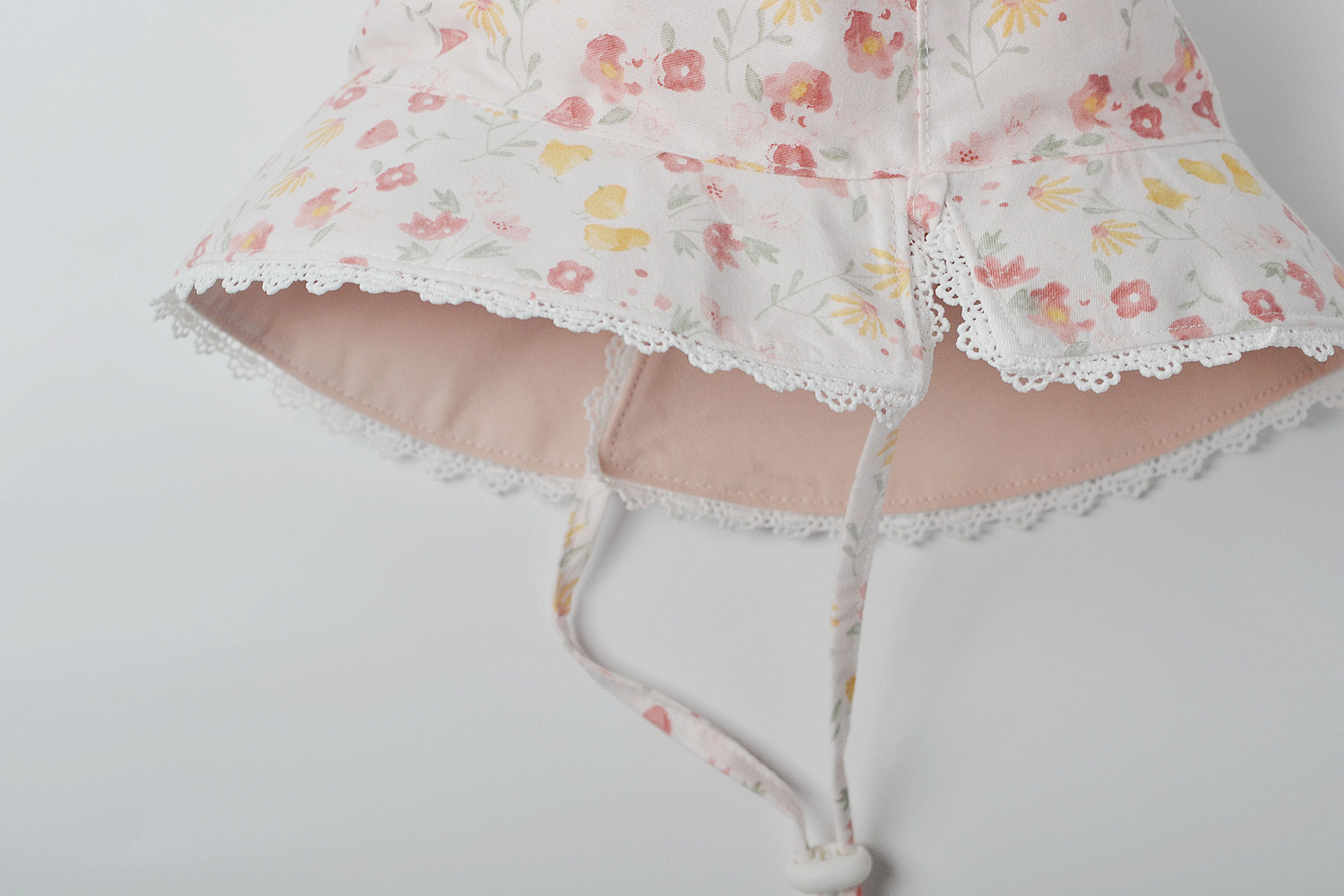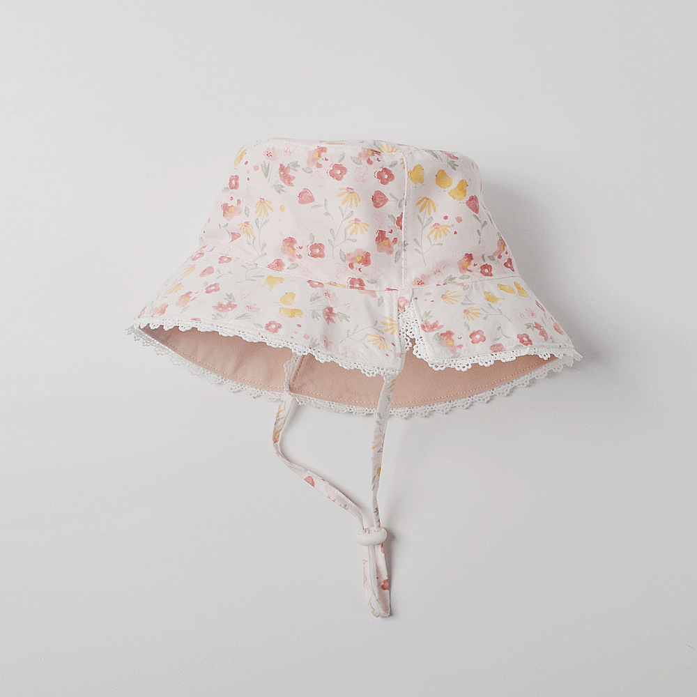 【商品介绍】蕾丝边和粉色系的加入,使得帽子淑女感十足,非常的漂亮。另外一面碎花也是同色系的,整体协调、好看。防风绳两面均可以使用哦。