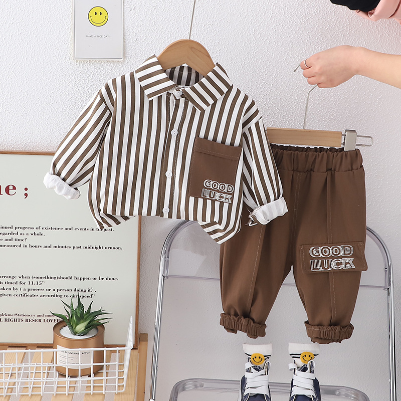2024 새로운 봄 한국식 어린이 줄무늬 셔츠 세트 투피스 소년 봄 옷 어린이 세트 유행 헤어 세대스토어 가기