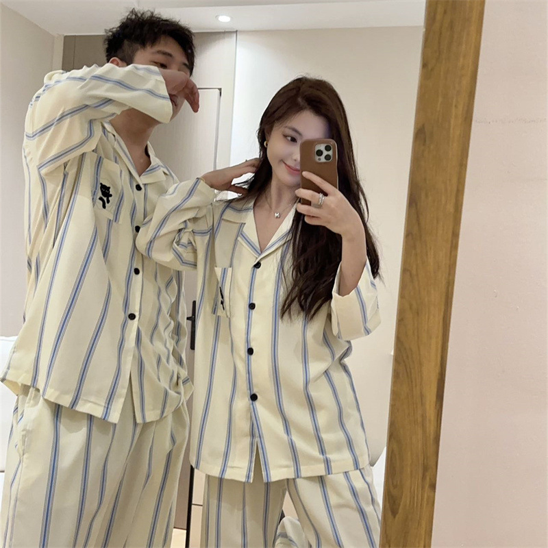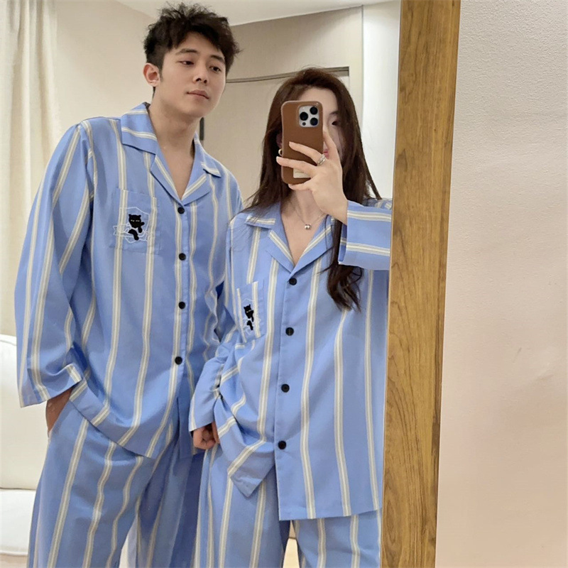 봄과 가을 커플의 피부 친화적 인 코튼 파자마 여성 줄무늬 긴팔 바지 소년은 고급 홈웨어 세트 밖에서 입을 수 있습니다.스토어 가기