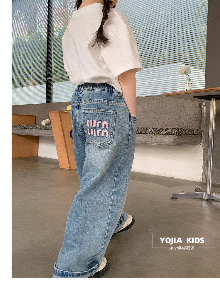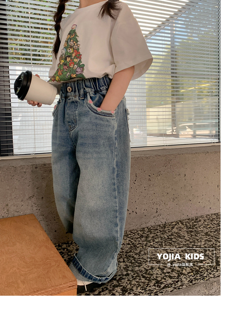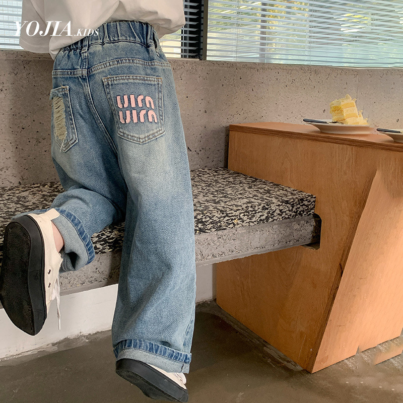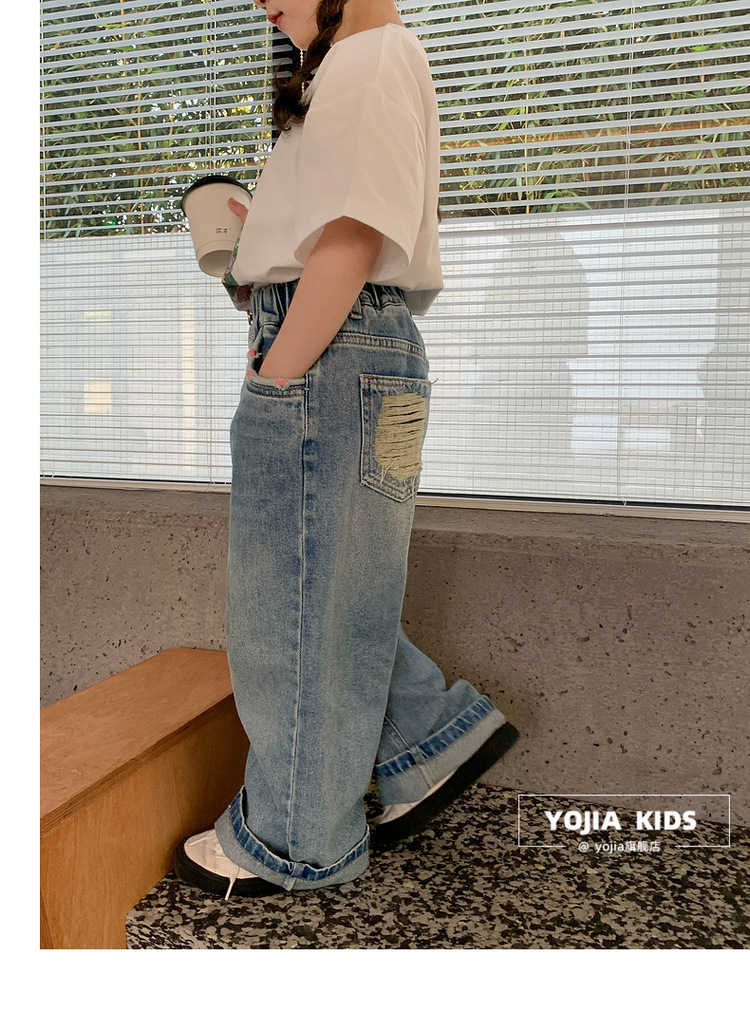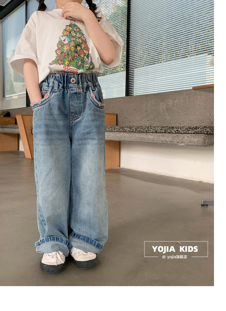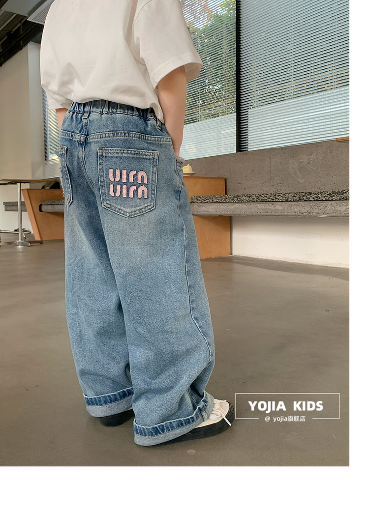 YOJIA 소녀의 넓은 다리 바지 봄과 가을 바지 봄 스트레이트 다리 바지 어린이 대형 어린이 느슨한 청바지 서양식스토어 가기