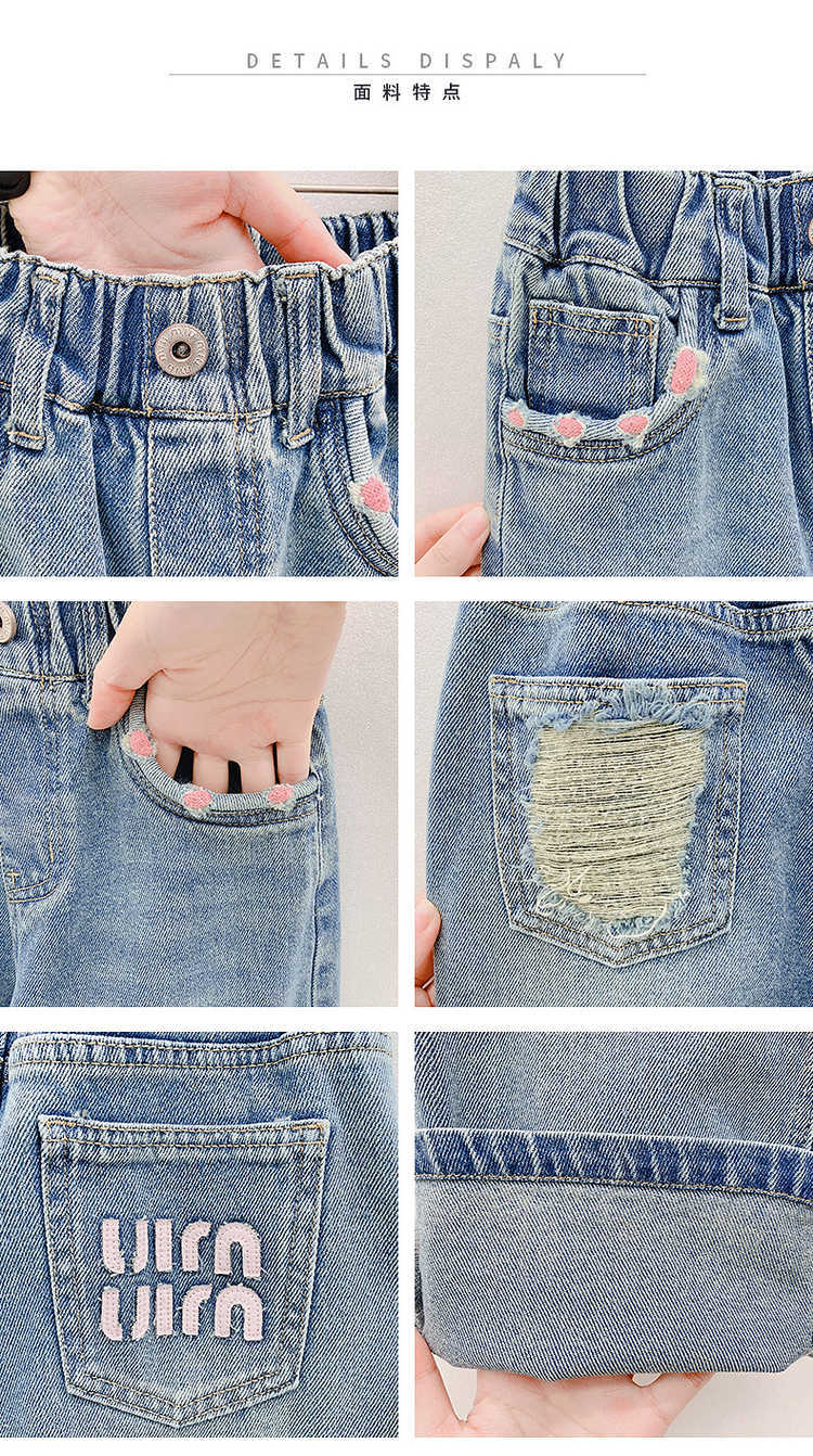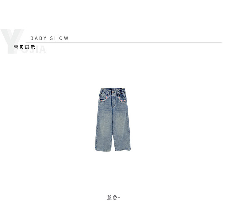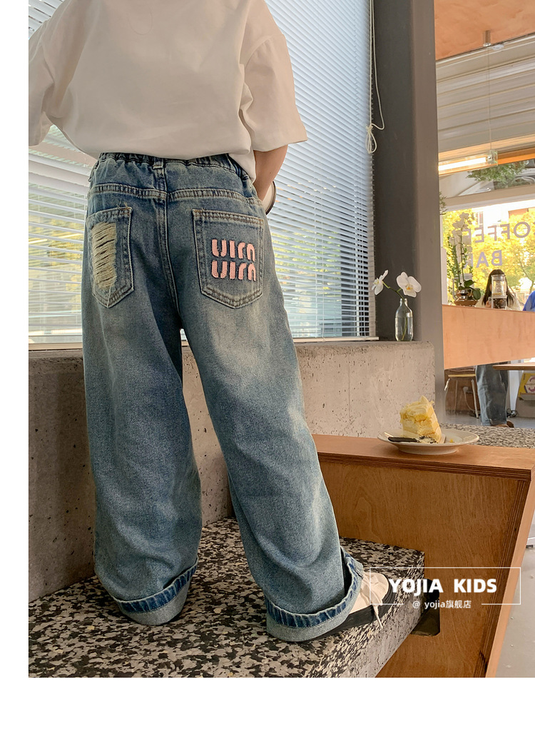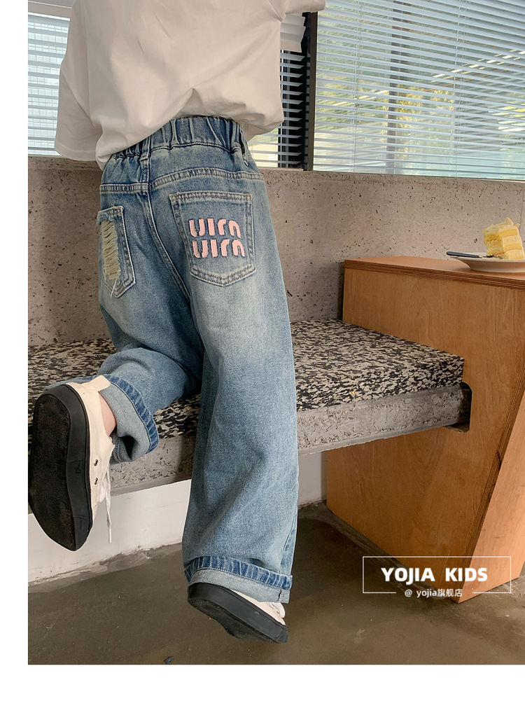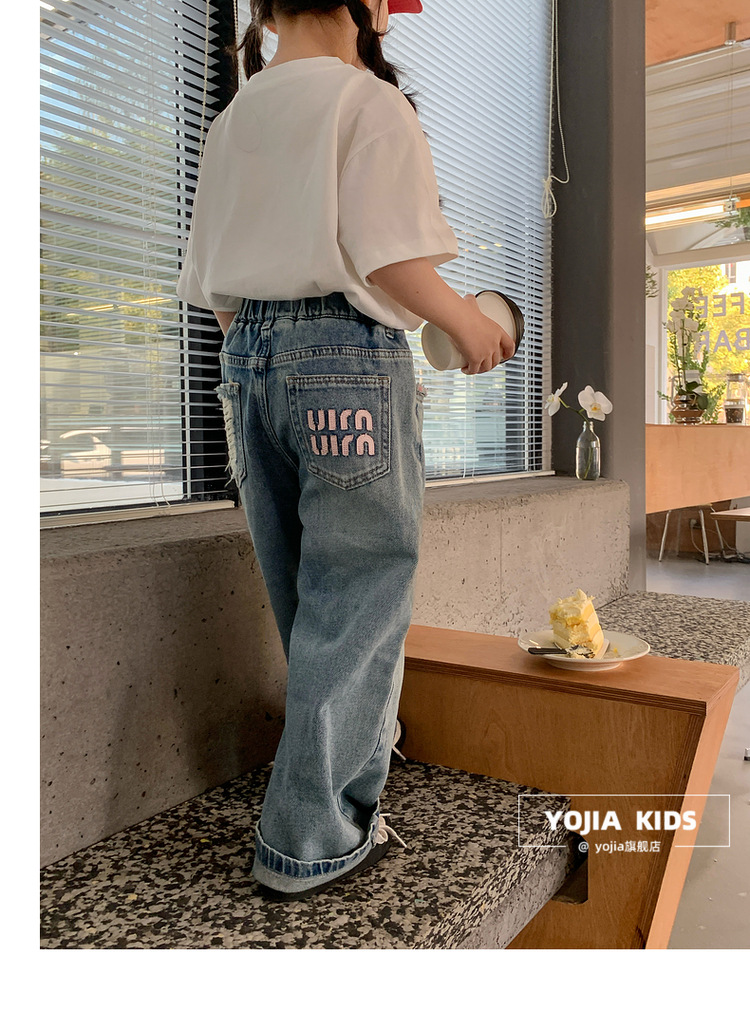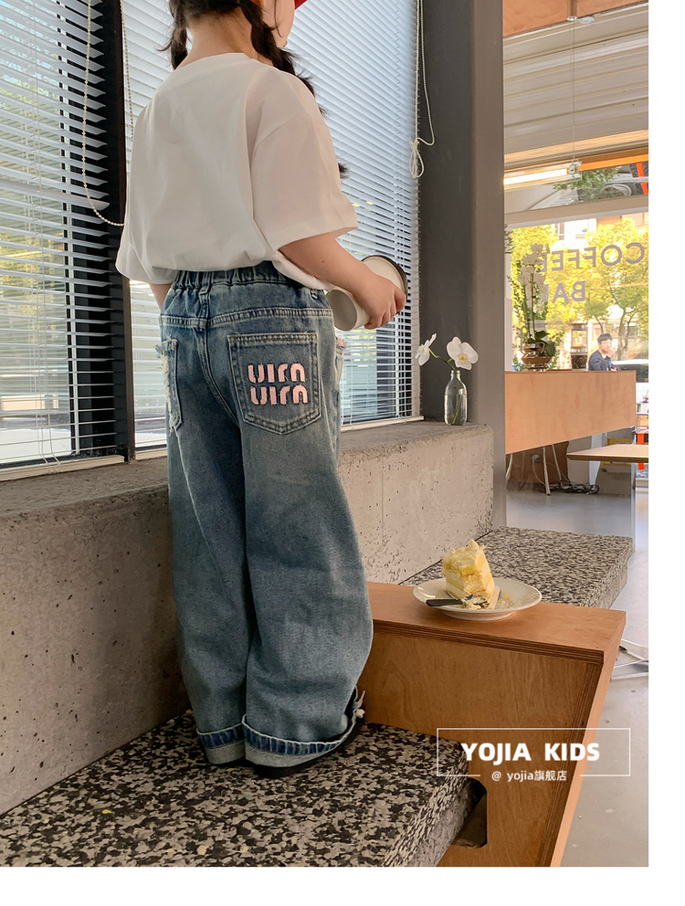 YOJIA 소녀의 넓은 다리 바지 봄과 가을 바지 봄 스트레이트 다리 바지 어린이 대형 어린이 느슨한 청바지 서양식스토어 가기