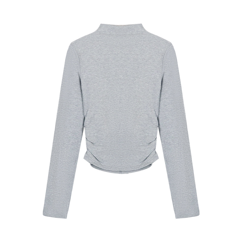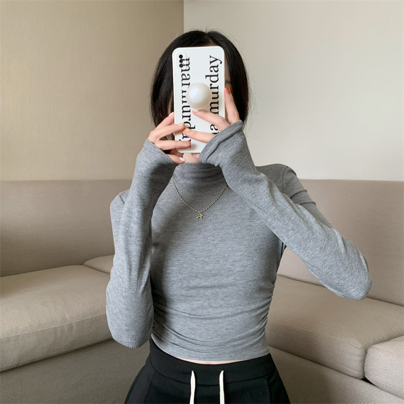 여성을위한 회색 긴팔 티셔츠 봄 2025 새로운 슬림 피트 주름 핫 소녀 하프 터틀넥 셔츠 탑 트렌디