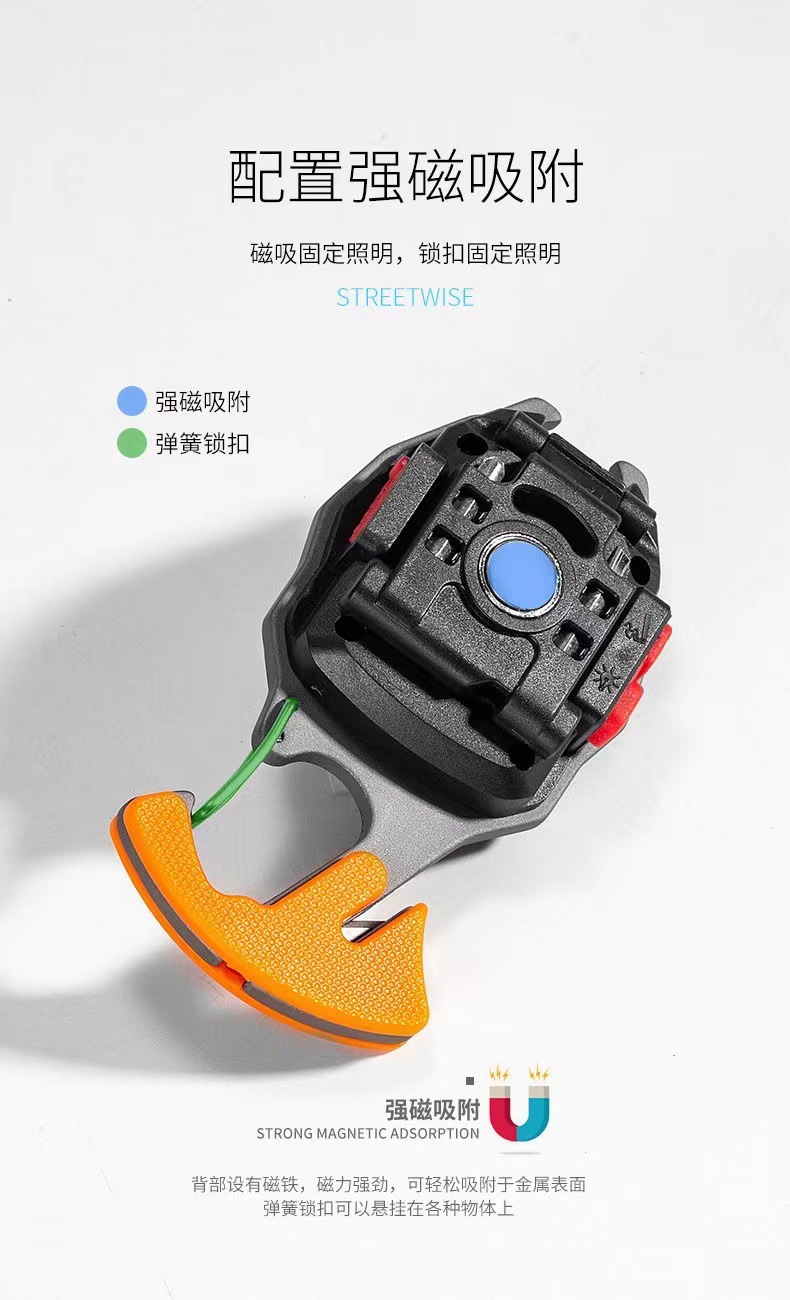 功能: 白光 强 - 弱 ;黄光 强 - 弱白光+黄光,(长按2秒)红光,强 - 闪卡扣式弹簧挂钩、开瓶器、带割刀 背面调节支架、 强磁