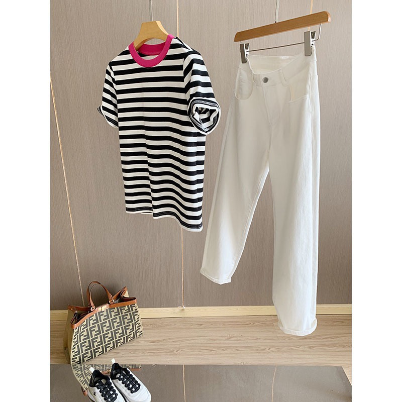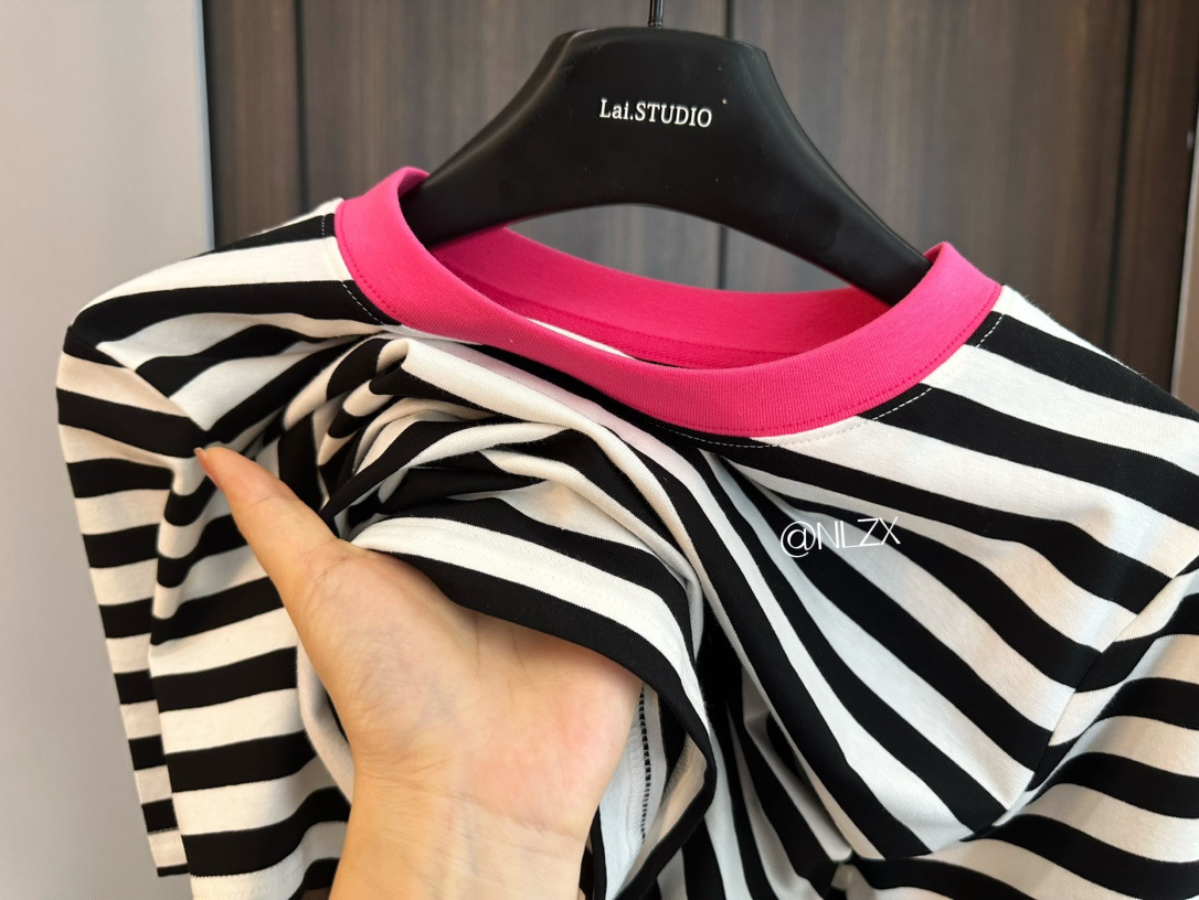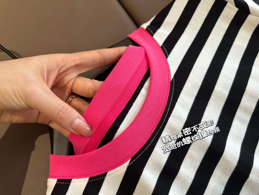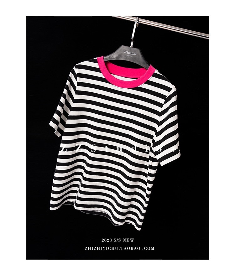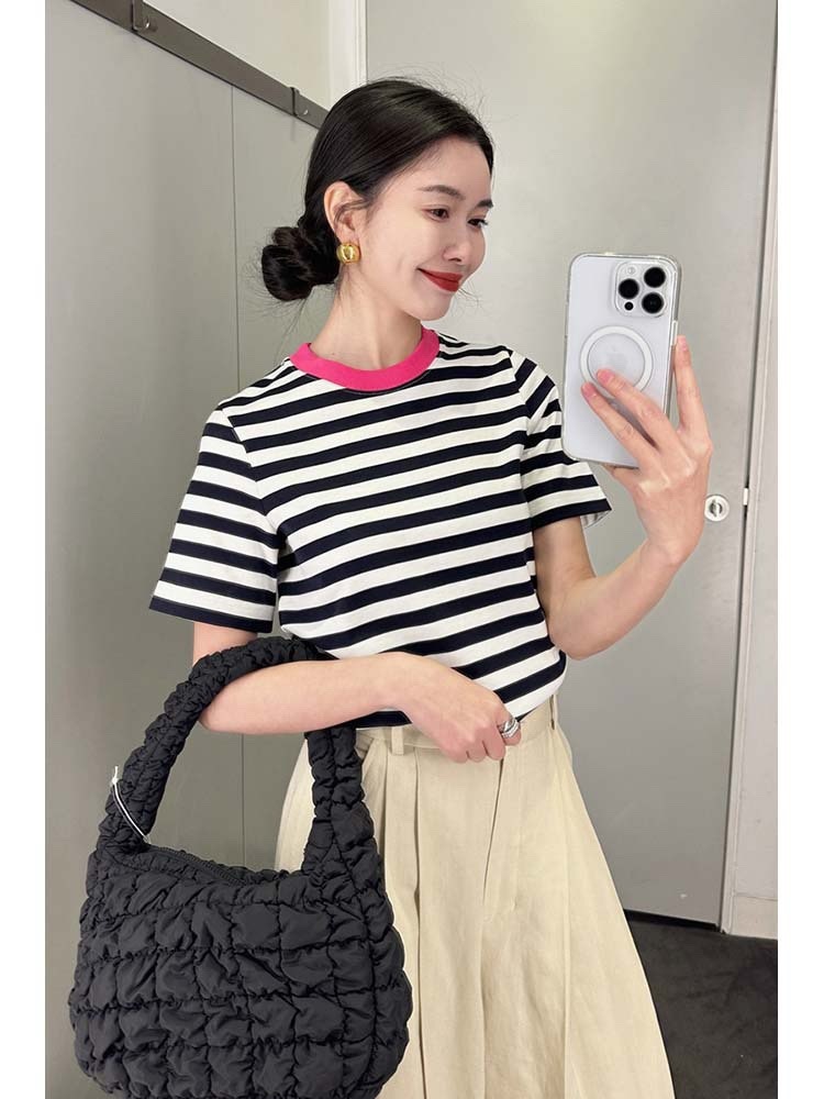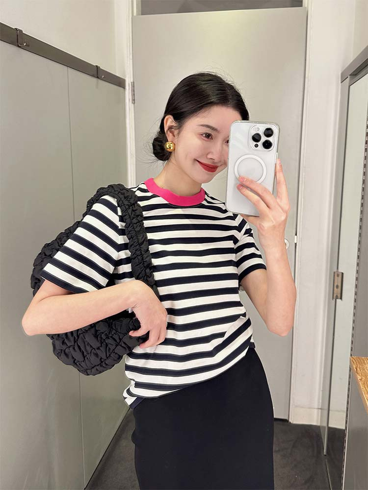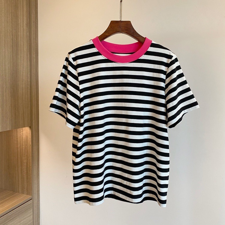 클리어 로즈 핑크 콘트라스트 컬러 칼라 스트라이프 티셔츠 여성용 풀오버 스웨터 반팔 스웨터 라운드 넥 짧은 한국 바닥 셔츠스토어 가기