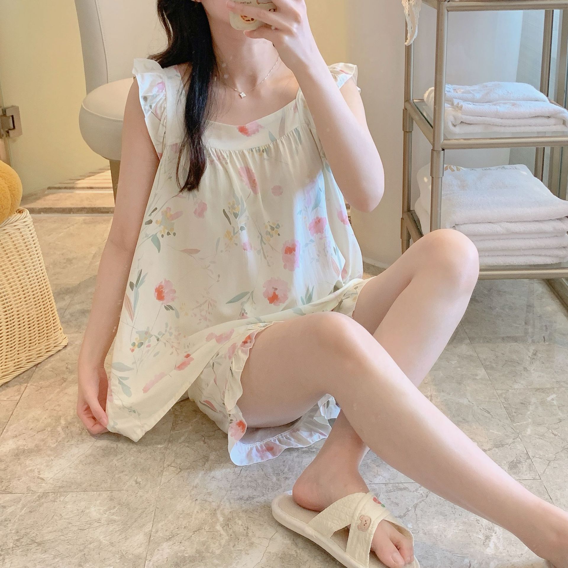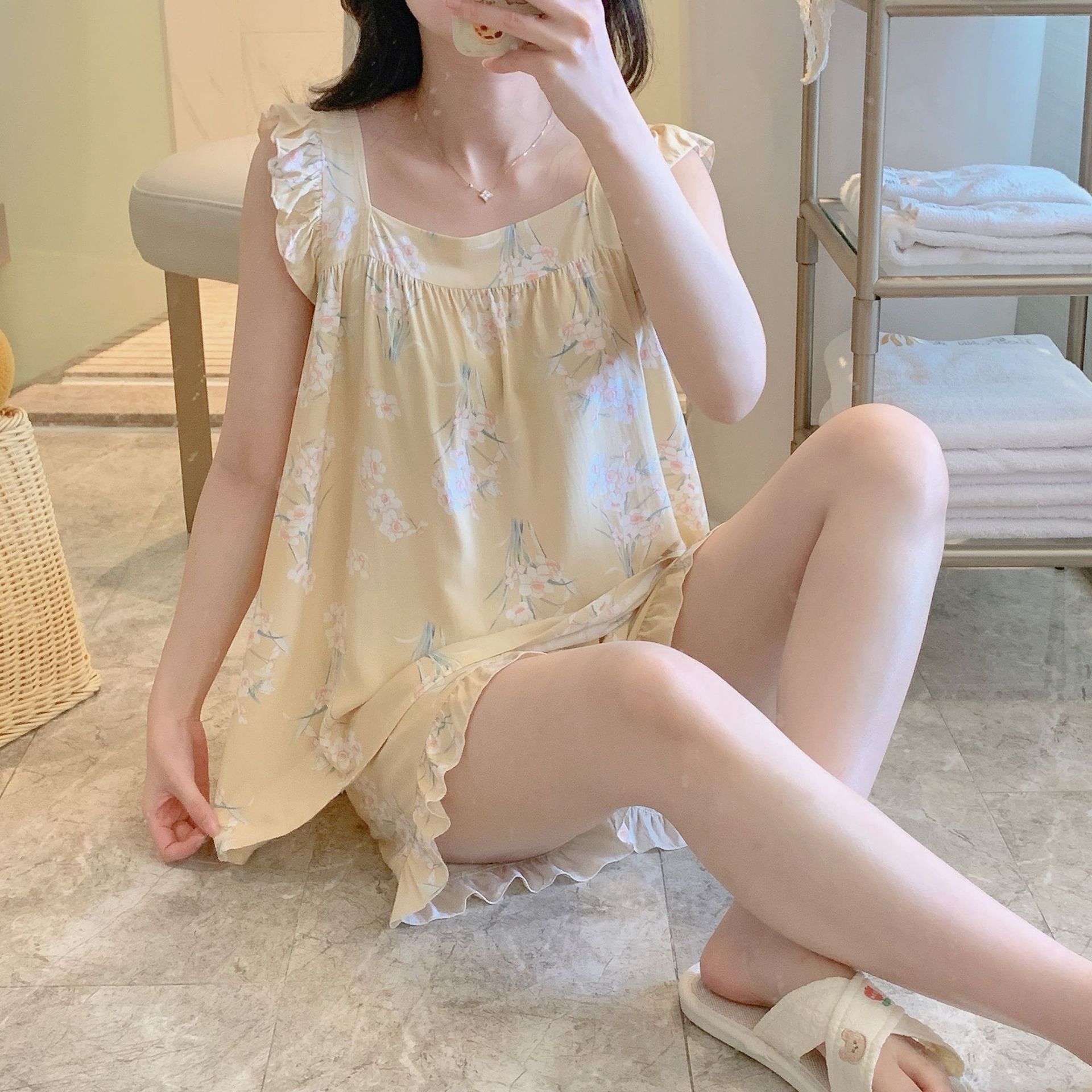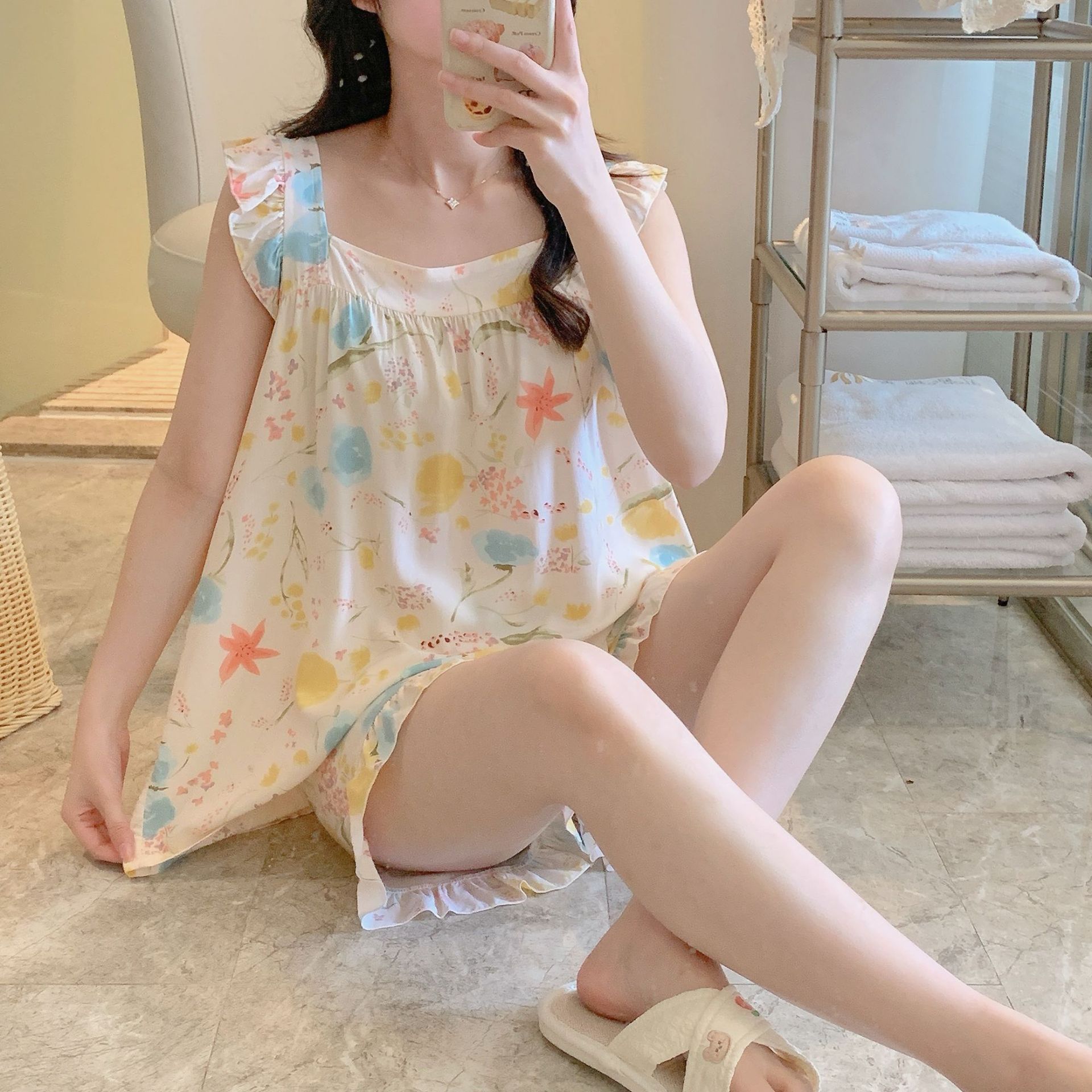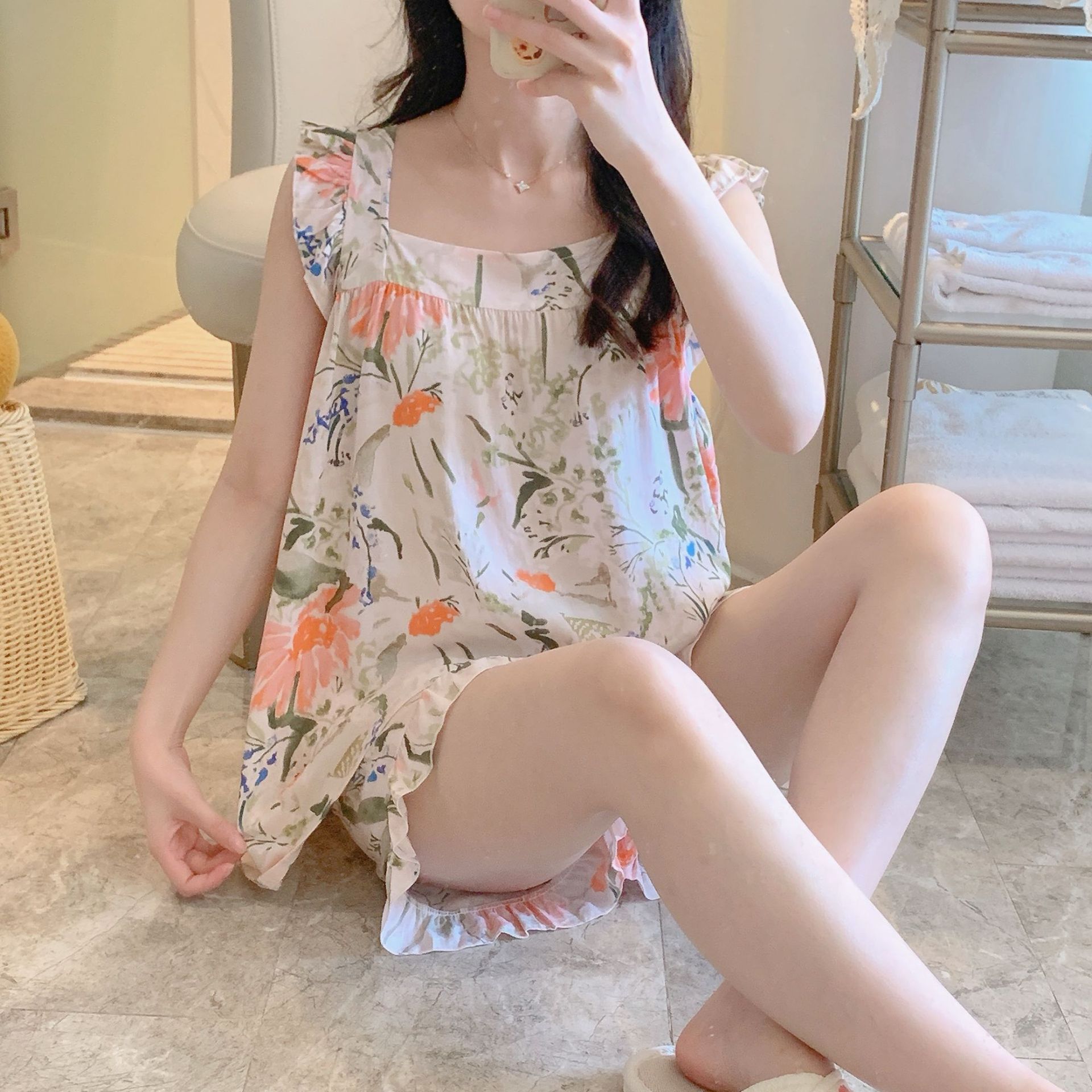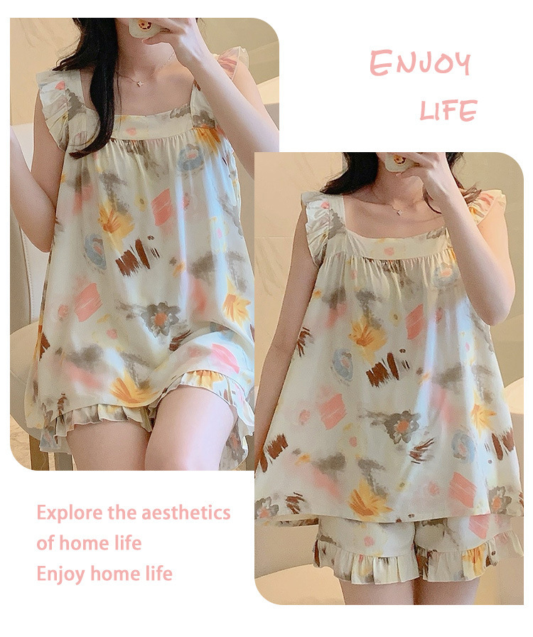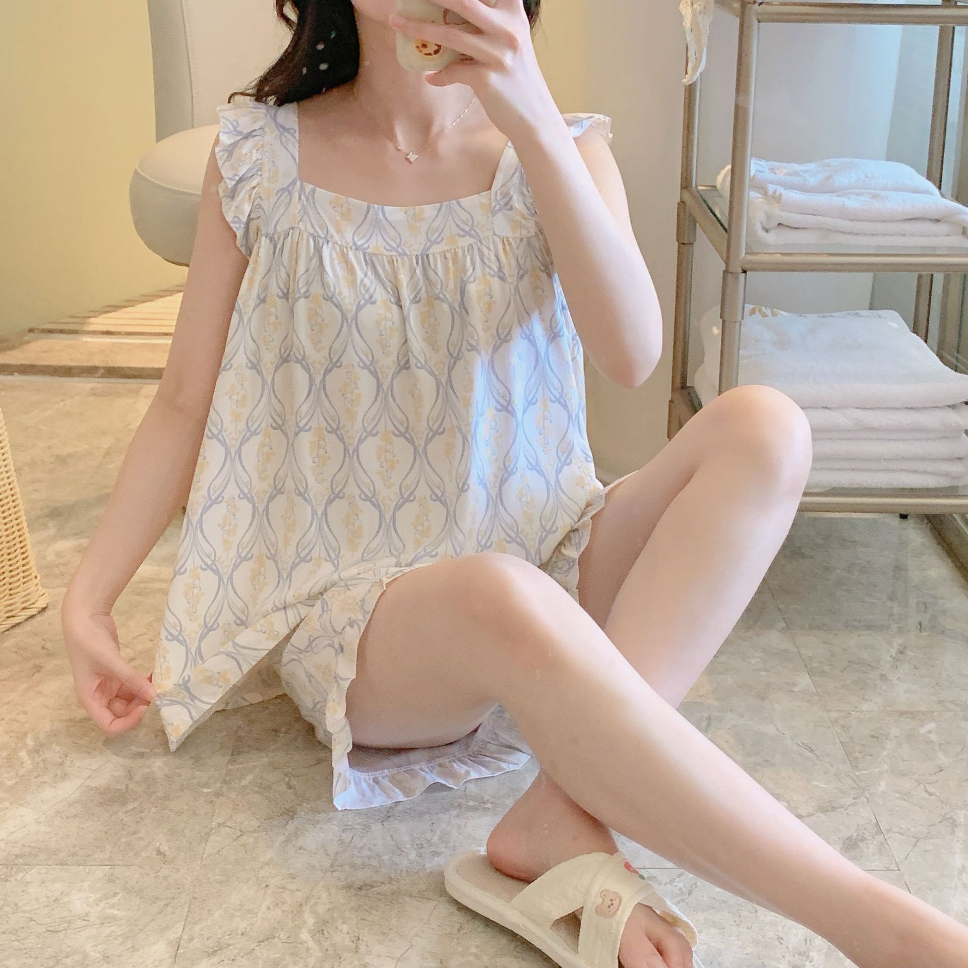 여성면 실크 잠옷 여름 새로운 달콤한 인쇄 야외 학생 반바지 세트 얇은 민소매 면화 실크 홈웨어스토어 가기