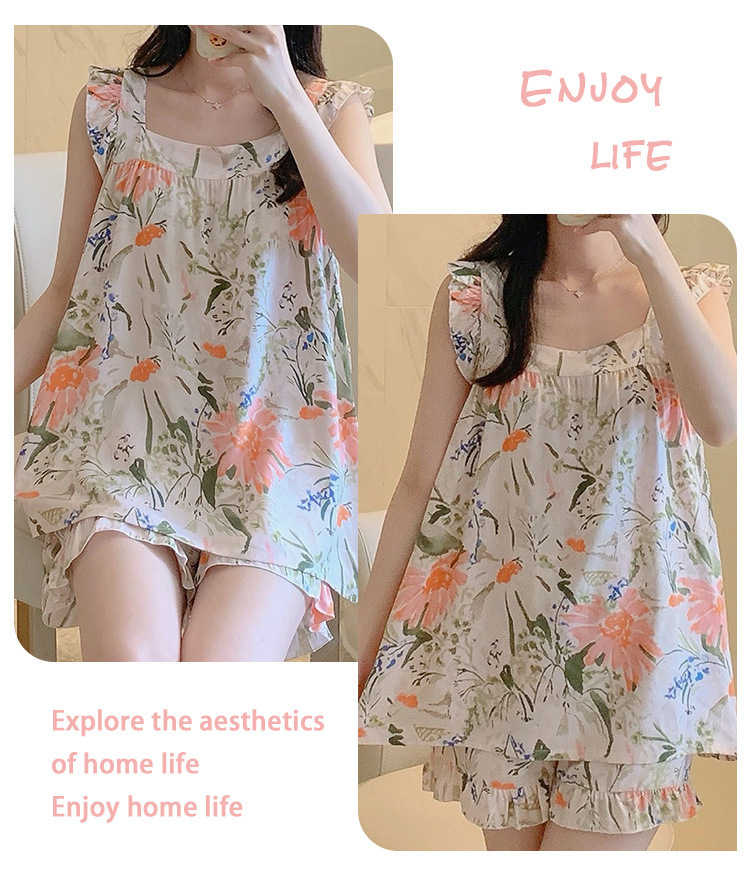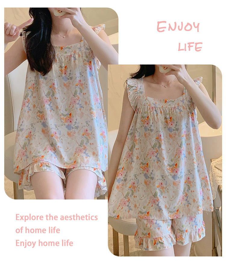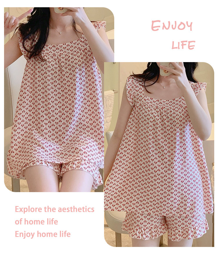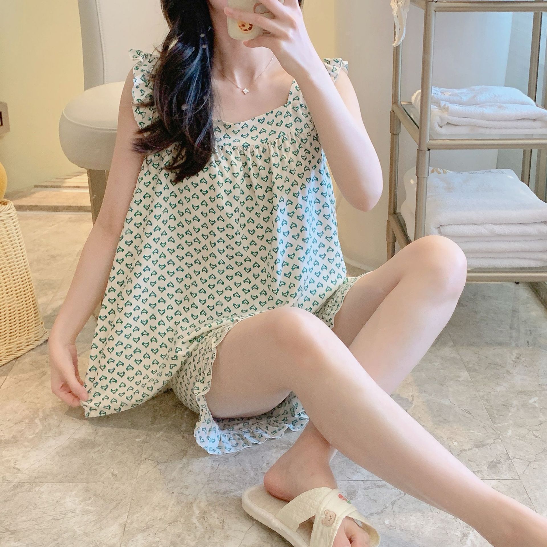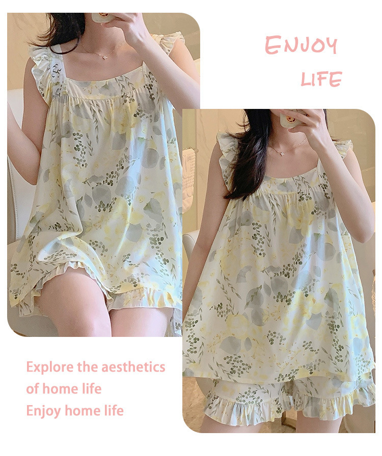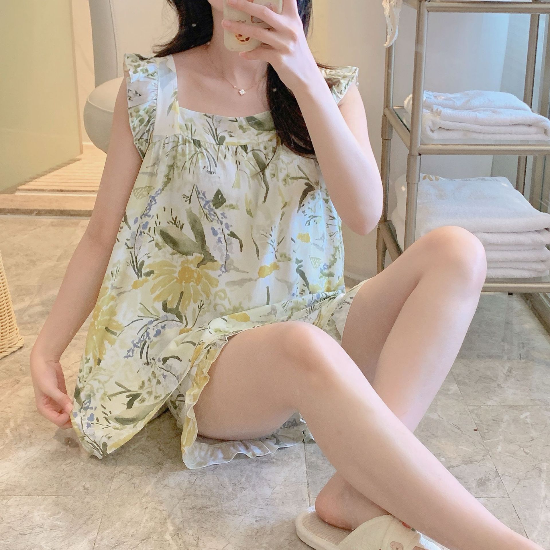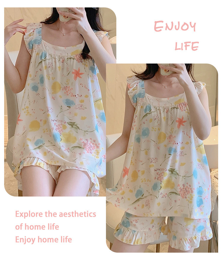 여성면 실크 잠옷 여름 새로운 달콤한 인쇄 야외 학생 반바지 세트 얇은 민소매 면화 실크 홈웨어스토어 가기