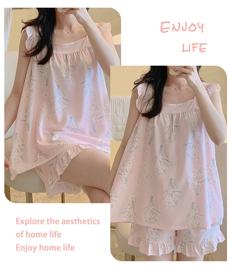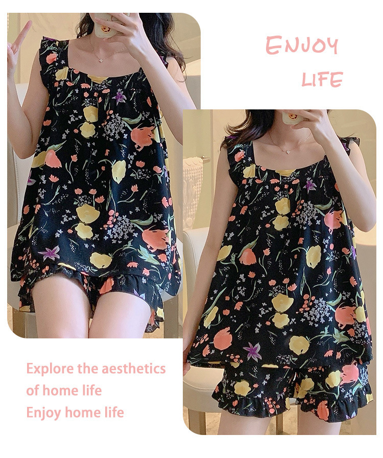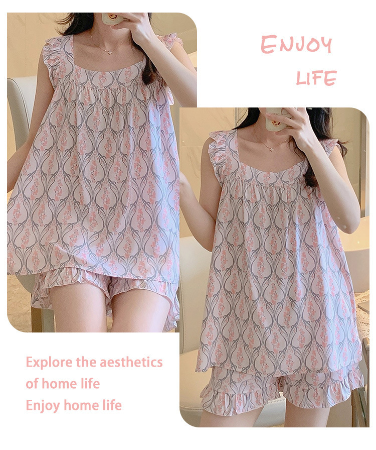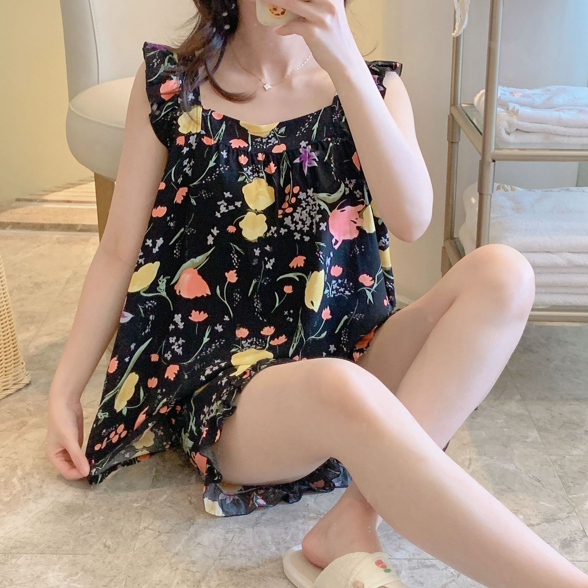 여성면 실크 잠옷 여름 새로운 달콤한 인쇄 야외 학생 반바지 세트 얇은 민소매 면화 실크 홈웨어
