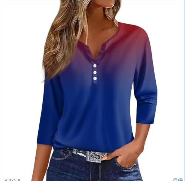 아마존 인기 여성 티셔츠 브이넥 3버튼 프린트 반팔 유럽과 미국 여성 헨리 셔츠 7부소매