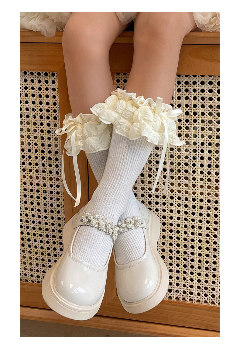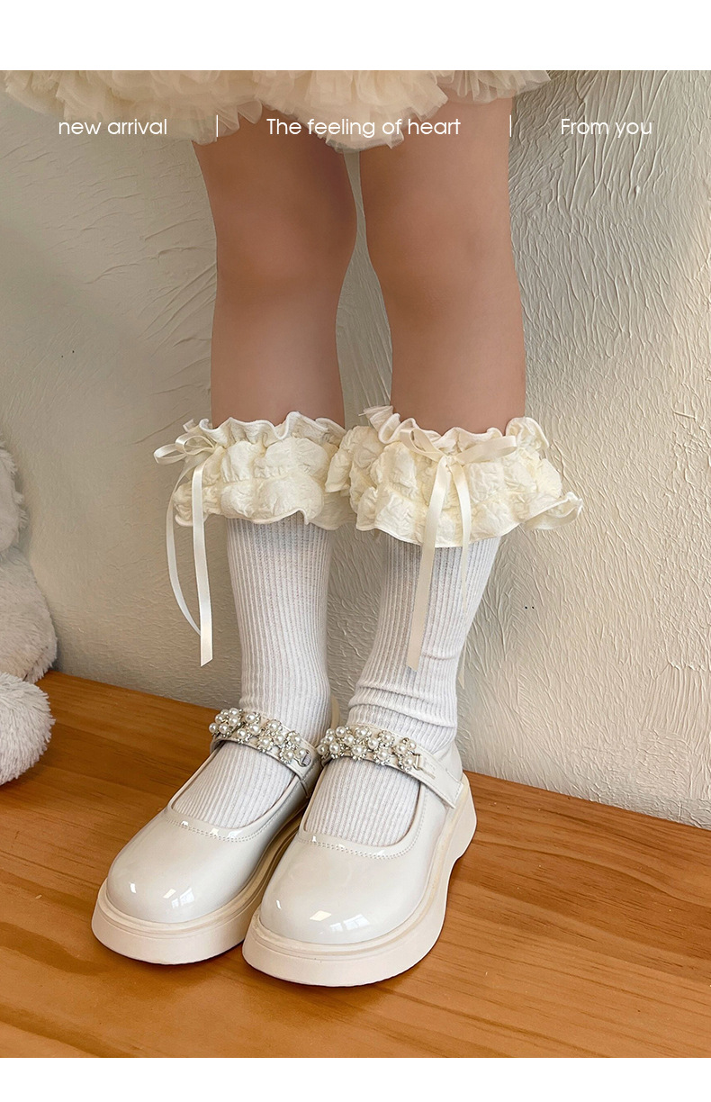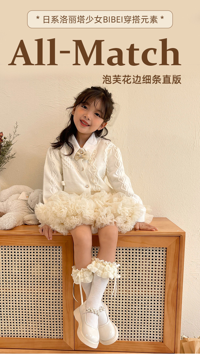 2024 봄 새로운 퍼프 레이스 얇은 세로 줄무늬 어린이 중간 종아리 양말 Lolita 스트레이트 소녀의 종아리 양말스토어 가기