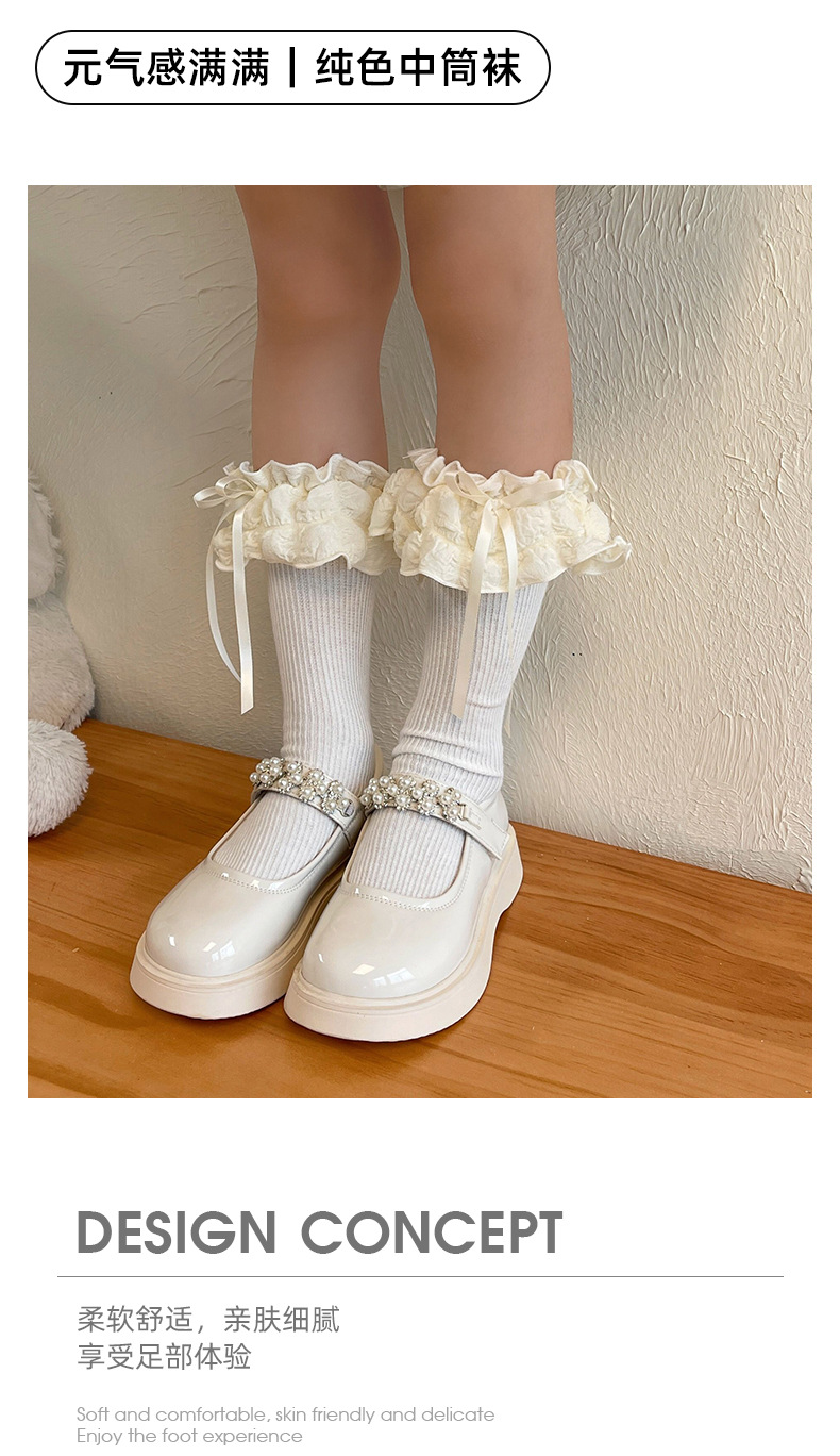 2024 봄 새로운 퍼프 레이스 얇은 세로 줄무늬 어린이 중간 종아리 양말 Lolita 스트레이트 소녀의 종아리 양말