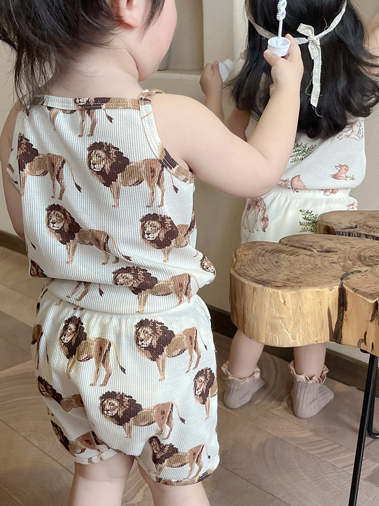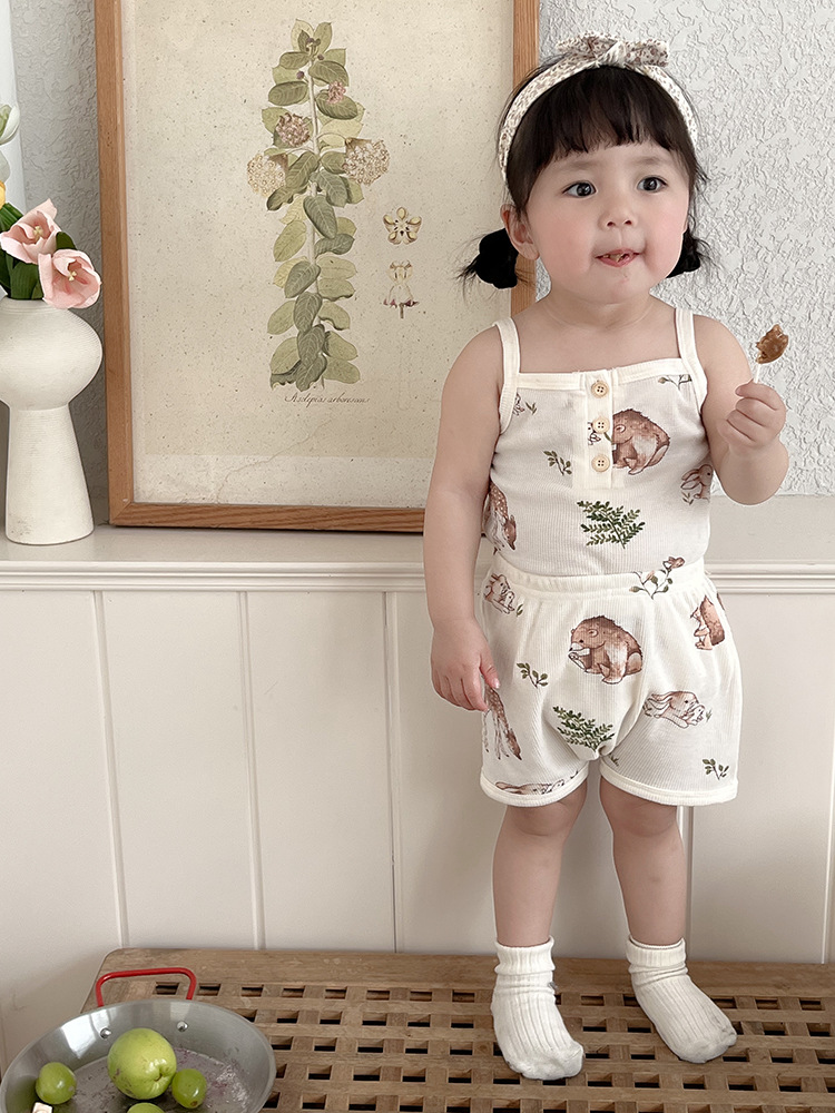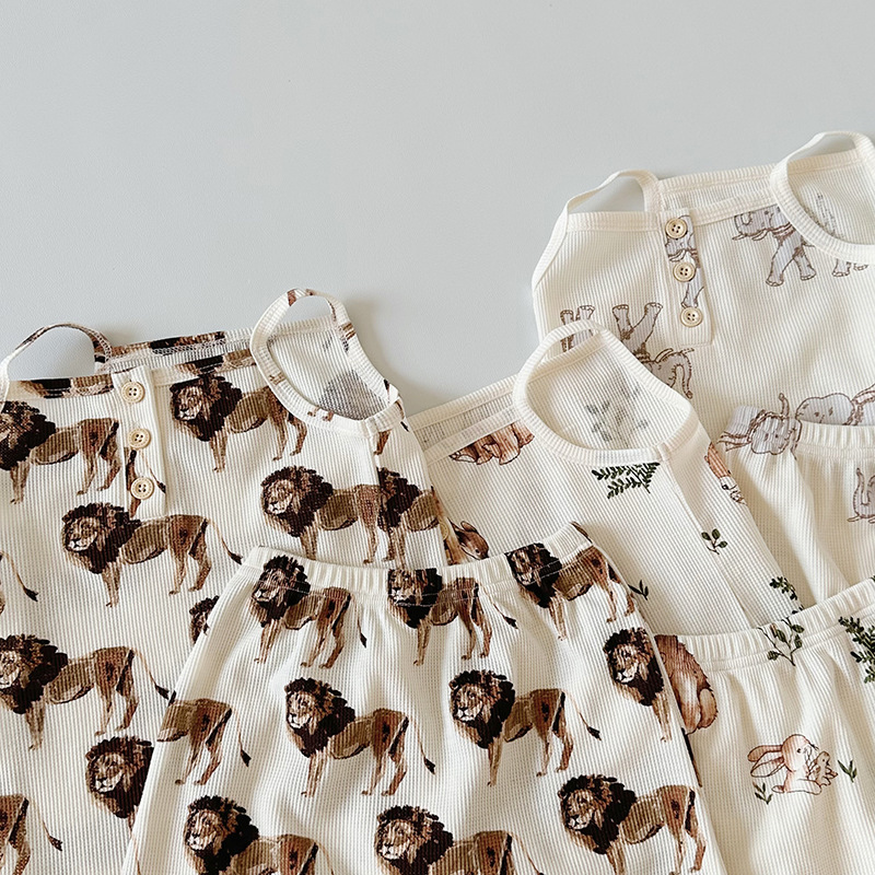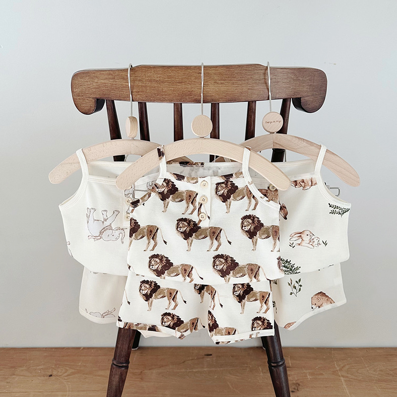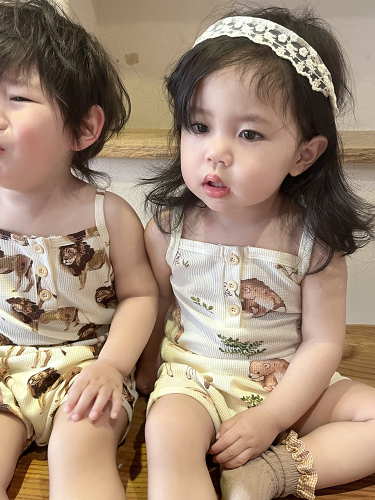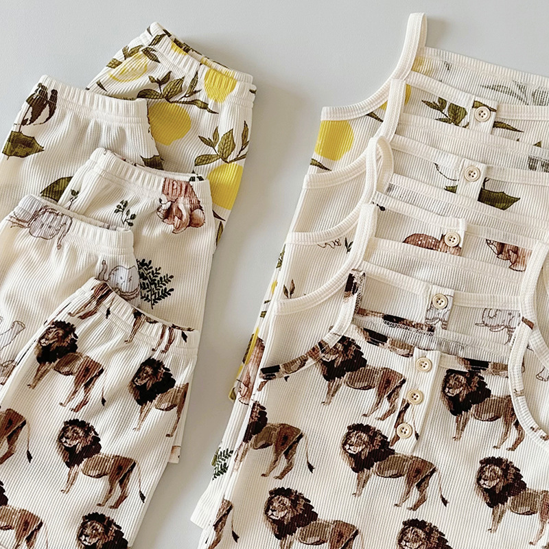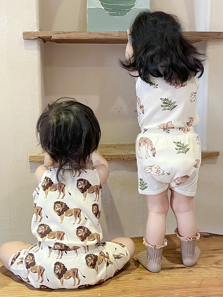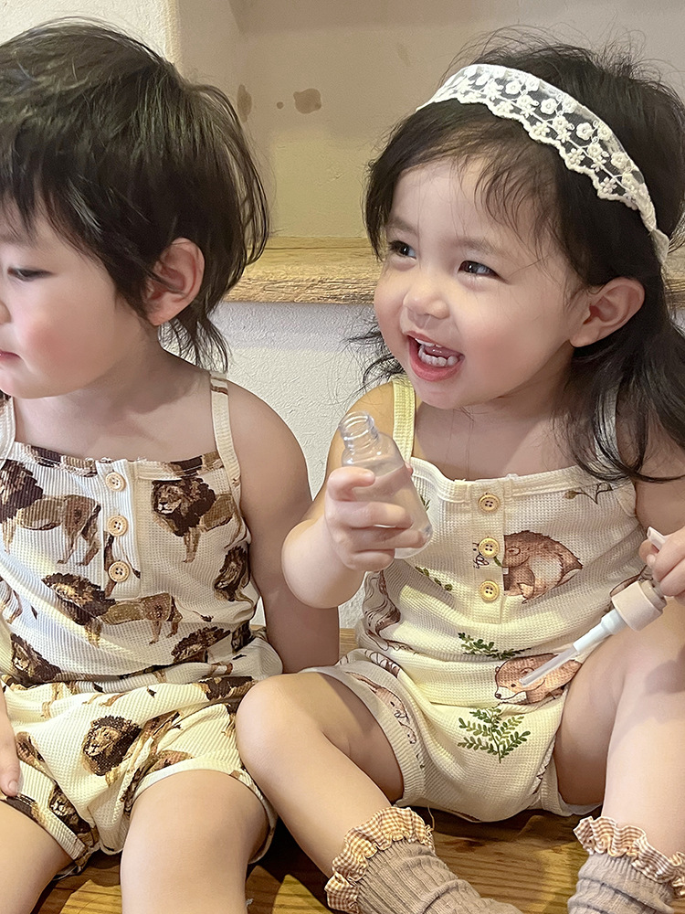2024 여름 북유럽 스타일 어린이 잠옷 순수한면 와플 소녀 홈웨어 베이비 조끼 캐미솔 세트