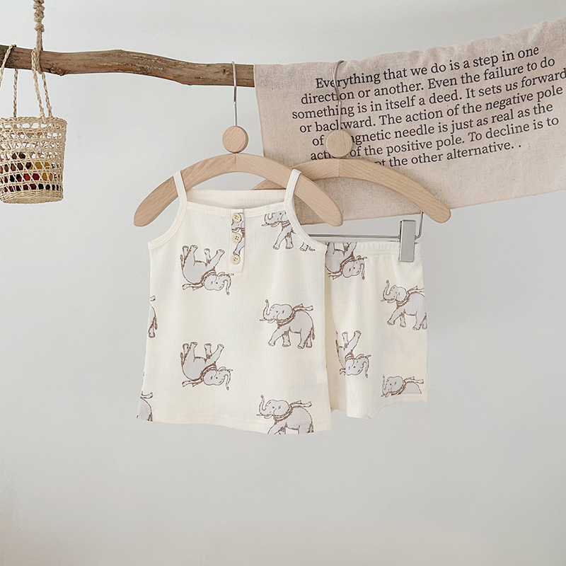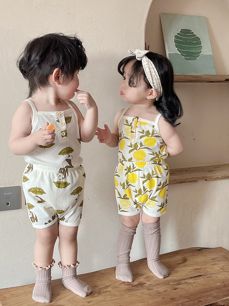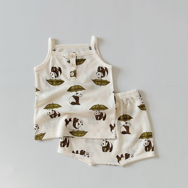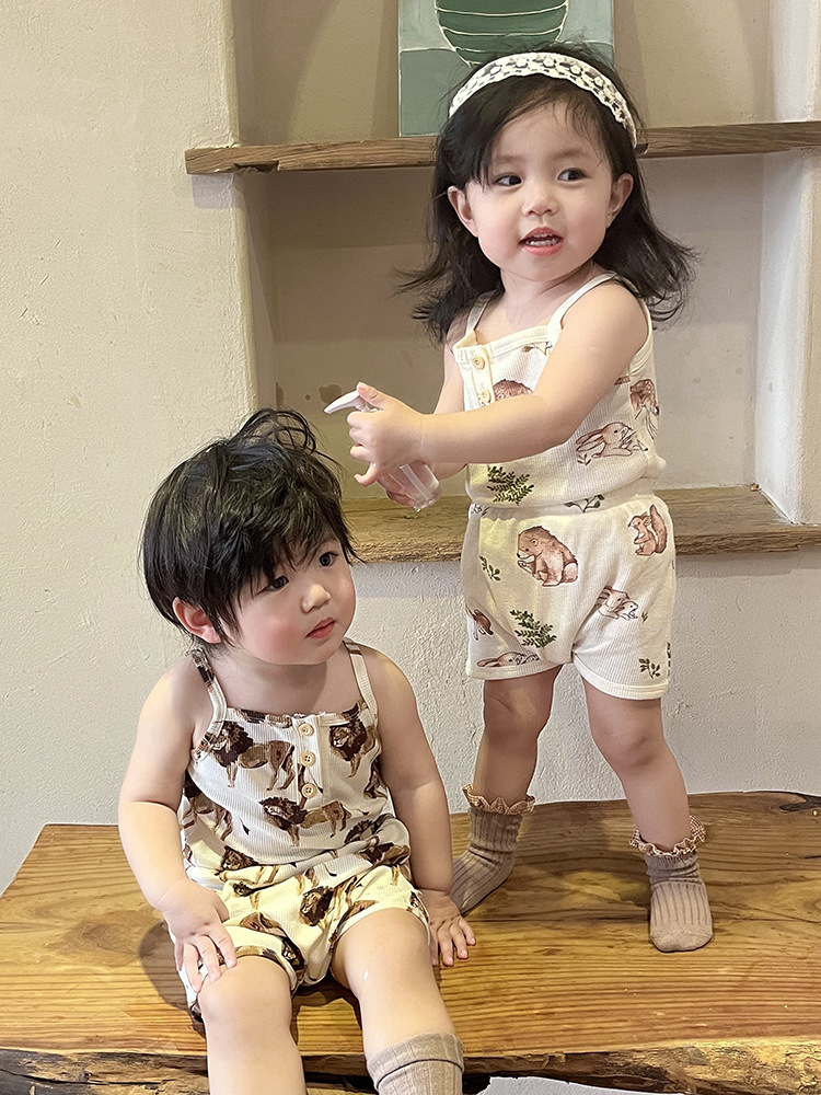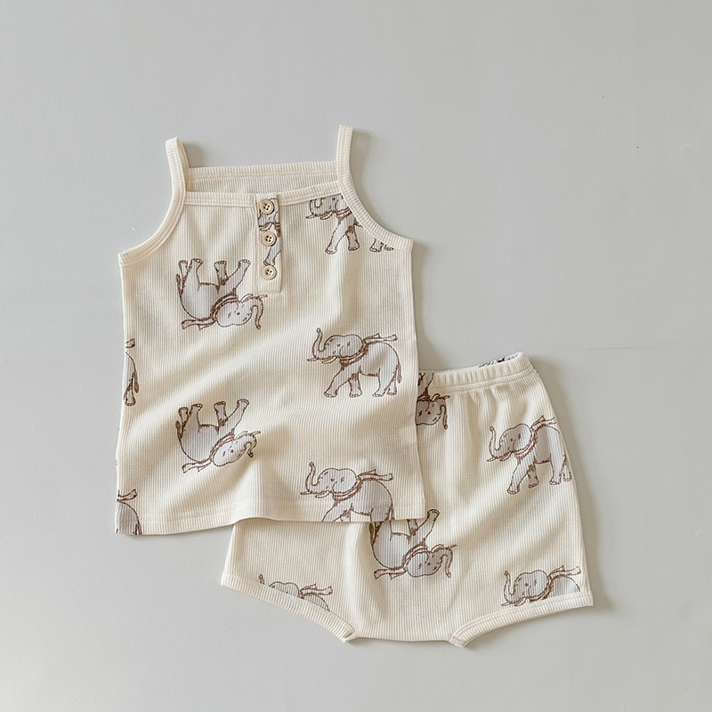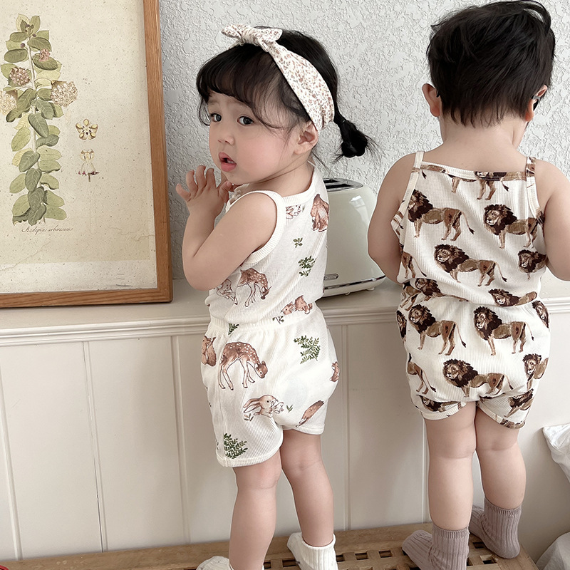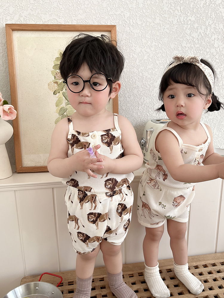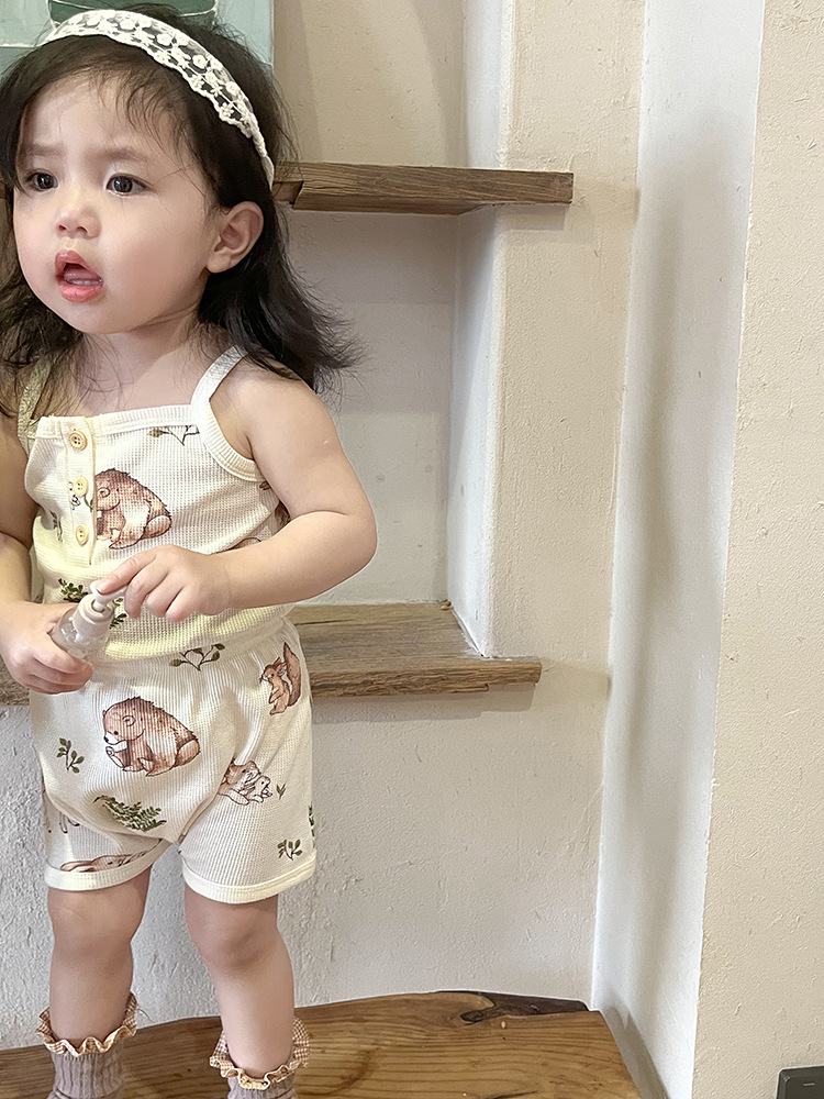 2024 여름 북유럽 스타일 어린이 잠옷 순수한면 와플 소녀 홈웨어 베이비 조끼 캐미솔 세트