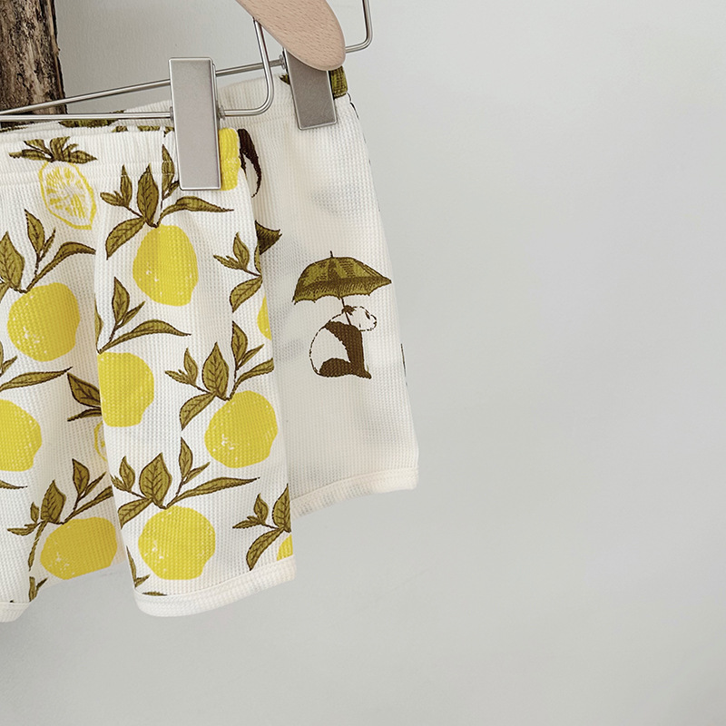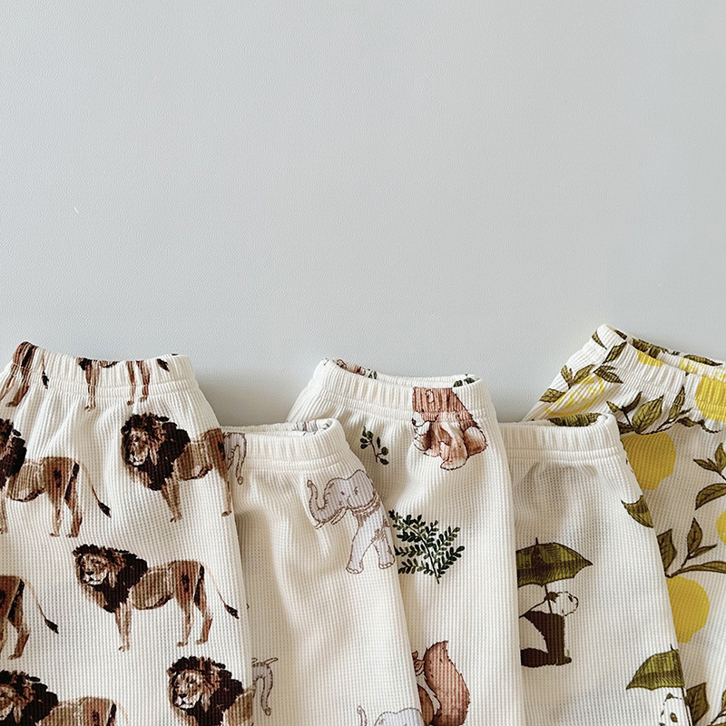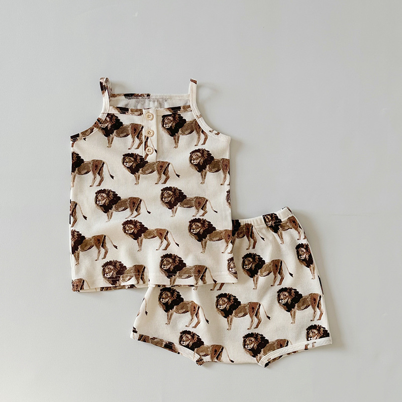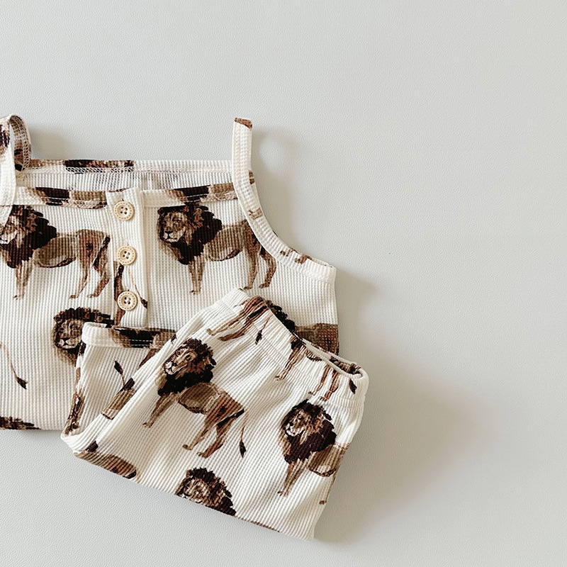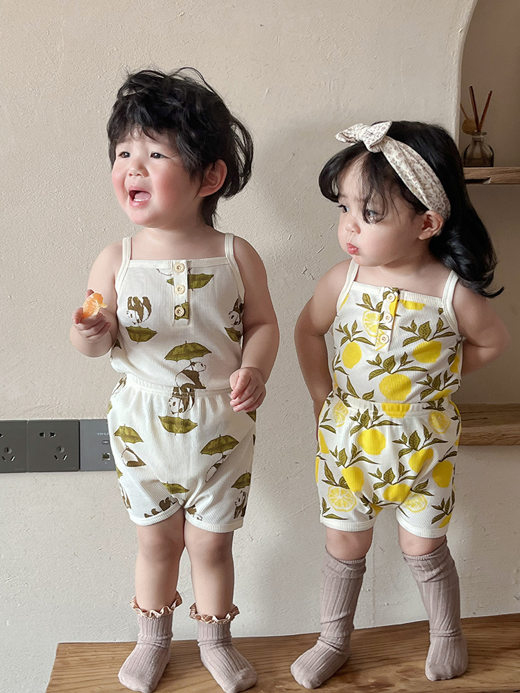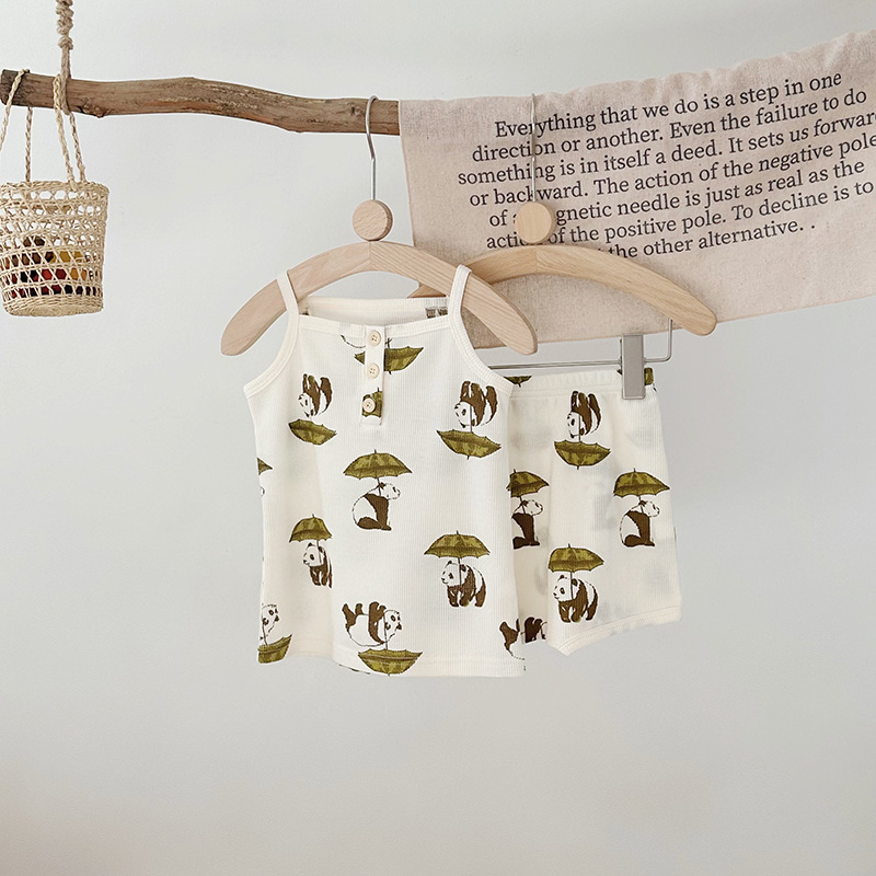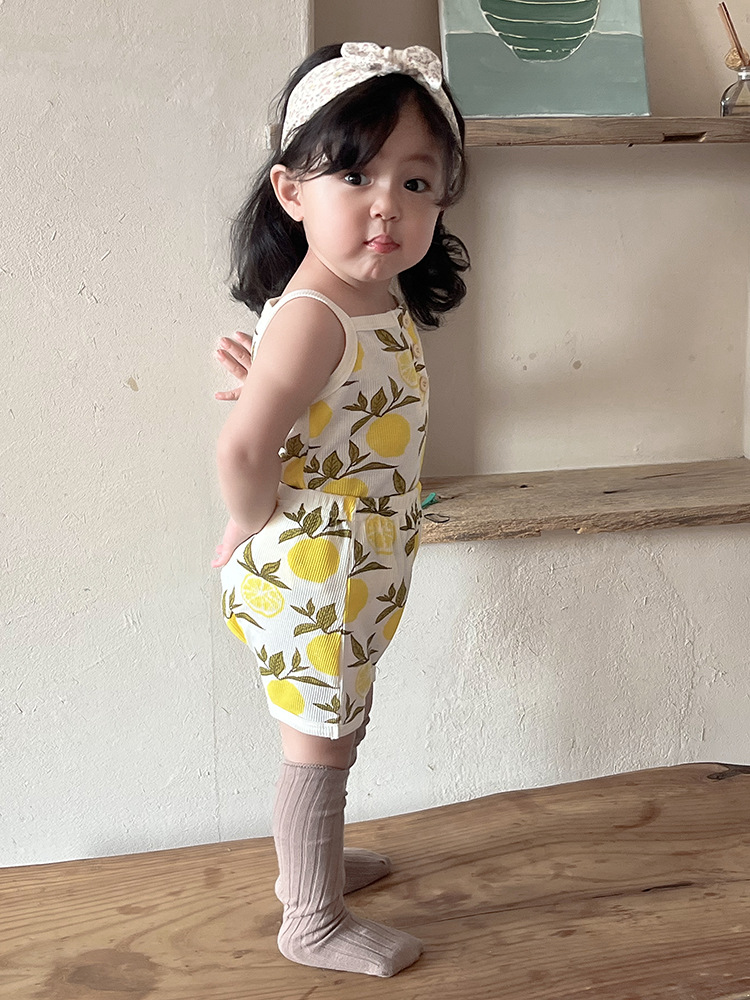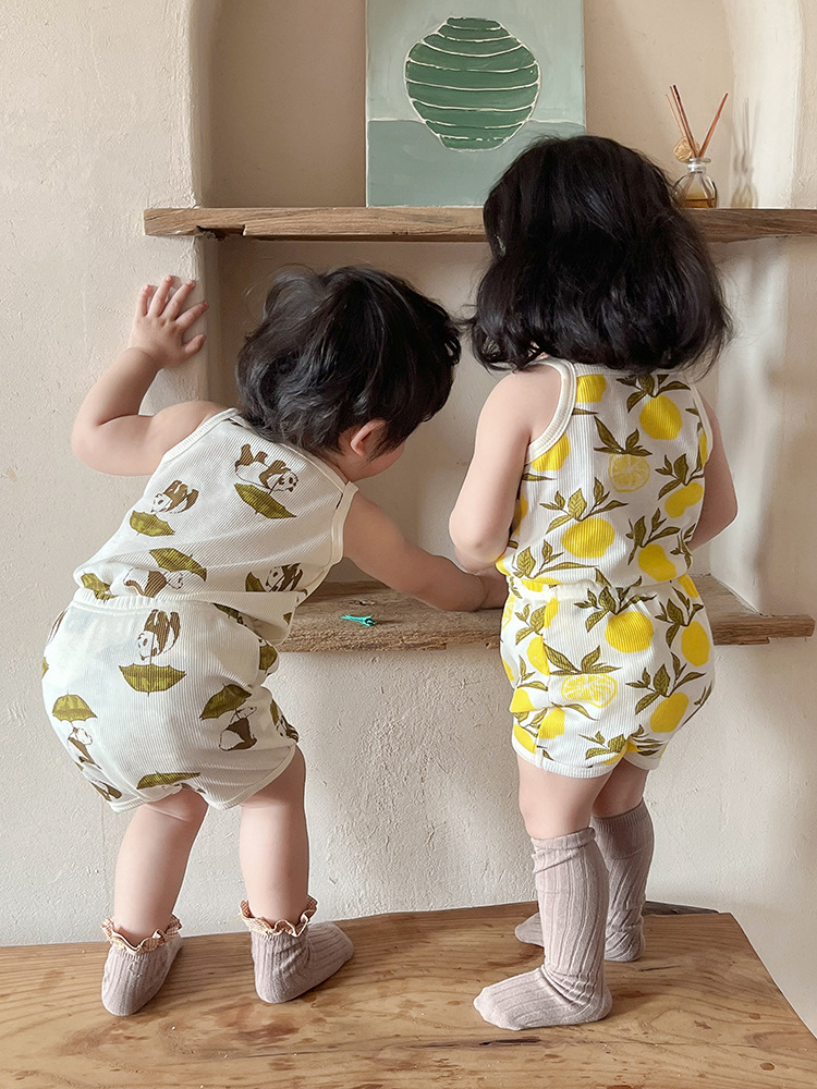 2024 여름 북유럽 스타일 어린이 잠옷 순수한면 와플 소녀 홈웨어 베이비 조끼 캐미솔 세트