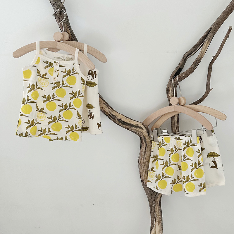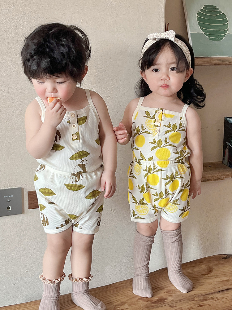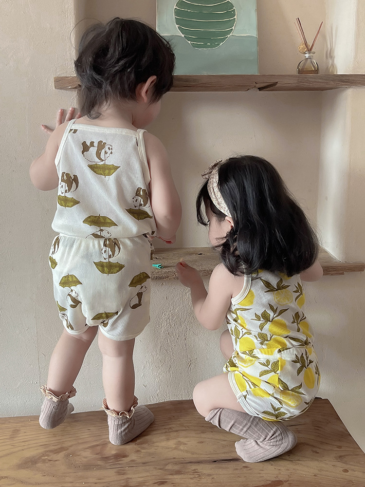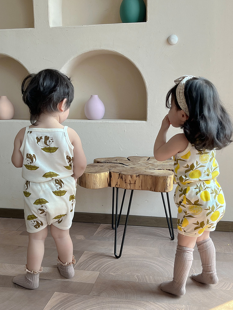 2024 여름 북유럽 스타일 어린이 잠옷 순수한면 와플 소녀 홈웨어 베이비 조끼 캐미솔 세트스토어 가기