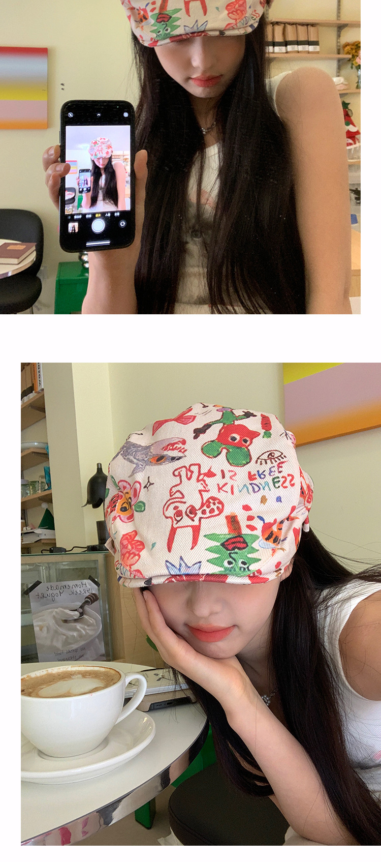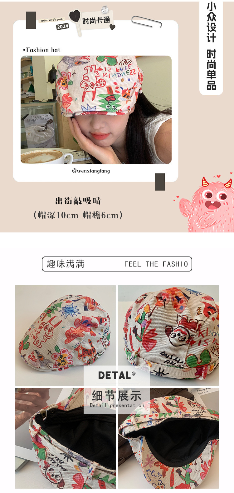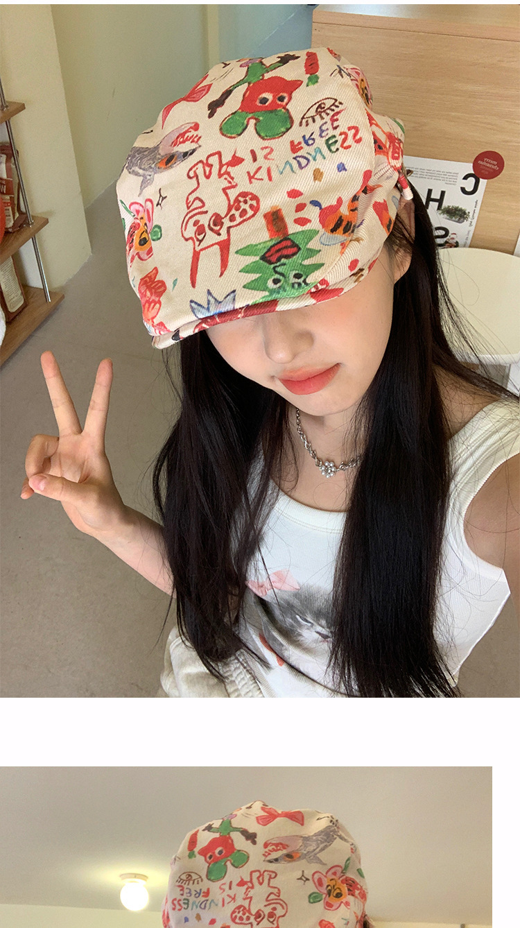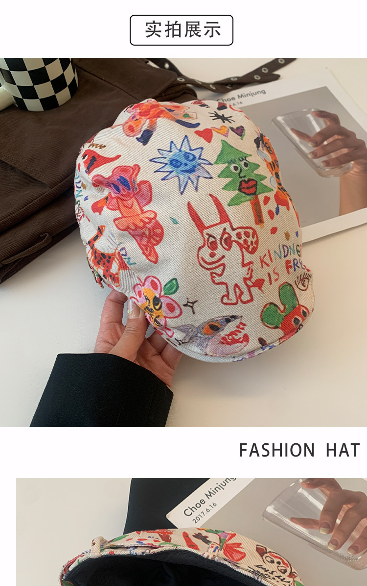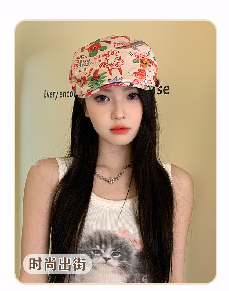 한국 스타일 낙서 화려한 앞으로 모자 여성 성격 복고풍 어린이 베레모 재미 짧은 챙이 화가 모자 다재다능한 패션스토어 가기