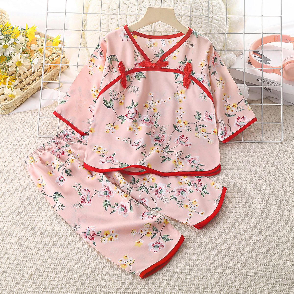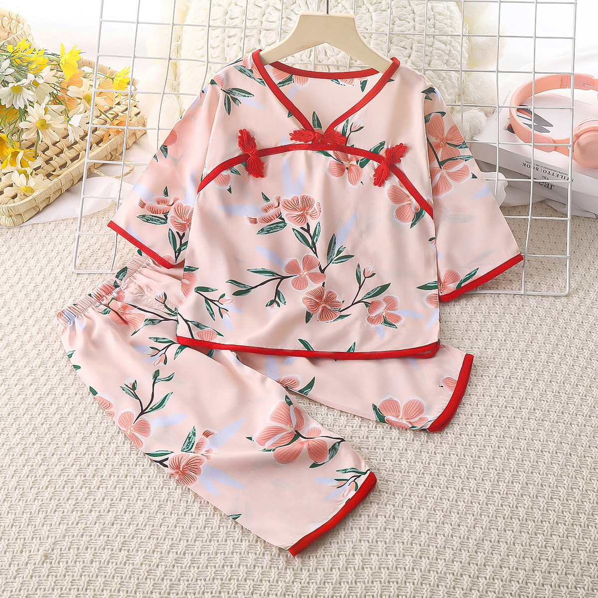 • 코튼 실크 버클 긴팔 바지 세트 핑크 가지 꽃