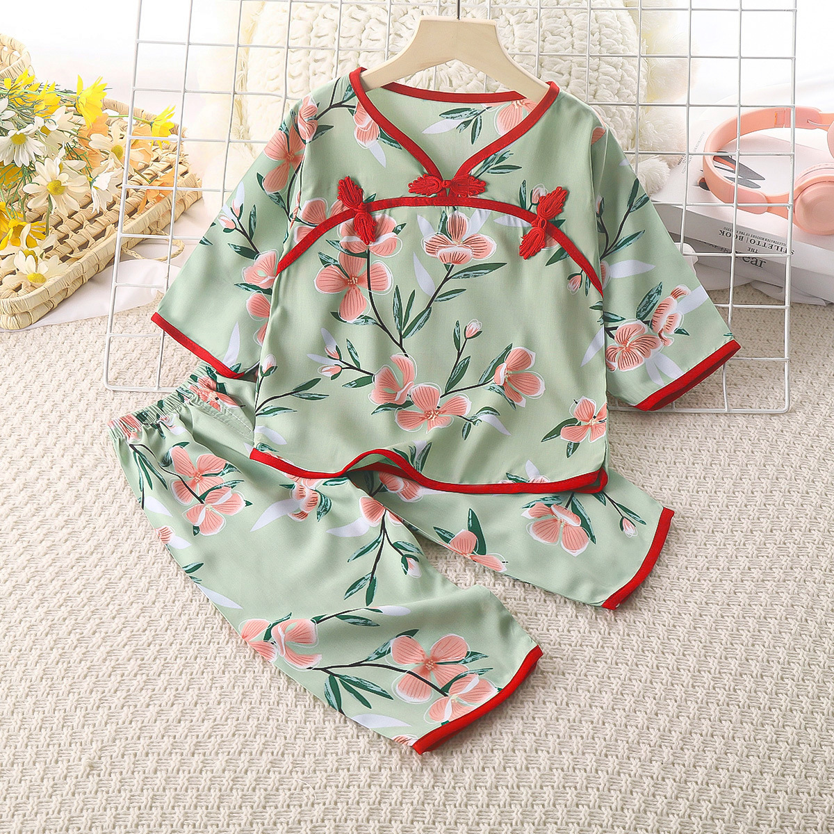 • 코튼 실크 버클 긴팔 바지 세트 녹색 가지 꽃