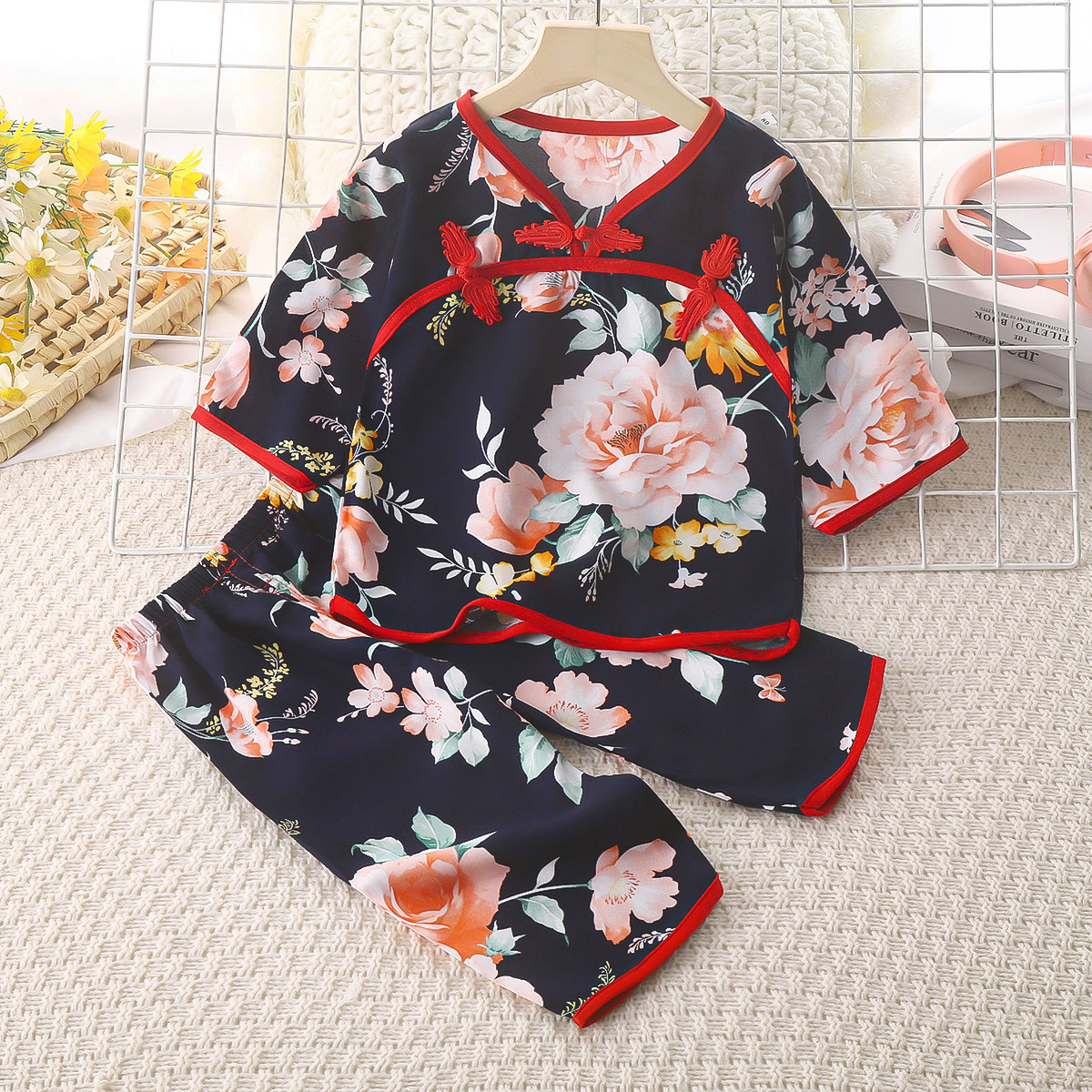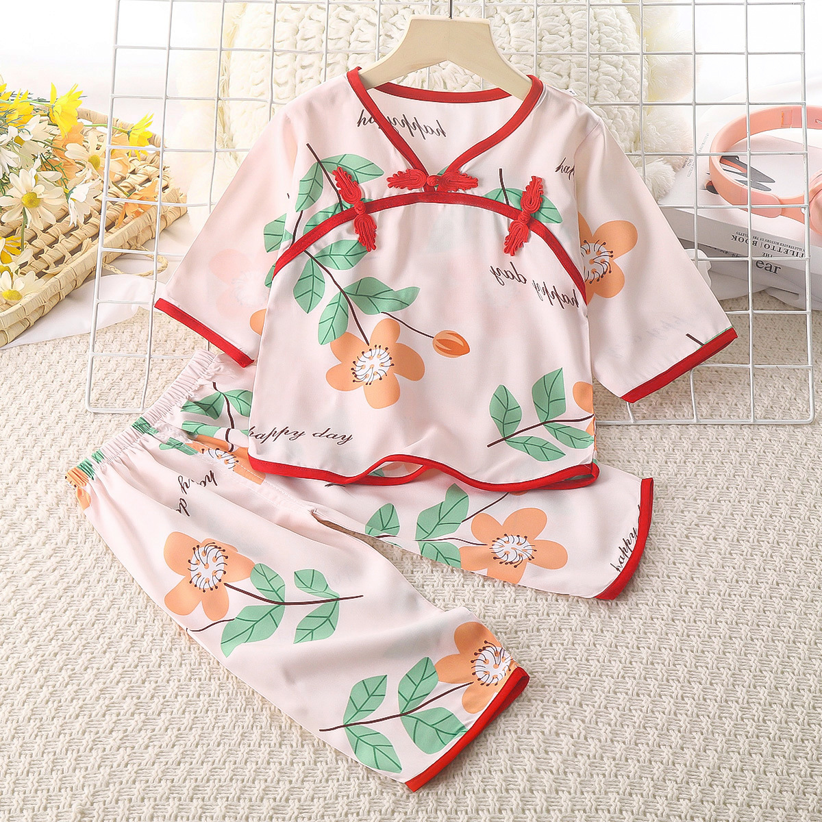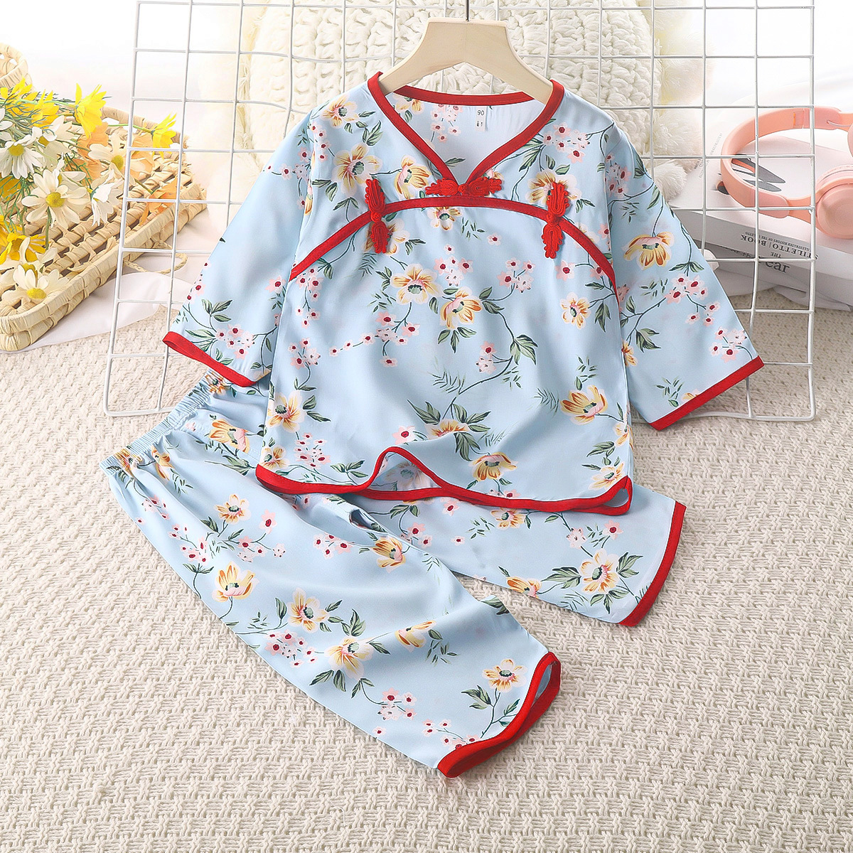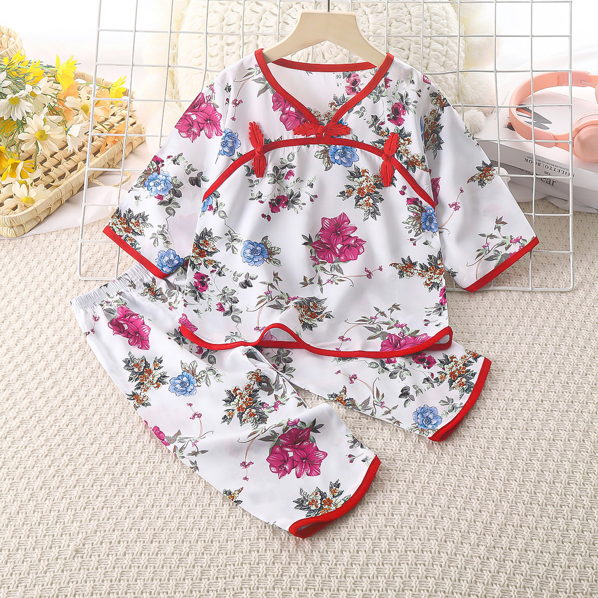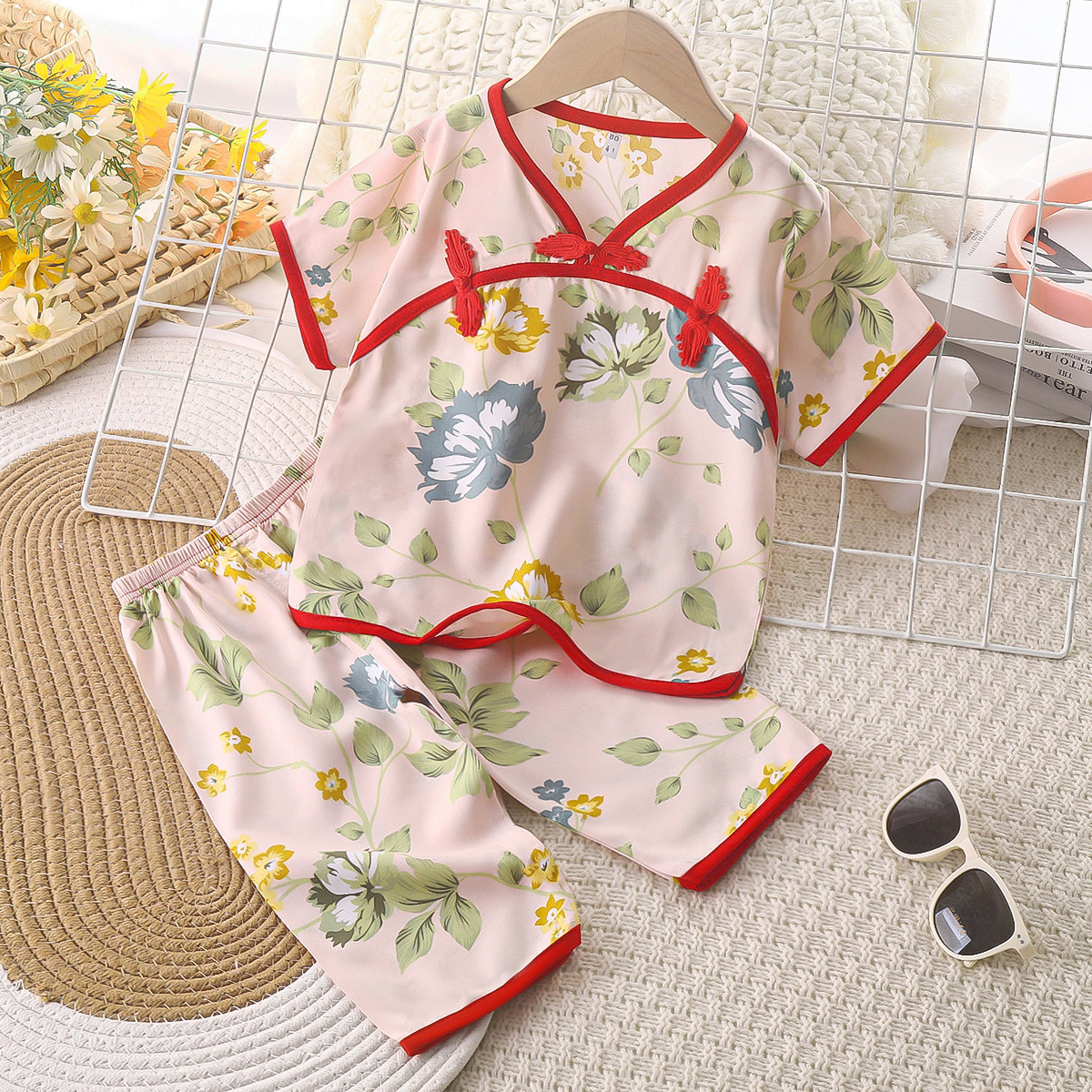 여름 새로운 풀오버 얇은 통기성 인공 면화 어린이 세트 버클 민족 스타일 긴소매 바지 면 실크 세트