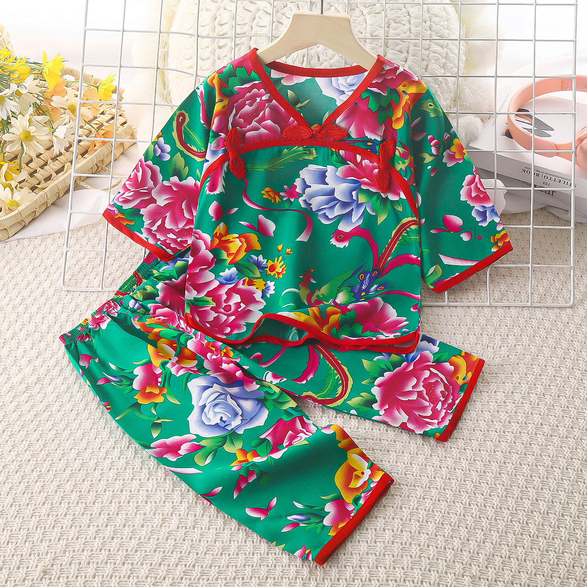 • 코튼 실크 버클 긴팔 바지 세트-그린 모란
