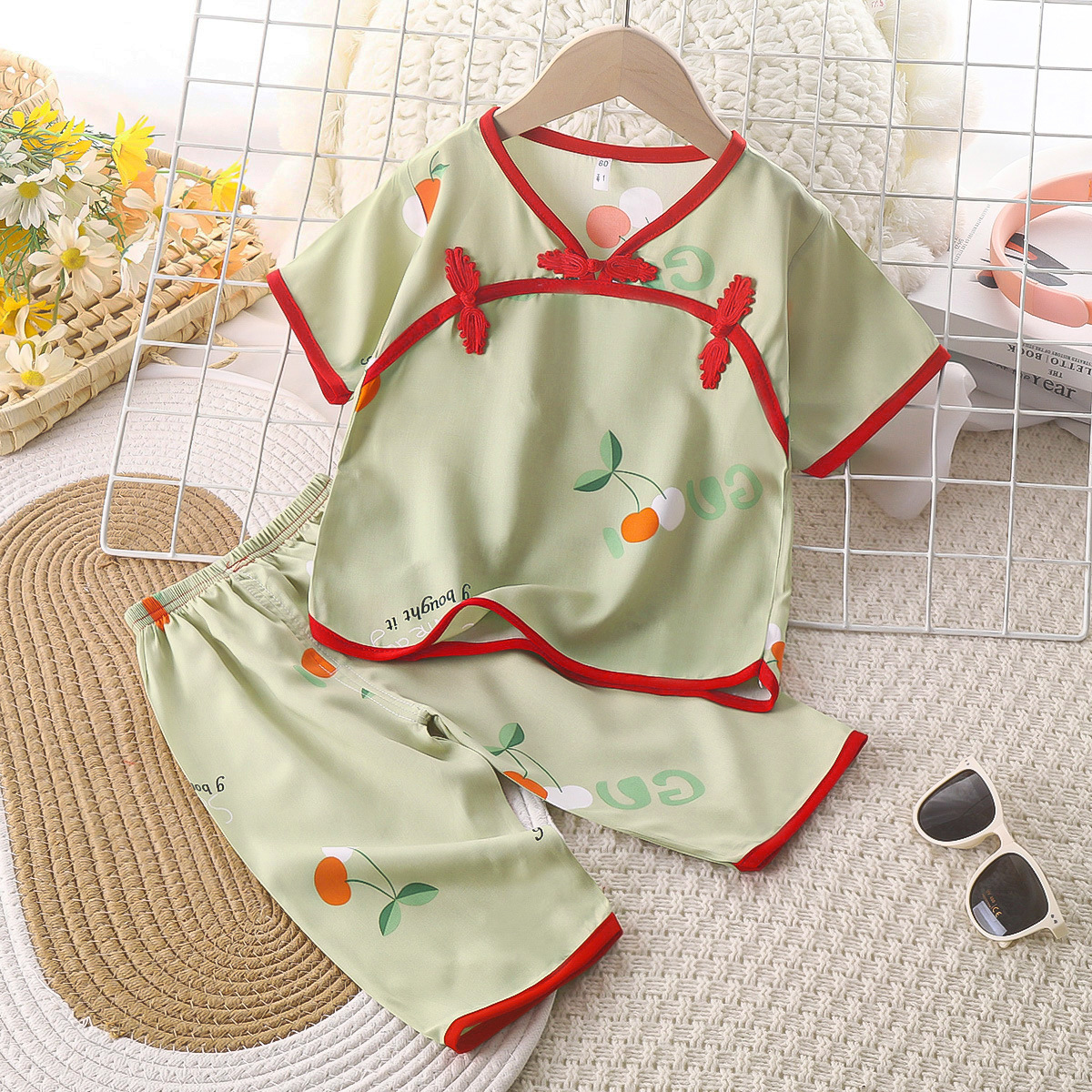 여름 새로운 풀오버 얇은 통기성 인공 면화 어린이 세트 버클 민족 스타일 긴소매 바지 면 실크 세트스토어 가기