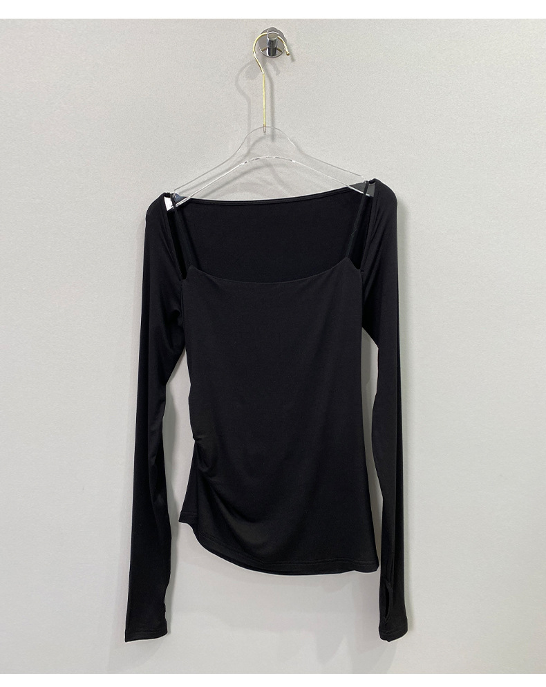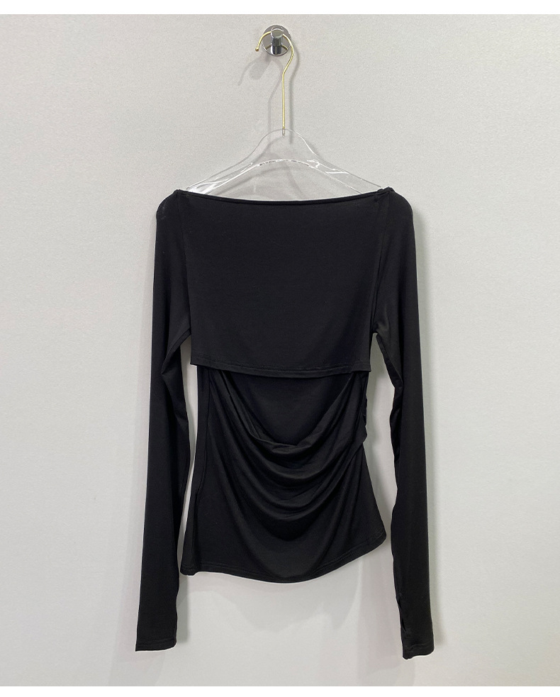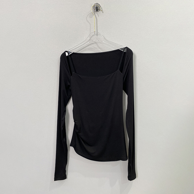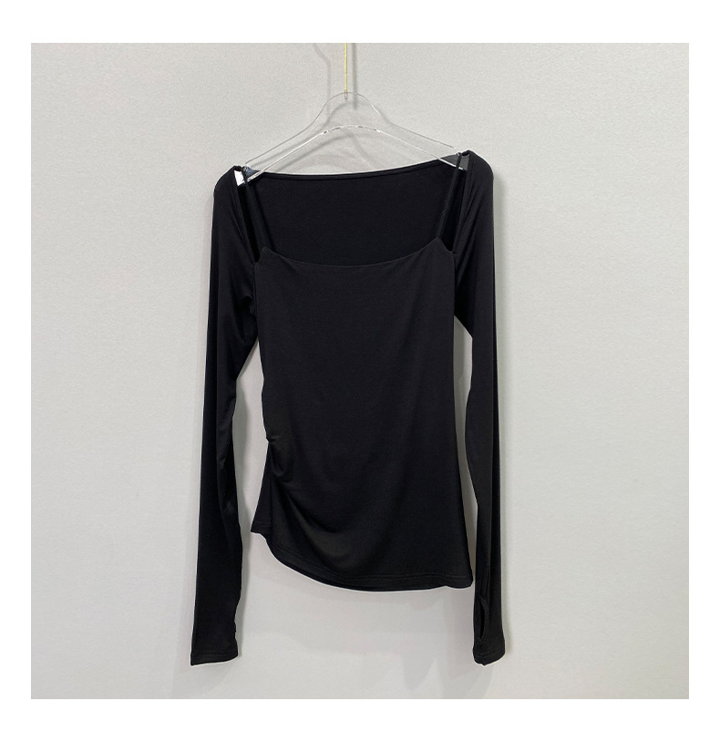 가짜 투피스 블랙 티셔츠 여성용 틈새 2024 봄과 여름 새로운 섹시한 슬림베이스 셔츠 긴 소매 스퀘어 칼라 탑