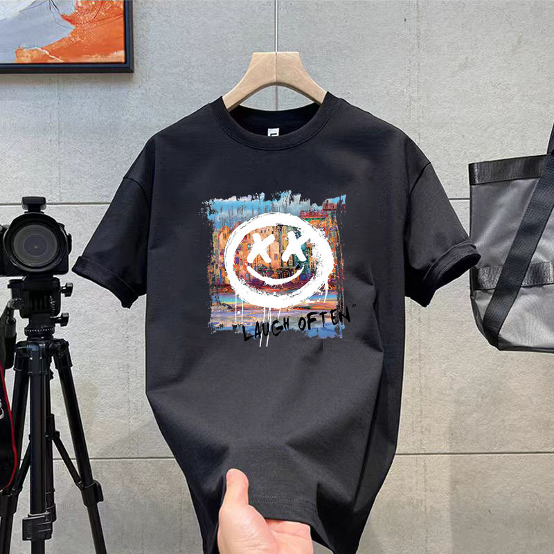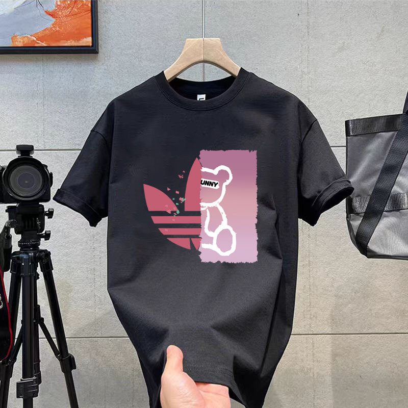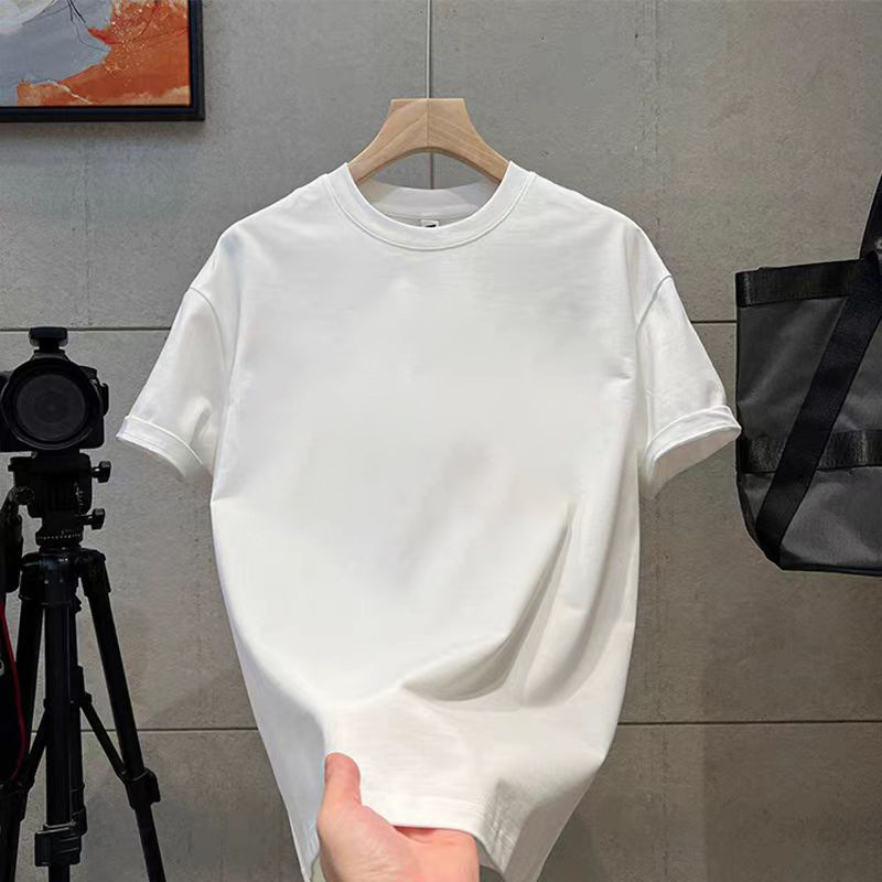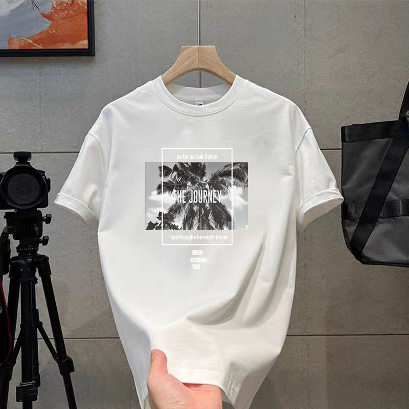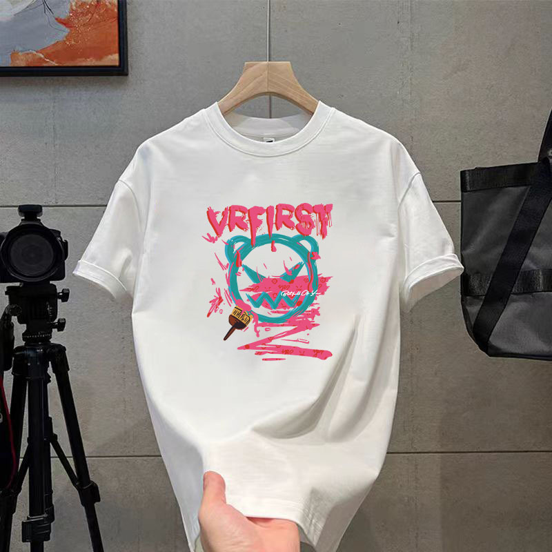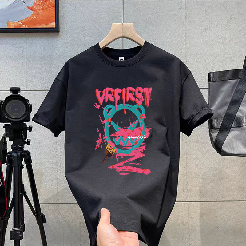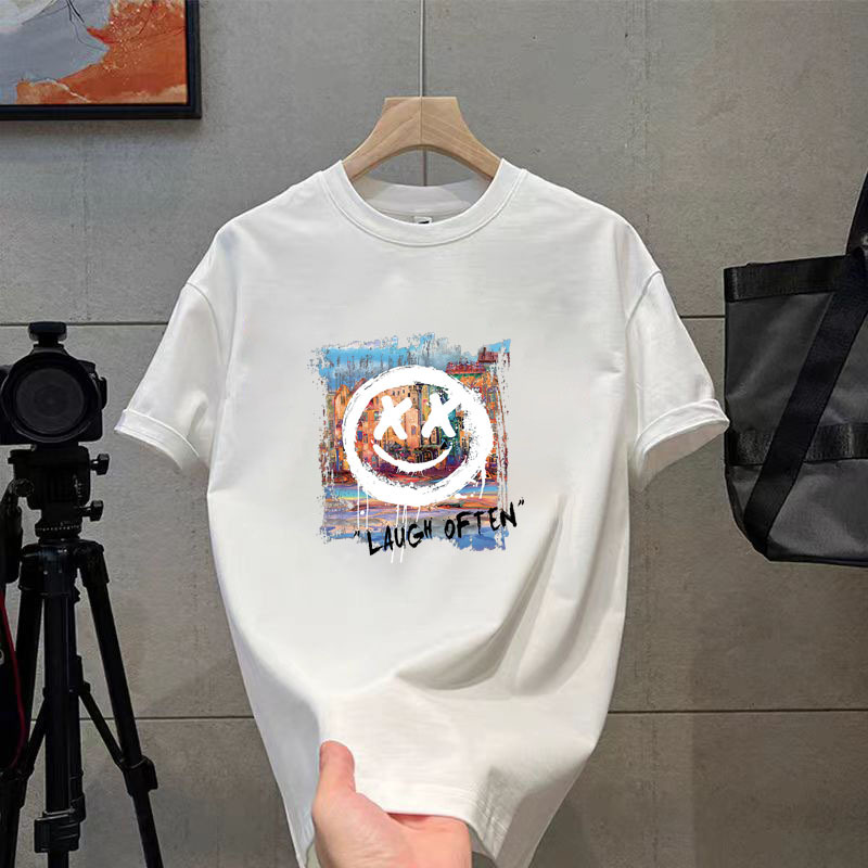 코튼 티셔츠 2024 여름 패션 브랜드 캐주얼 새로운 남성 느슨한 플러스 사이즈 둥근 목 프린트 바닥 셔츠 짧은 소매