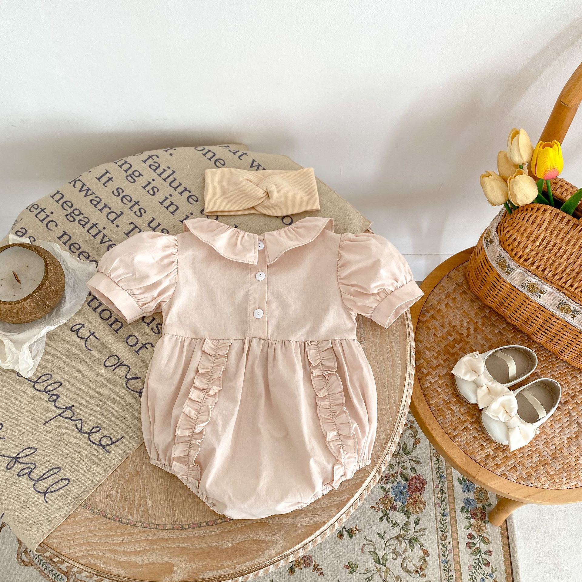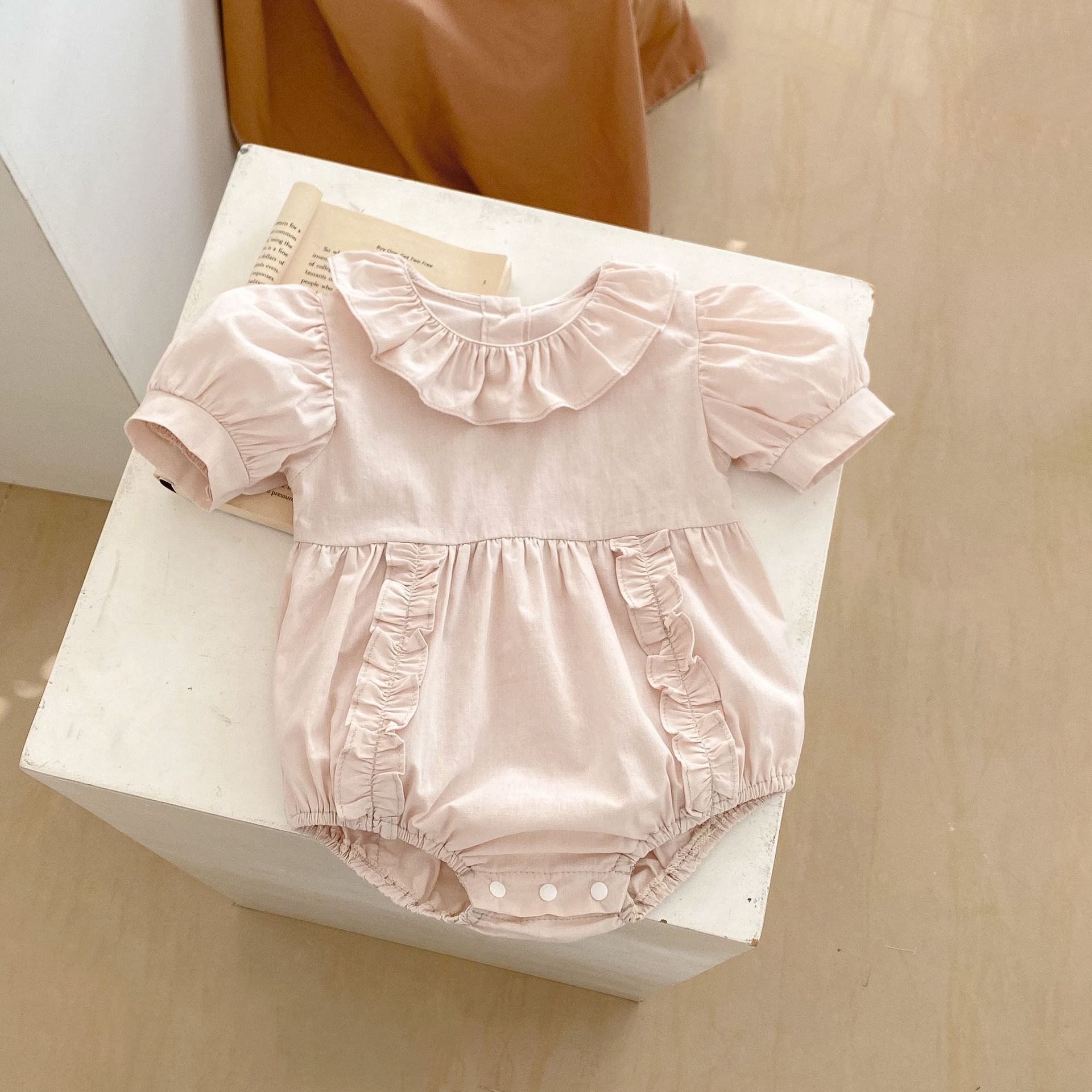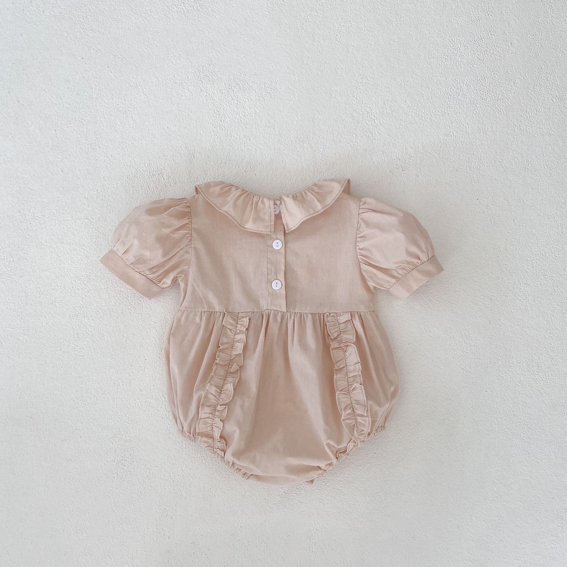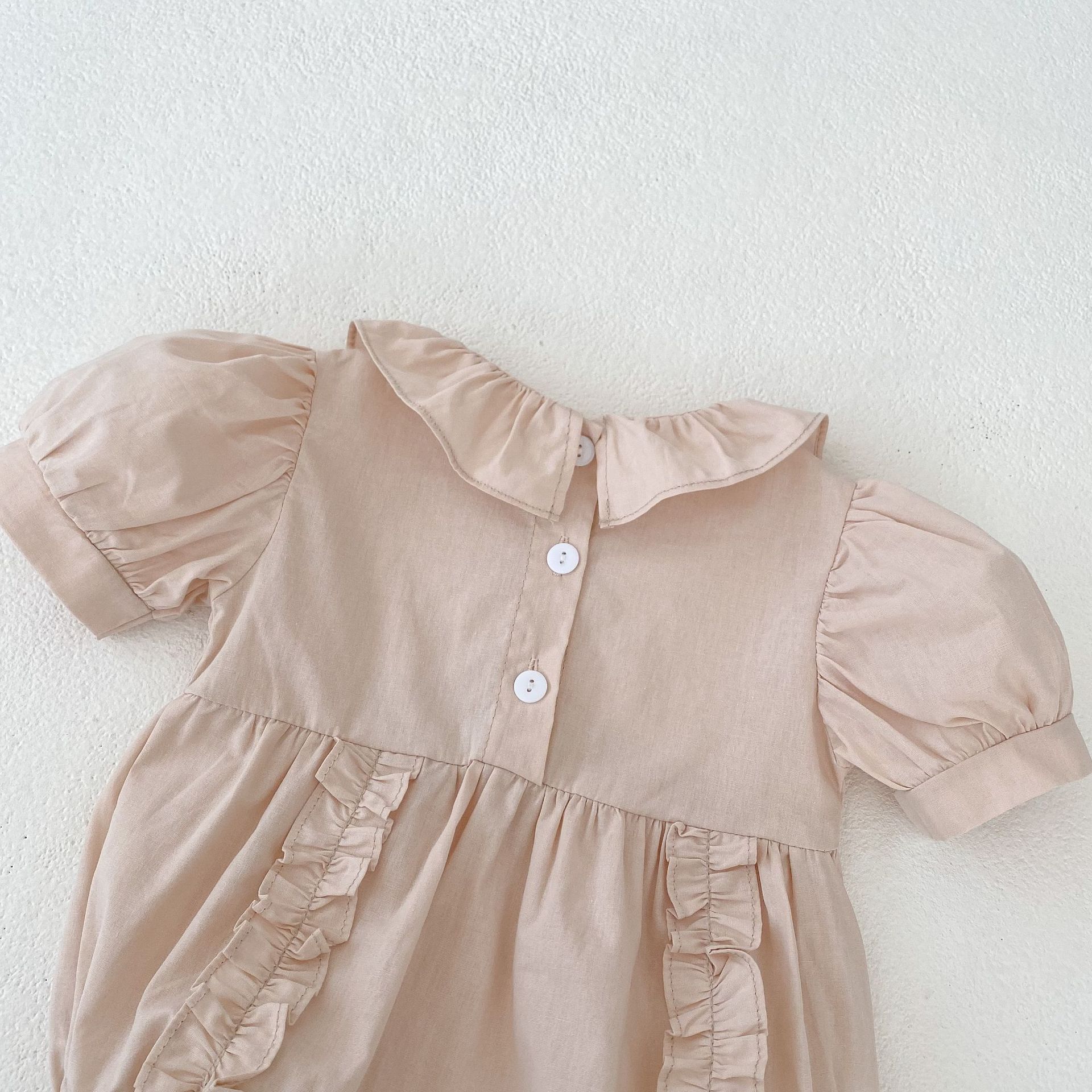 국경 간 아기 옷 2024 여름 순수한면 퍼프 소매 나무 귀 아기 소녀 롬퍼 원피스 칼집