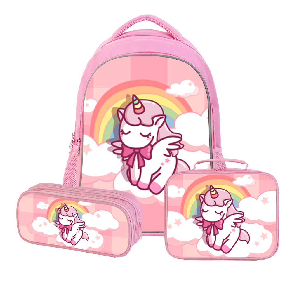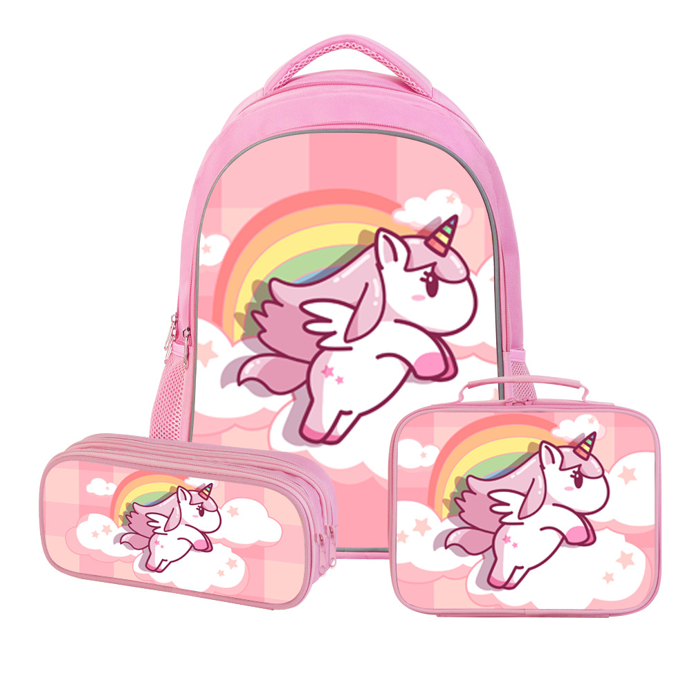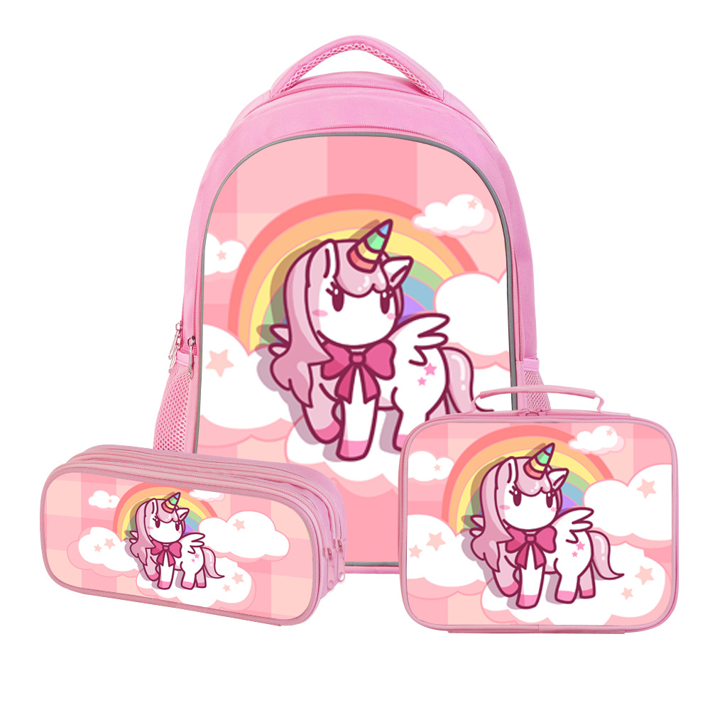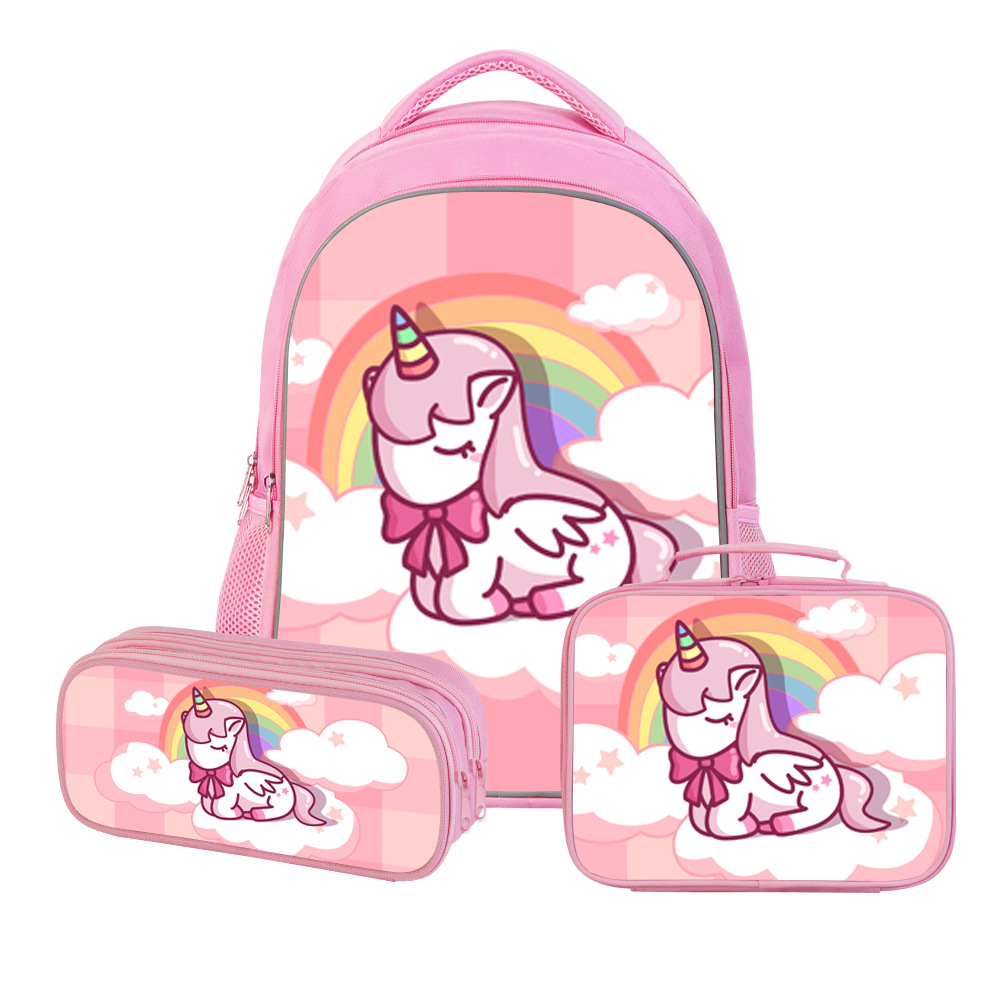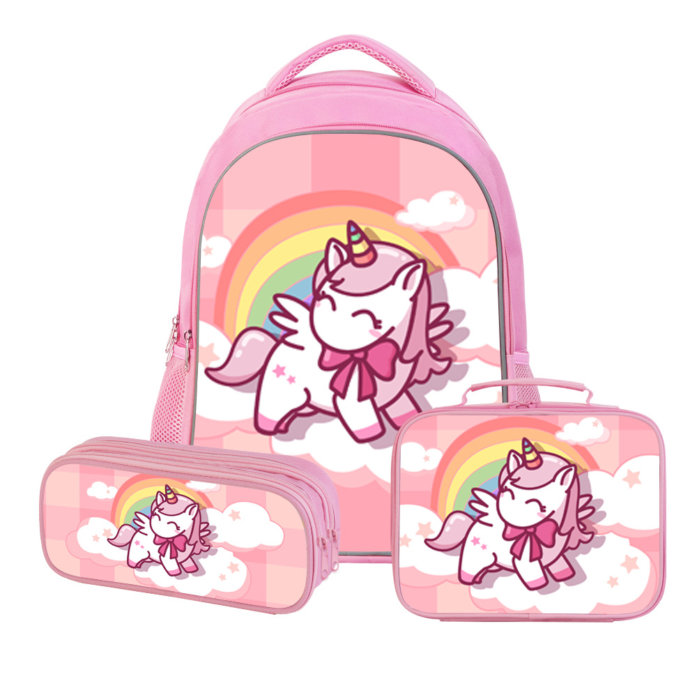 跨境新品独角兽儿童背包三件套中小学生书包双层铅笔盒动漫午餐包